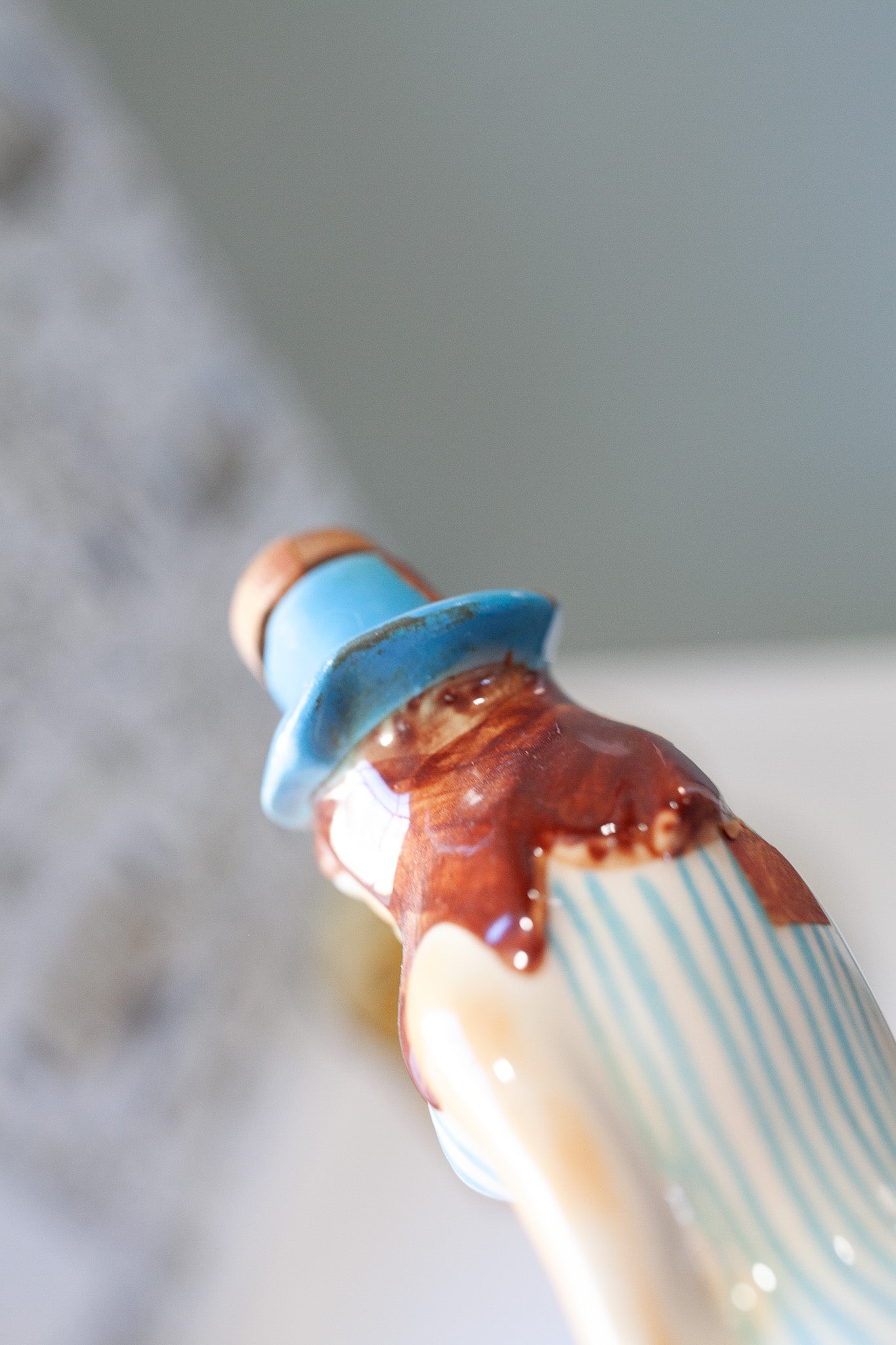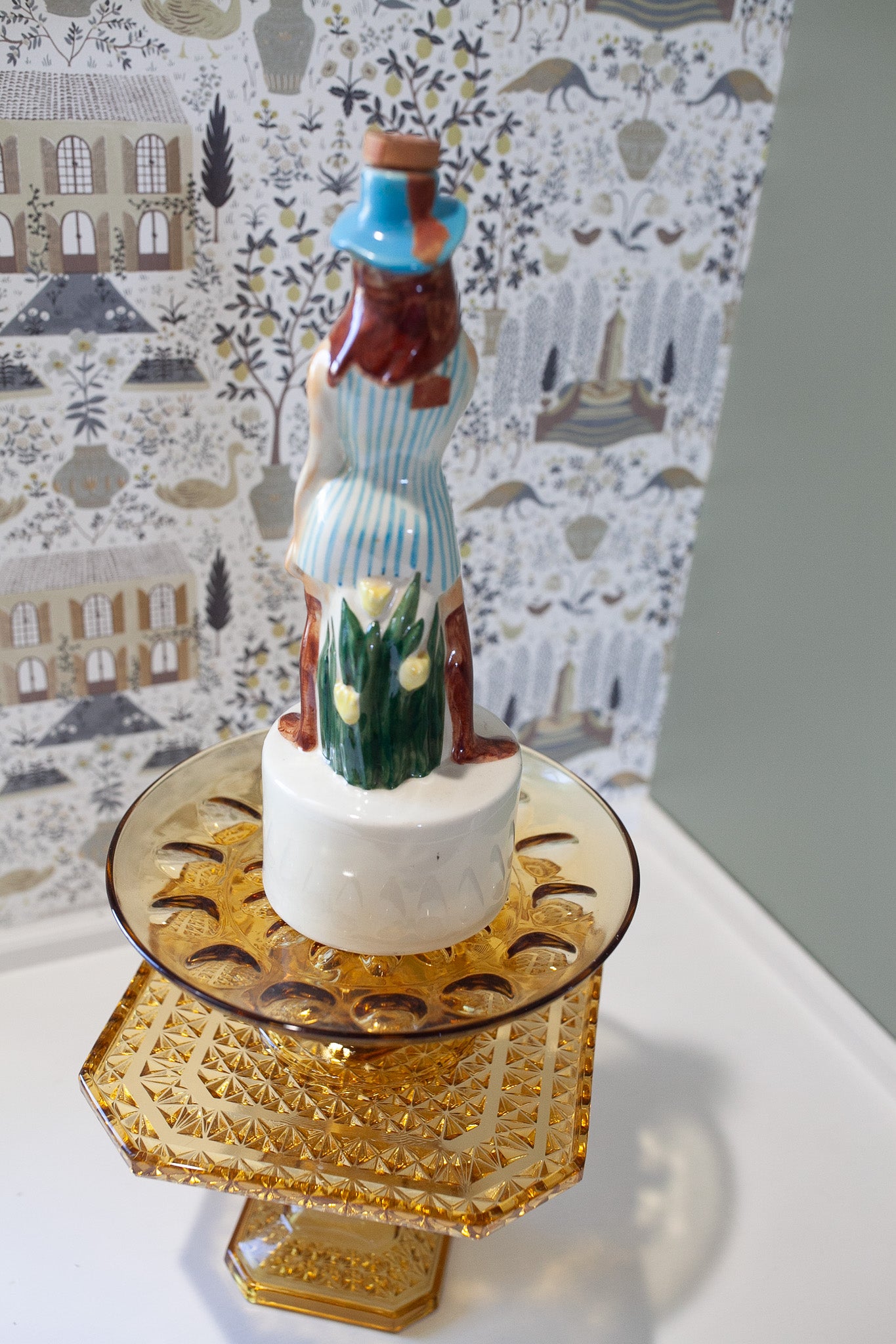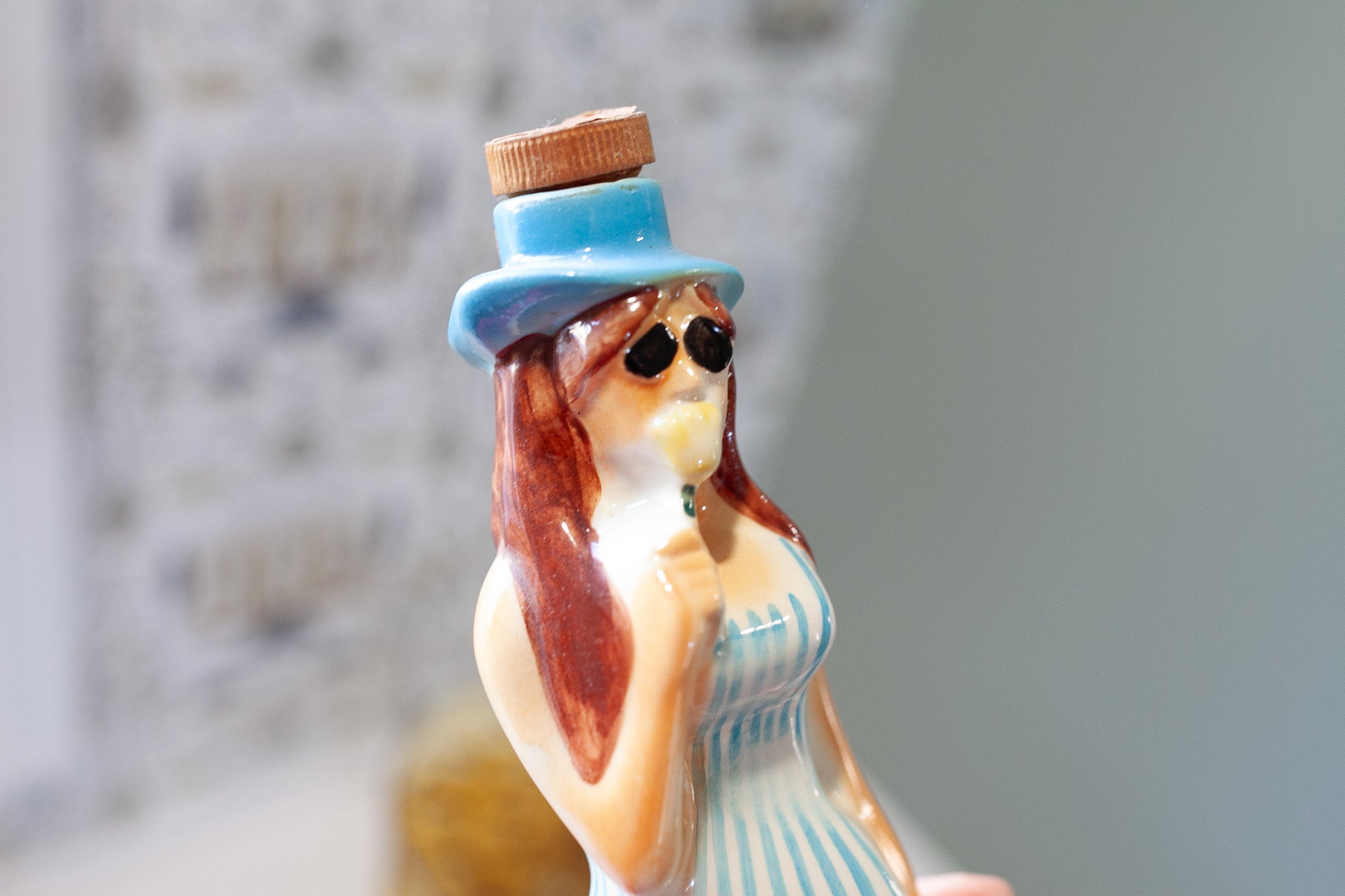 This awesome vintage 1960s Royal Enfield porcelain 'Flower Child' hippie girl liquor bottle would be great to use it for storing you liquors in your bar. You can also use it for a display piece in your bar area. This bottle is made out of Porcelain. It is a hippie girl holding flowers and wearing a striped dress with a hat standing on a white base. The white base says "Flower Child. The makers mark on the bottom says "Royal Enfield Porcelain Liquor Bottle 185 1968. Overall, a very nice vintage bottle in great condition. Sold empty.