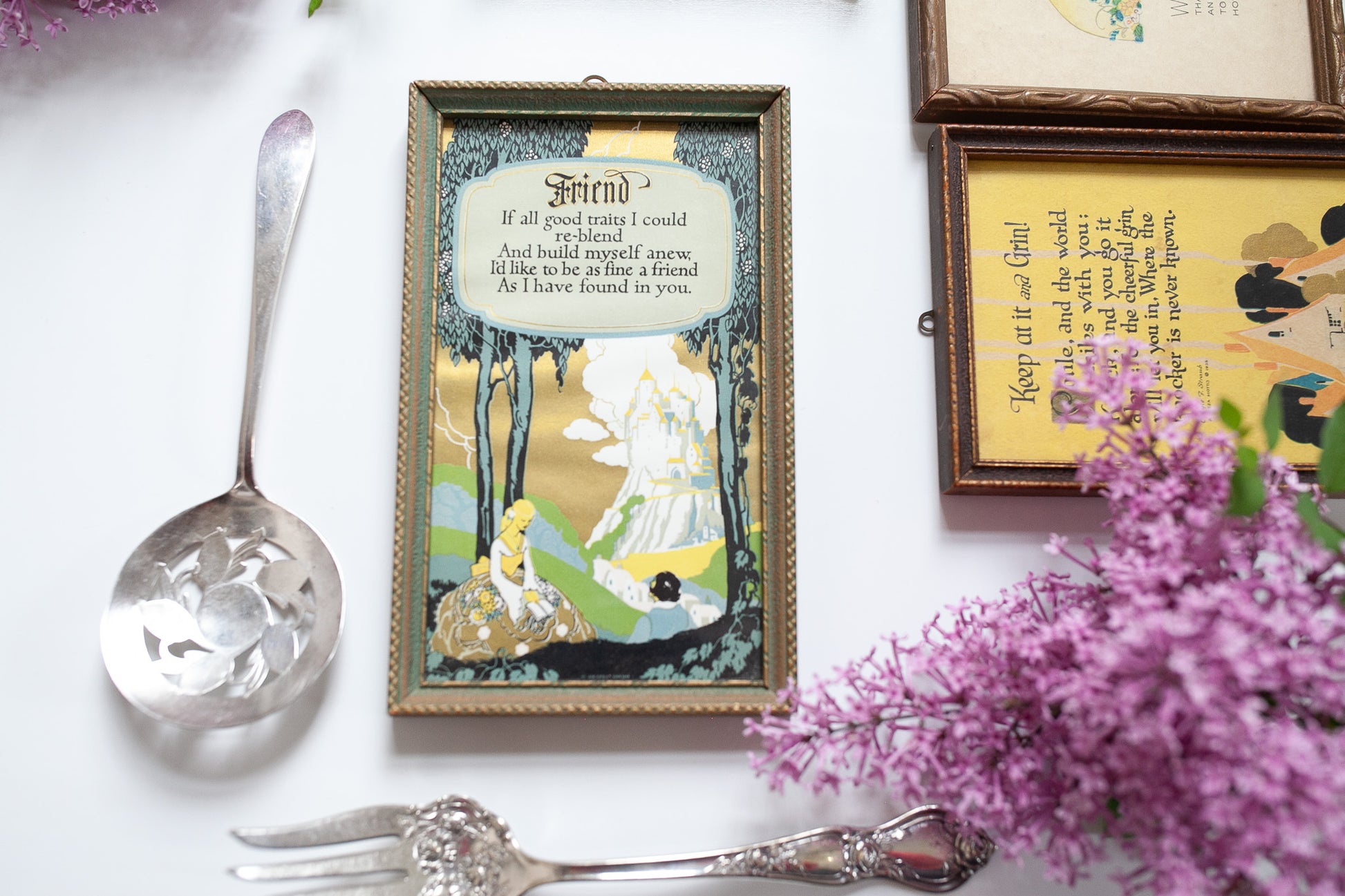 This is a gorgeous vintage framed print by Buckbee-Brehm, likely from the 1920s, featuring a poem titled "Friend." The poem reads: "If all good traits I could re-blend And build myself anew I'd like to be as fine a friend As I have found in you." The print has an art deco style, with gold embellishments and a scene depicting a person sitting near a tree, possibly within a castle setting. Buckbee-Brehm was known for producing these types of framed motto prints, often given as gifts.