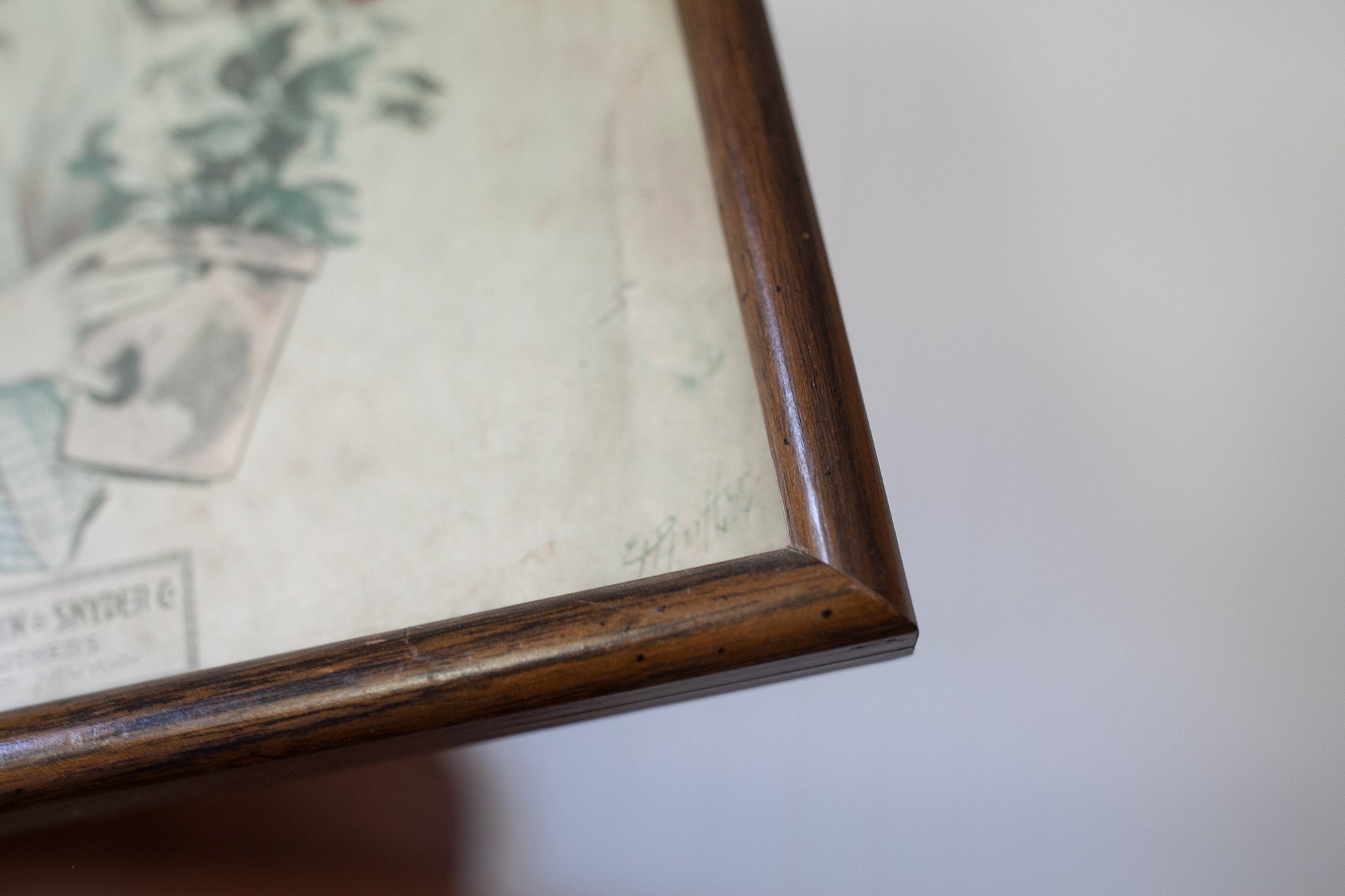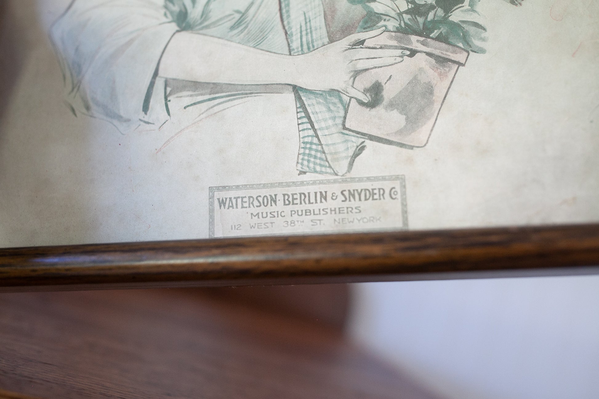 This is a fun print - I believe it was the cover of some sheet music that has been framed. It is framed under glass with a wood frame. It is about 14.5"x11.5" in size.