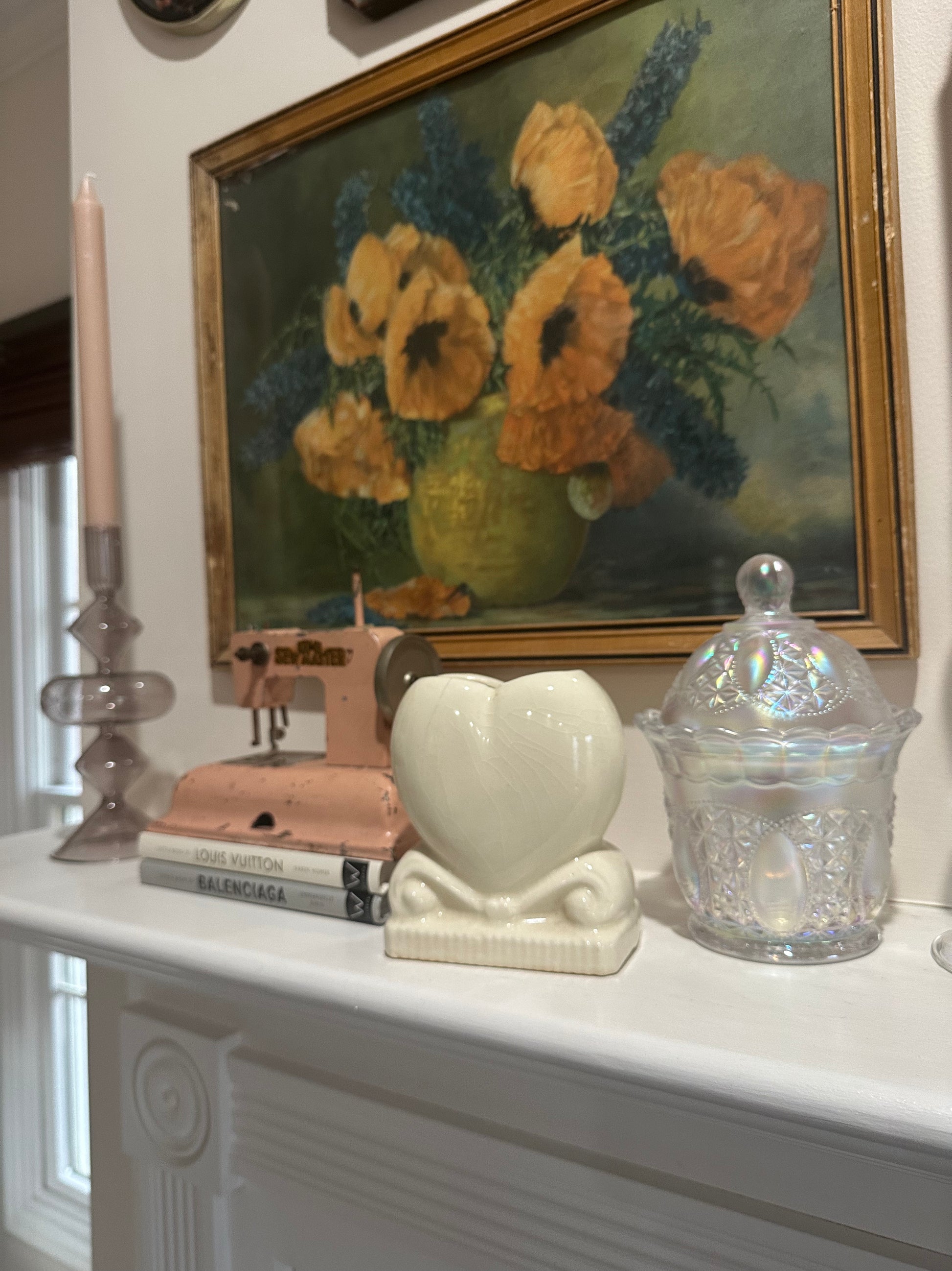 This beautiful vase is an off white pottery heart. It is about 5” by 4”. No chips, but some crazing throughout.