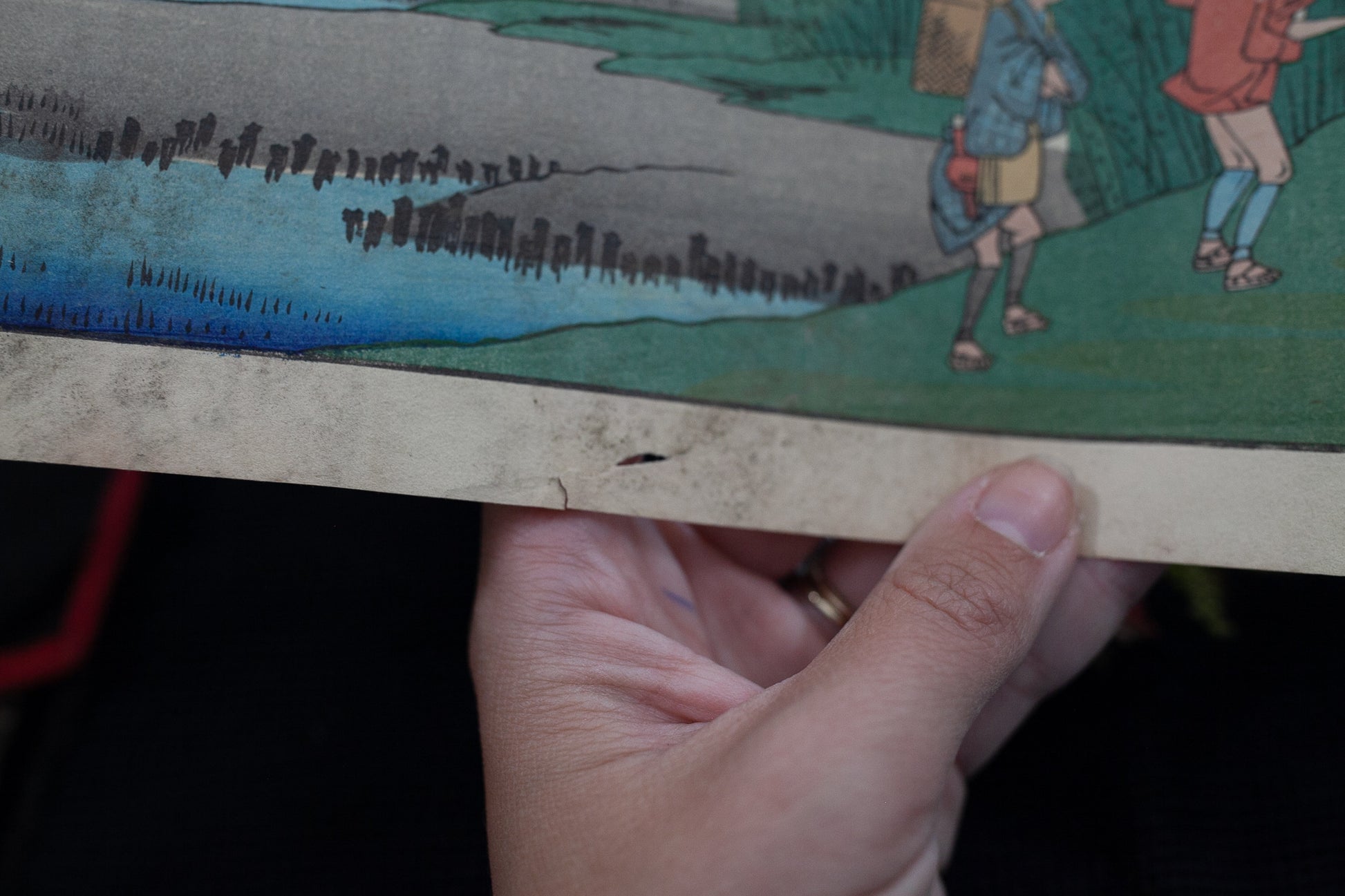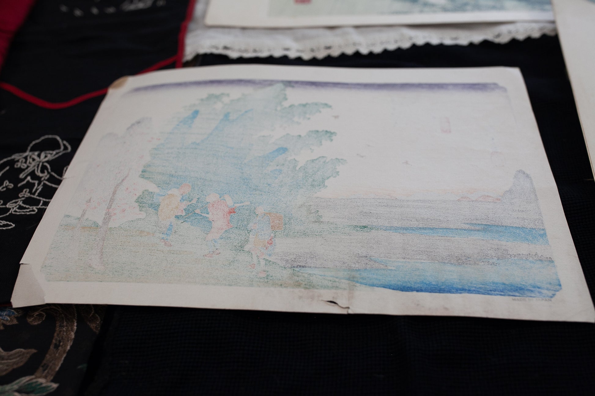 The print measures 15"x10.25" in size and has three small rips in the margin on the right side, one rip on the lower bottom margin, and the corners are not perfectly straight. There is some dirt or something that has gotten on the print on the lower edge extending up into the lower portion of the water.This is a paper print. It would look great with a mat around the printed portion and framed.
