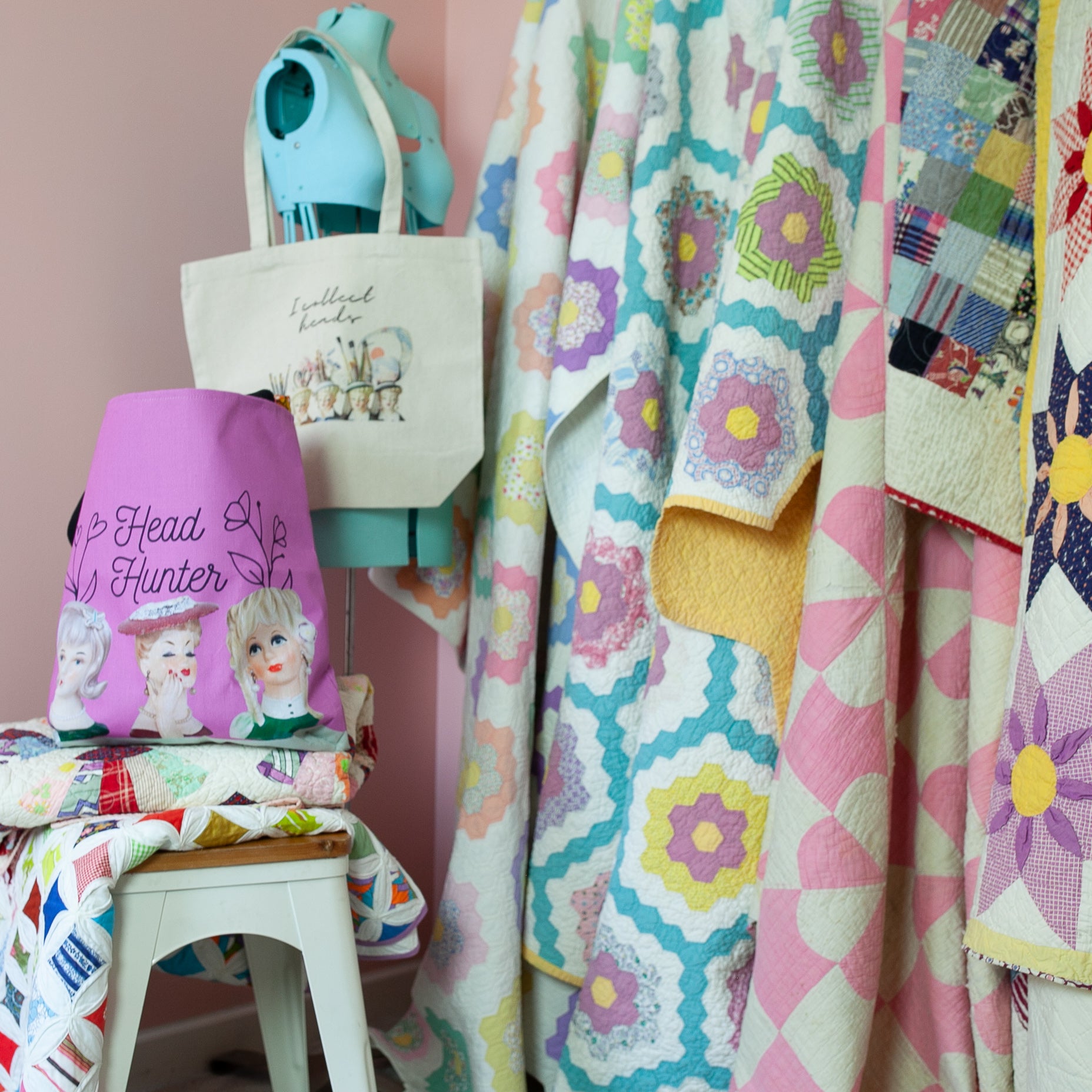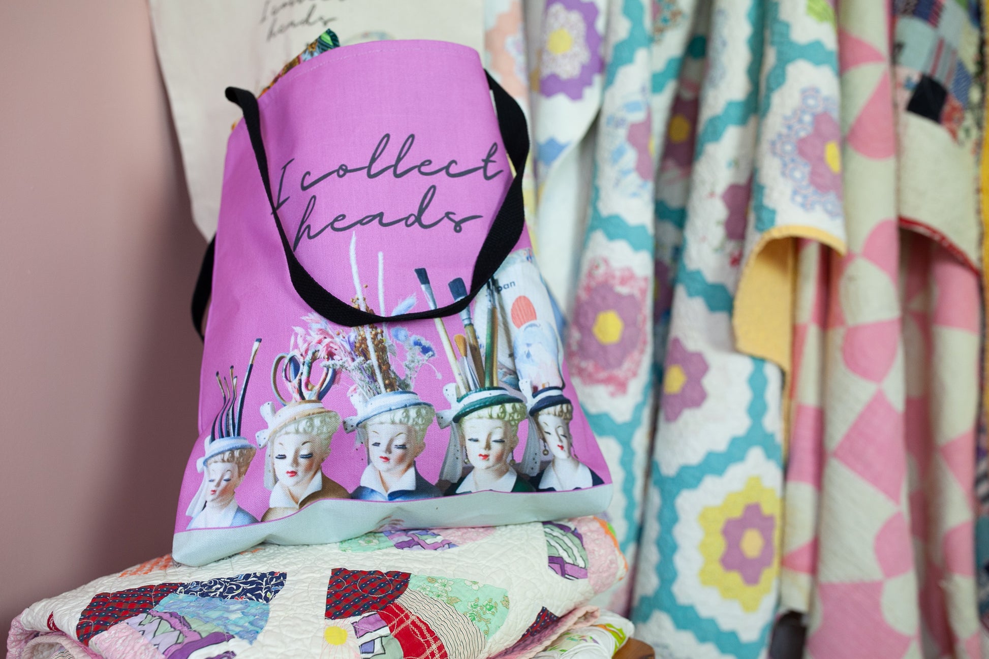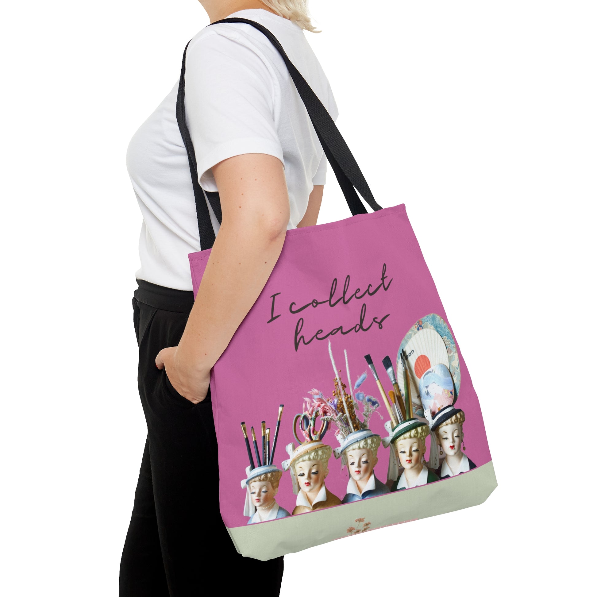 This tote bag is a fun one to show off your love of head vases! Perfect for a friend who loves these ladies! Two different pictures on one bag! One side says I collect heads! and the other side says Head Hunter.  I designed this one using my collection of real vintage head vases! It is pink with black handles and has XO, The AntiqueHer on the bottom of the tote bag! Enjoy this fun retro bag!! Please note this will ship to you from the printer and will arrive separate from other items if you order multiple pieces from my shop. It ships direct from a partner printer so it can not be rush shipped or gift wrapped. The colors can vary a bit based on computer screens.