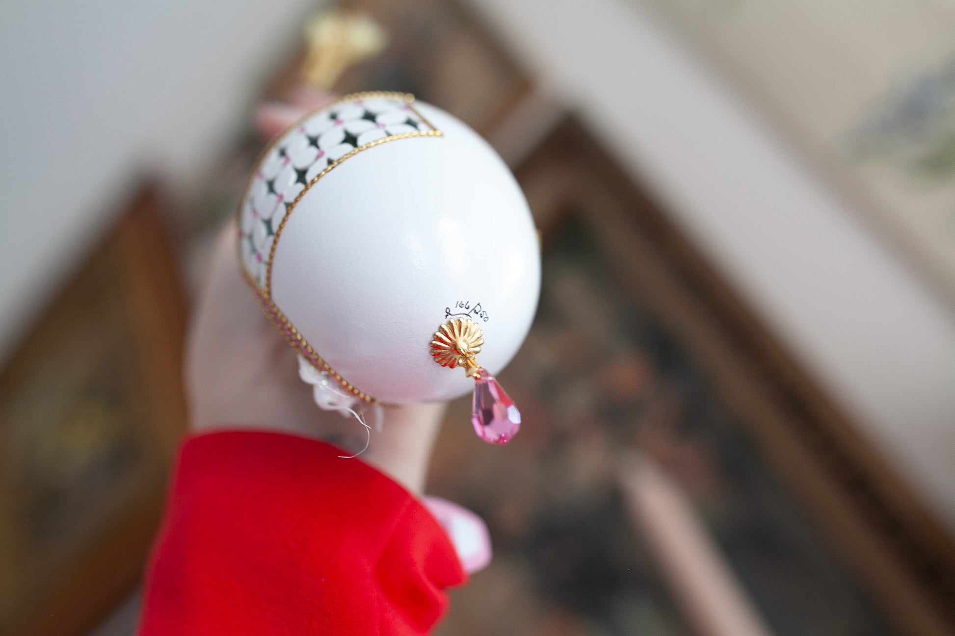 This egg has two little doves inside nestled together. This ornament has pretty little tiny pink gems around the egg. It has a really pretty pink gem hanging from the base of the egg and a little gem at the top too. It is such a delicate and beautiful piece. It was a limited release of 250 and this one is labeled as 166/250 it is about 4". It hangs about 7" long with the ribbon. It has the original box with it.