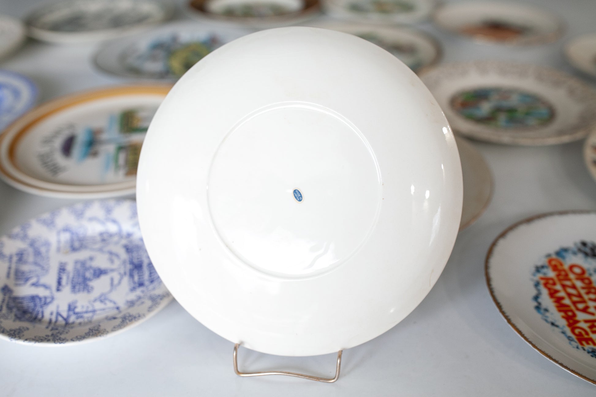 This pretty plate says Meramec Caverns Virgin Mary Stanton, MO. On it. There is a pretty blue floral border around the edges. It is about 9" in diameter. No chips or cracks, but there is some crazing and some blue has smudged under the glaze.
