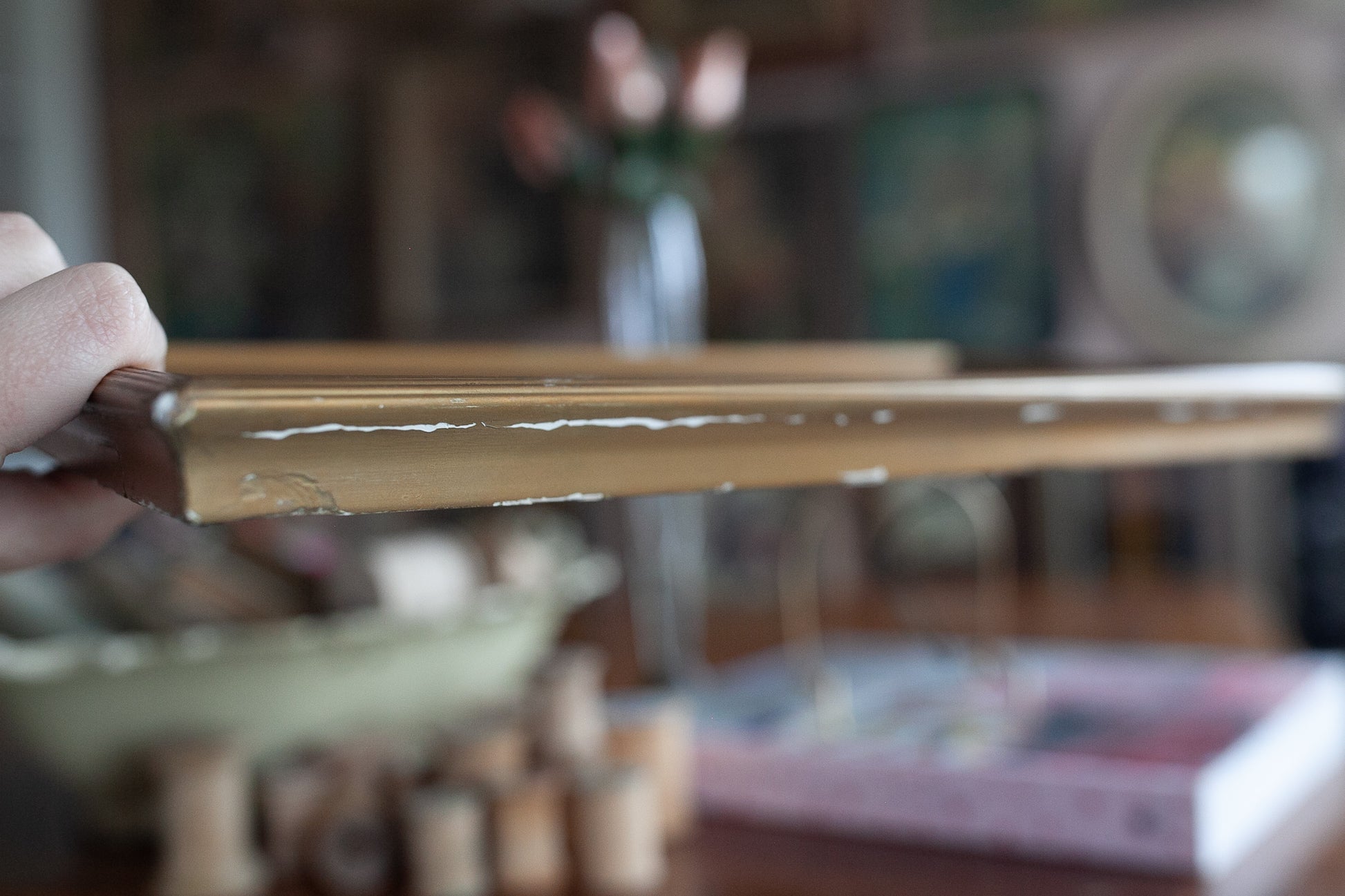 13"x6" Framed Artwork - Woman holding a baby- Mother and Child print with a signature at the base. The frame is gold and has some wear on it. The frame has a wire on the back.