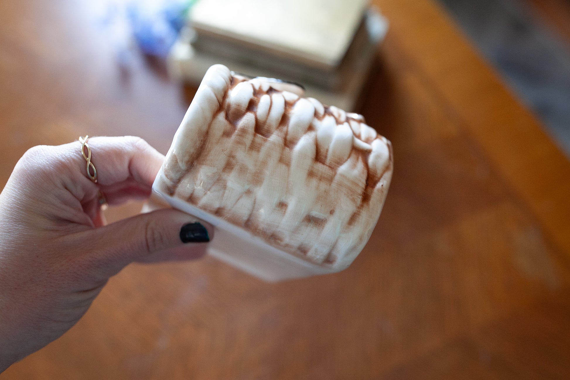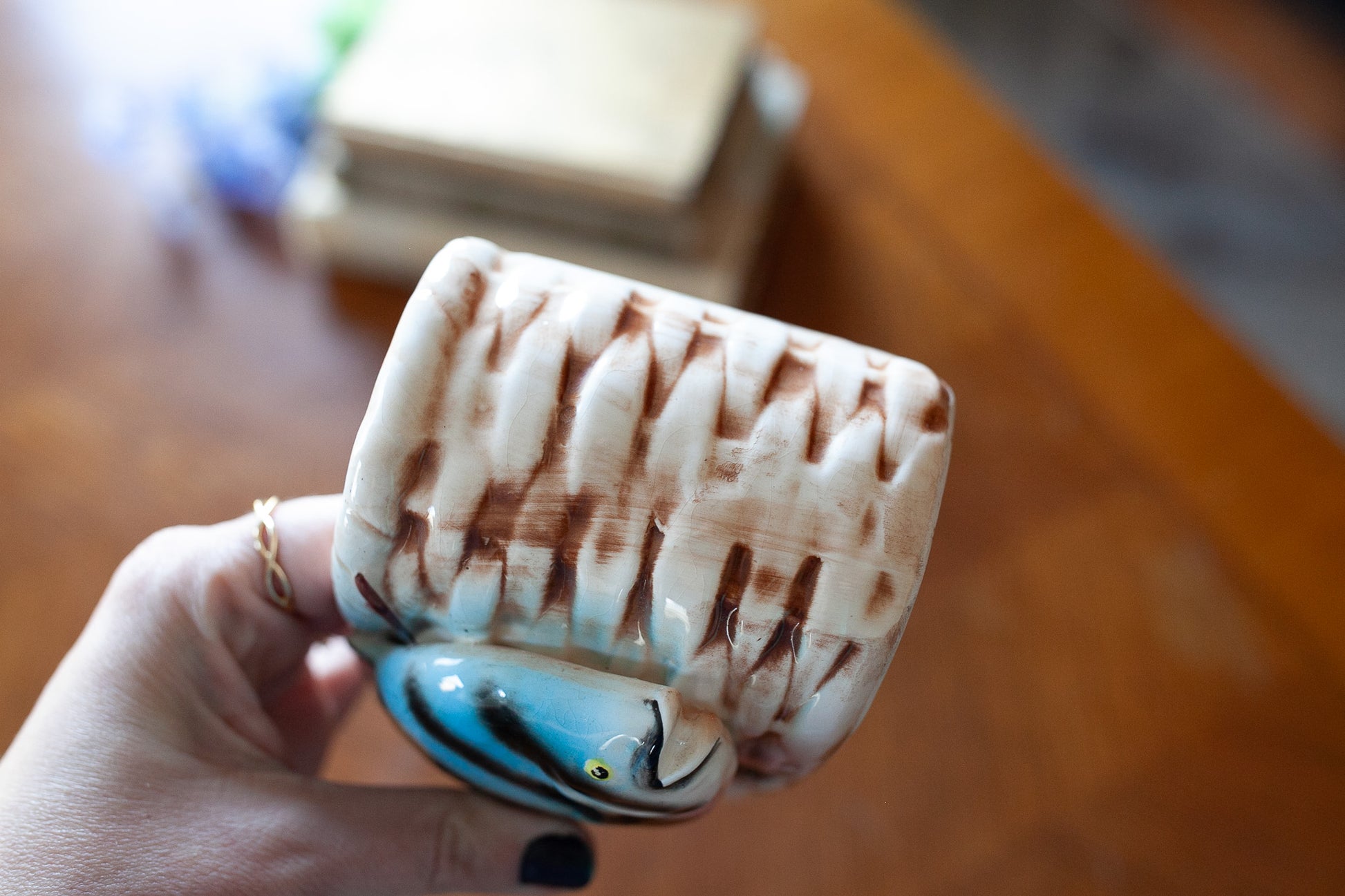 This cute planter is perfect for the fishing cabin or nautical themed room! It is so cute with a cluster of dried flowers or maybe it can hold your pens on a desk! It is about 5.5" wide and about 3.75" tall. It has some crazing, but no chips or cracks.