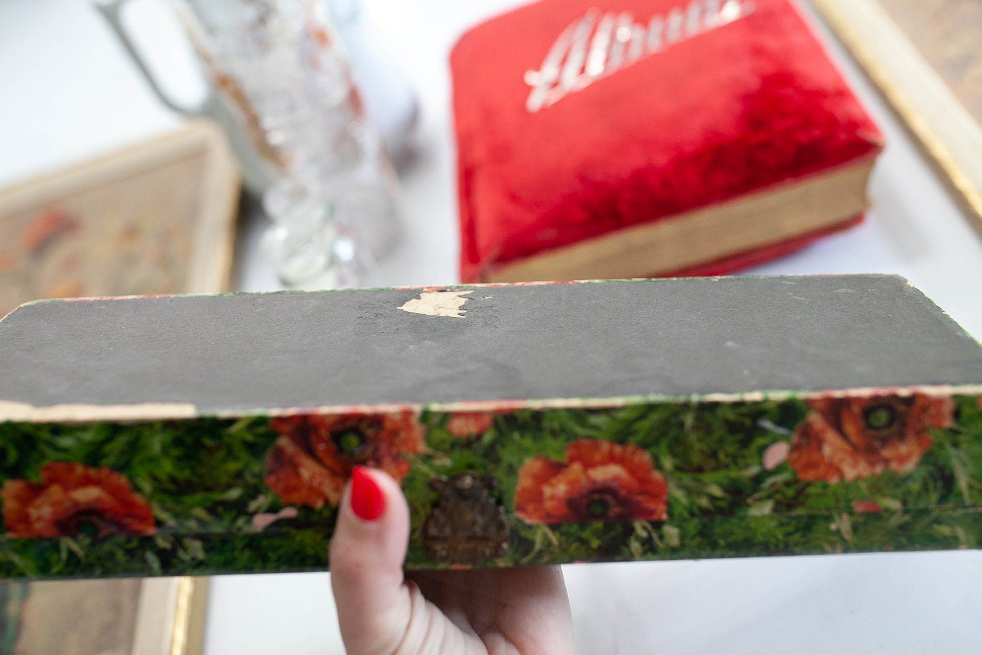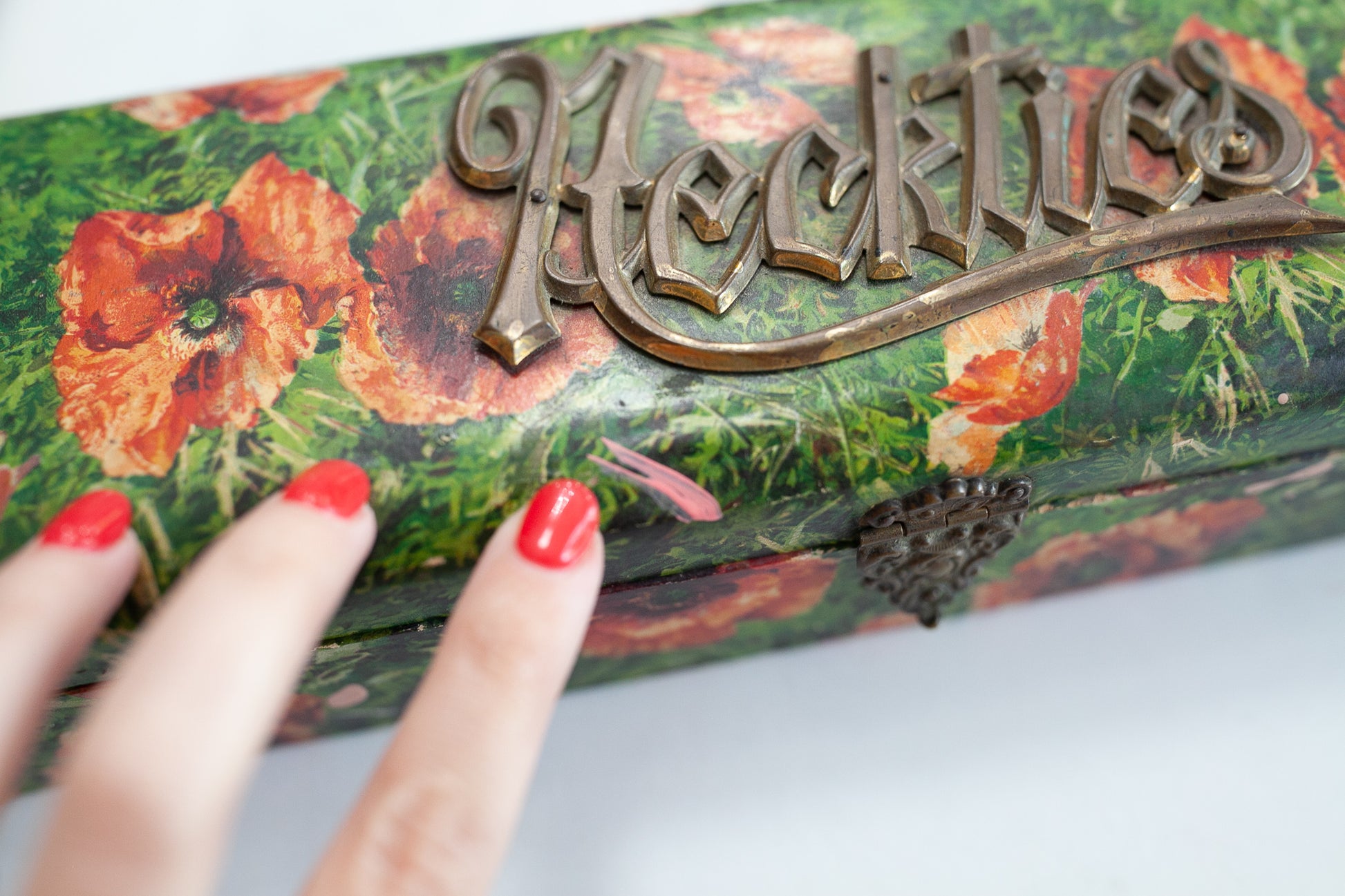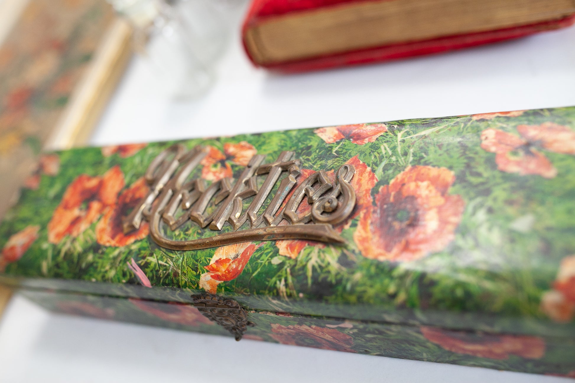This box is a floral paper covered Neckties box- it is hinged on the back and has a clasp on the front. The script is a thin brass material. The box has a fabric liner inside. It has some wear to the edges and some small rips in the paper, but is still such a beautiful piece. 13" long by 2.5" tall approx.It has 3 spots of paint on the box paper see all photos.