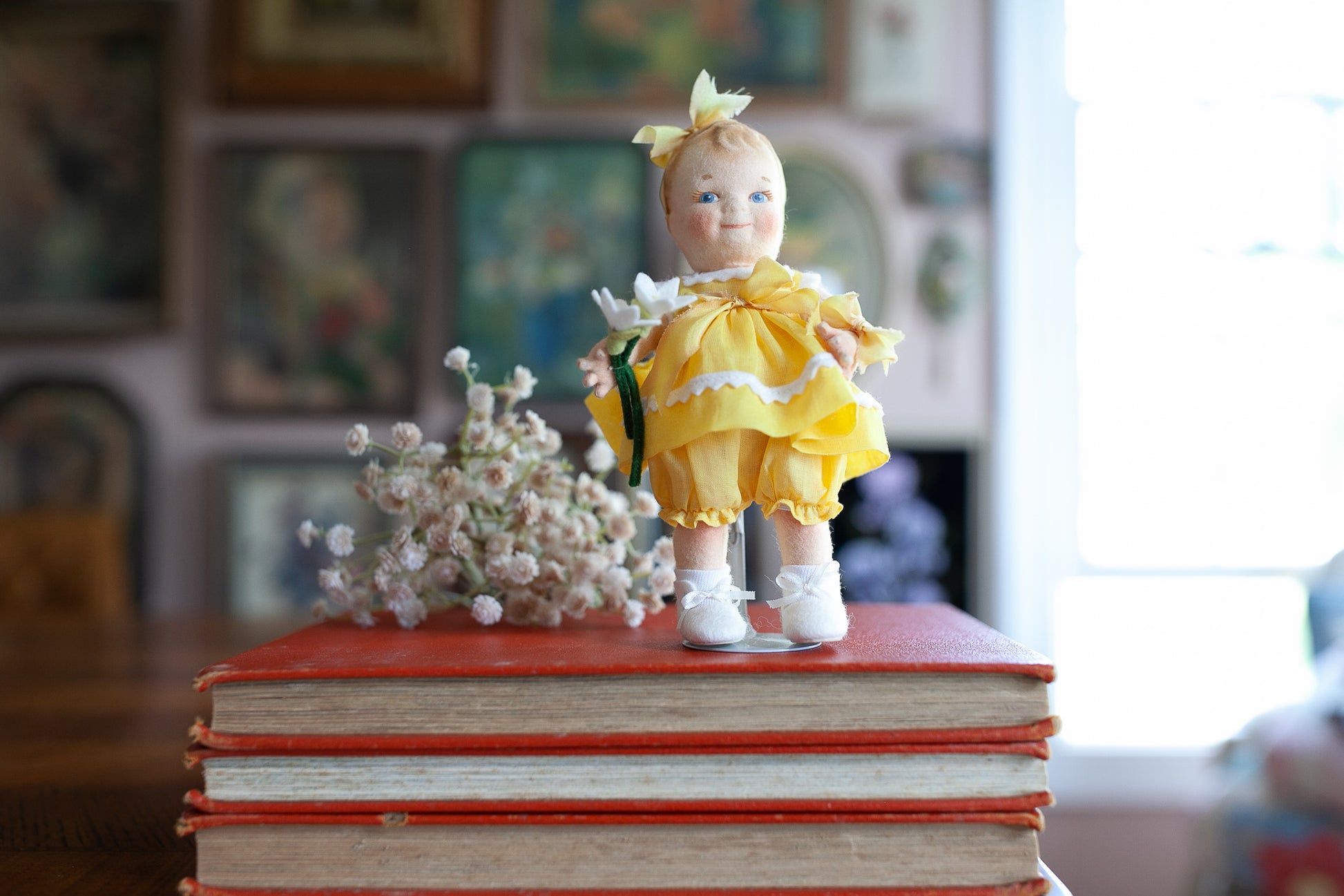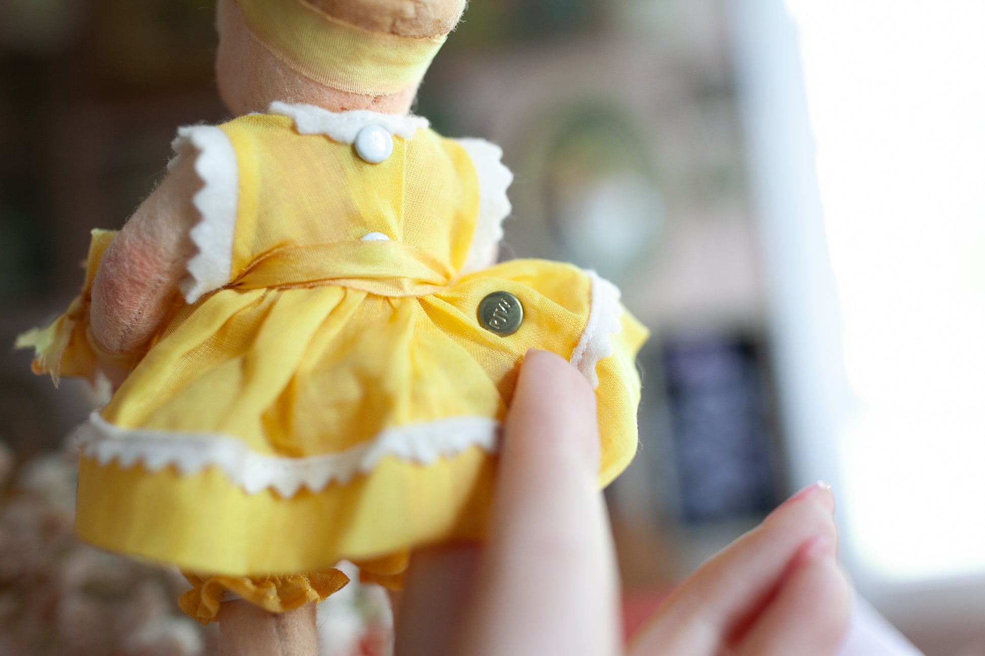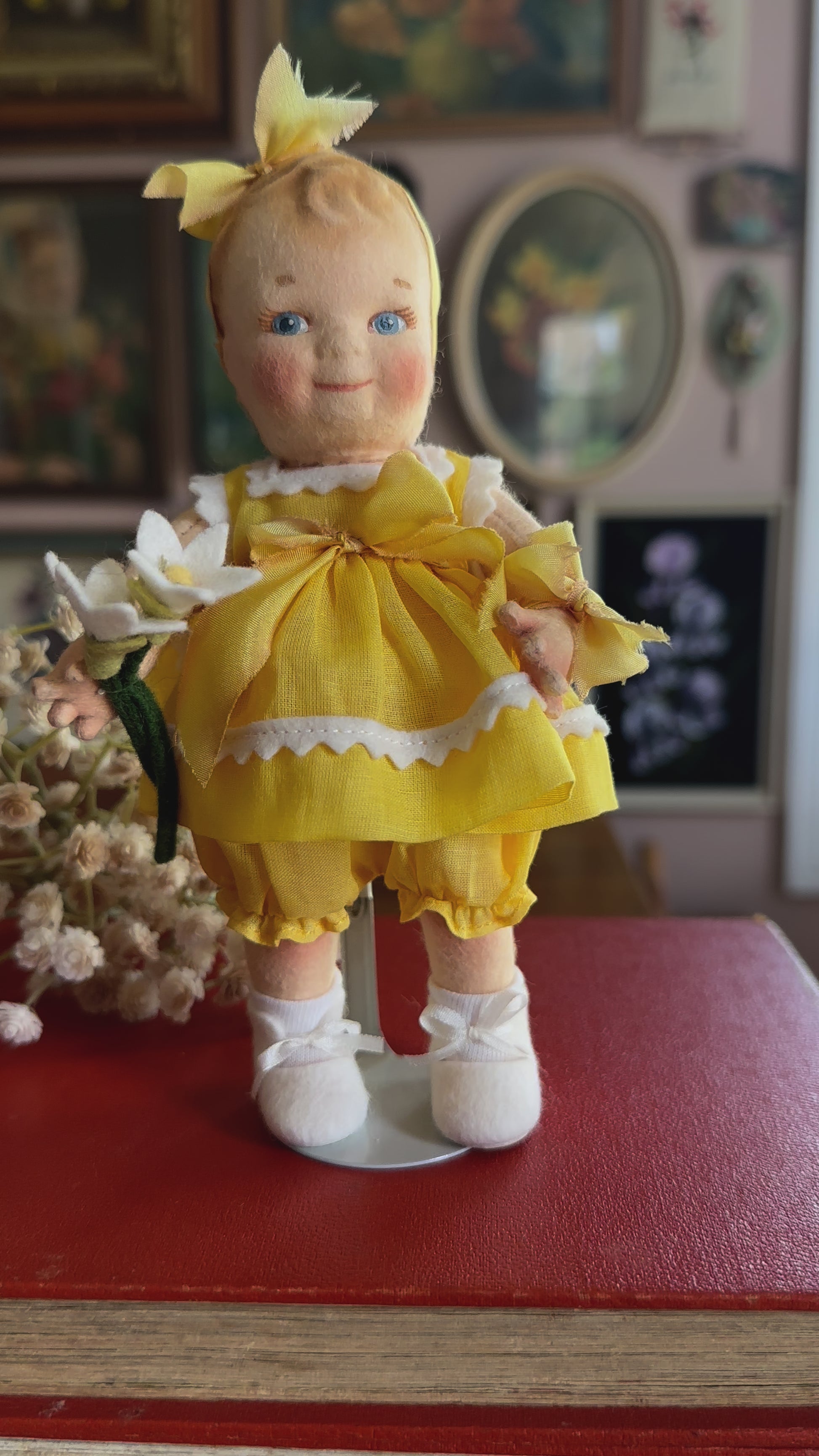 This sweet doll is a felt doll modeled after Sunshine Scootles! Isn't she darling?! She is about 6.75" tall. She has flowers in her hand, bright blue eyes, bows on her shoes, her head and her dress. She has the RJW brass tag on the back of her dress.