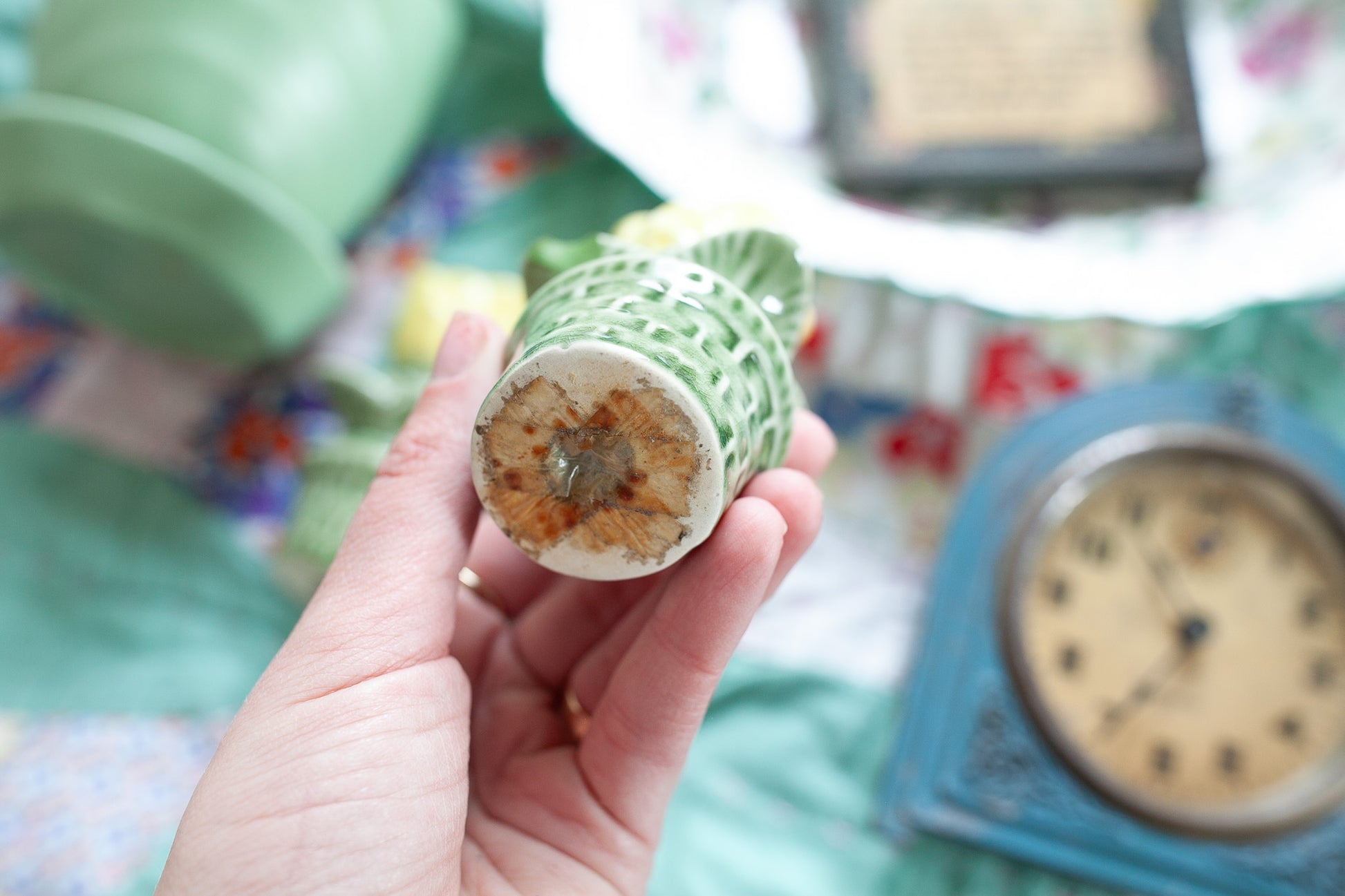 This set of two shakers are so sweet! They are pottery flowers that are yellow with a green base on both. 3.75" tall each- the one shaker has a chip in the leaf, but the chip has been painted to blend in. No stoppers remain in the base.