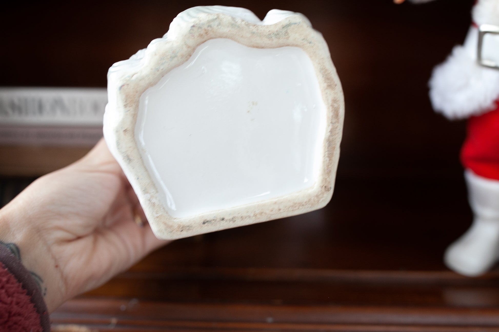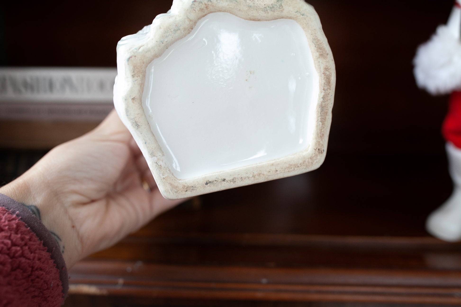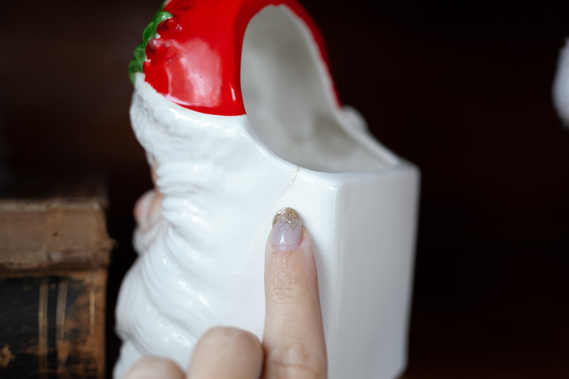 6.25" tall head Vase- Santa Head- This one is cold painted and has a few little spots of paint missing. There is a little fracture line on one side. This guy can be a great vase as is or fill him with a bunch of greenery and holly!