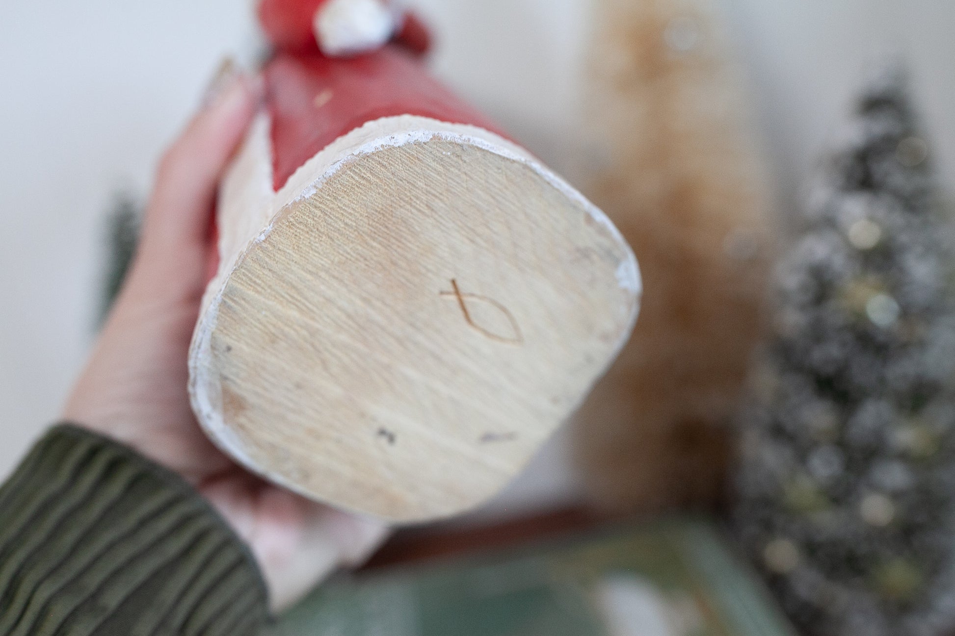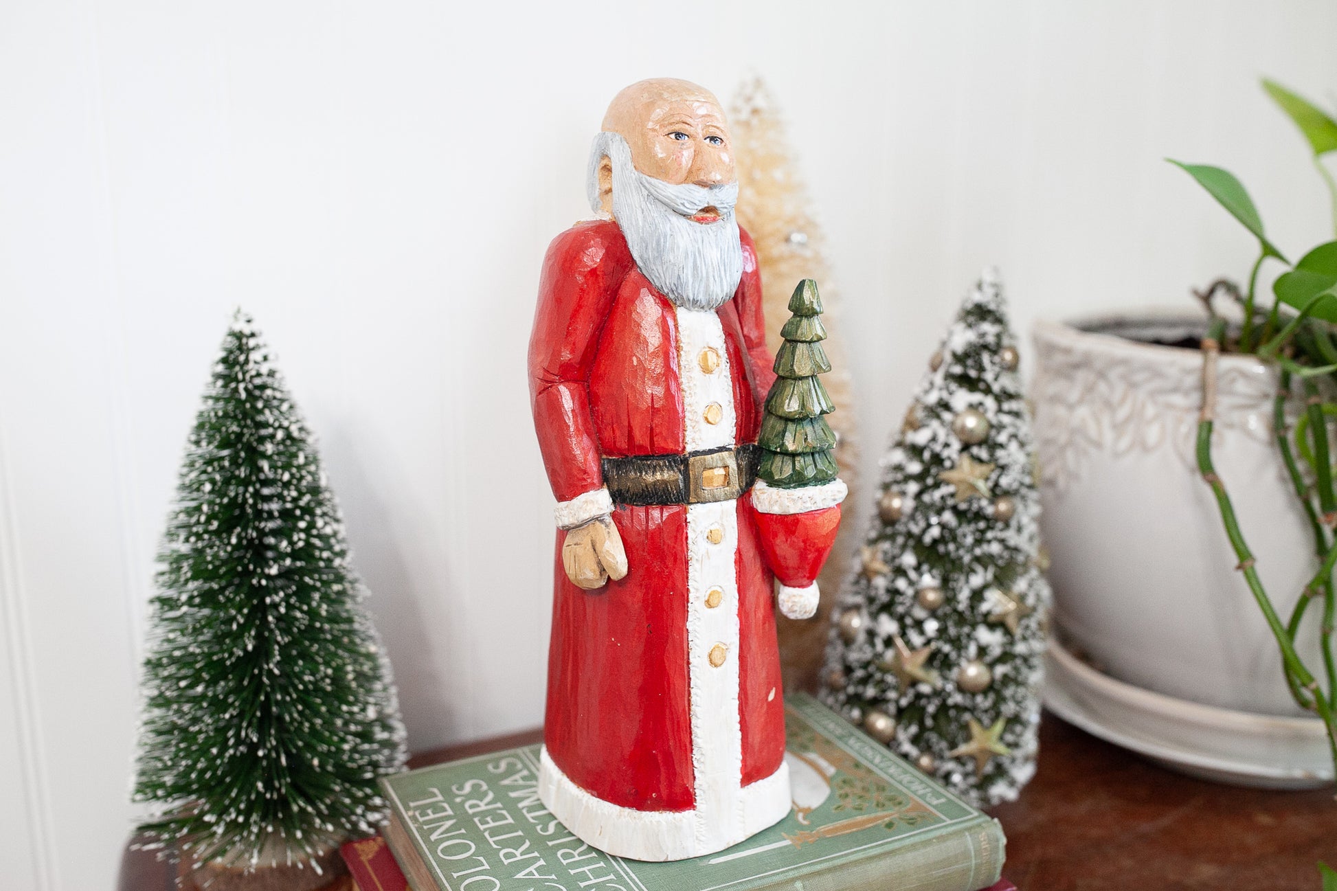 This vintage Santa is made of wood and is about 10.5" tall. He is painted and in good condition. He holds a little tree in his stocking hat. He has a few small imperfections in the paint, but mostly in good shape.