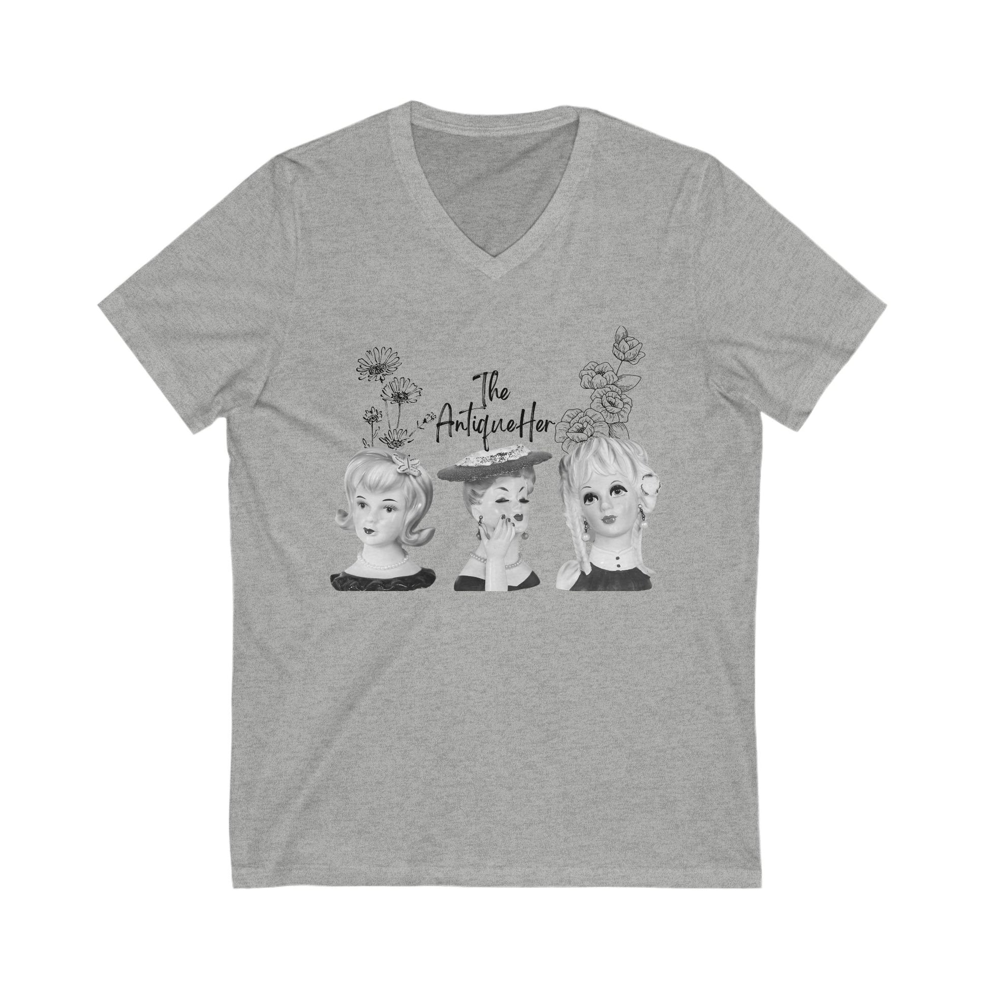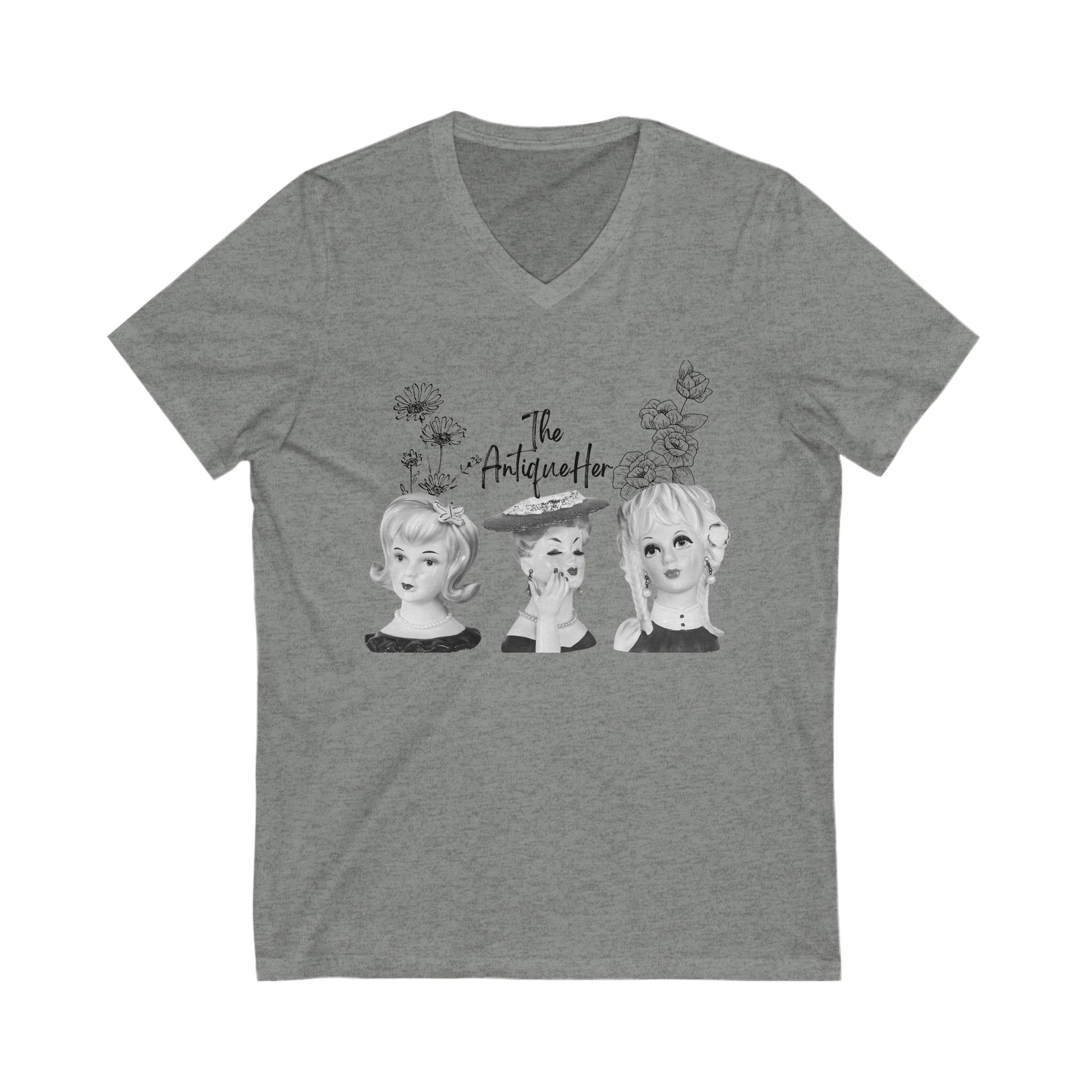 The AntiqueHer Shirt! Beautiful lady head vases and florals decorating a v- neck tee! This soft jersey tee is comfortable enough to wear all day long. The image was created by The AntiqueHer with vintage lady head vases. Perfect shirt for the antique, vintage, retro lover! Please do not iron directly on the image. Please note that this will ship directly from the printer and will ship separately if you order multiple items.