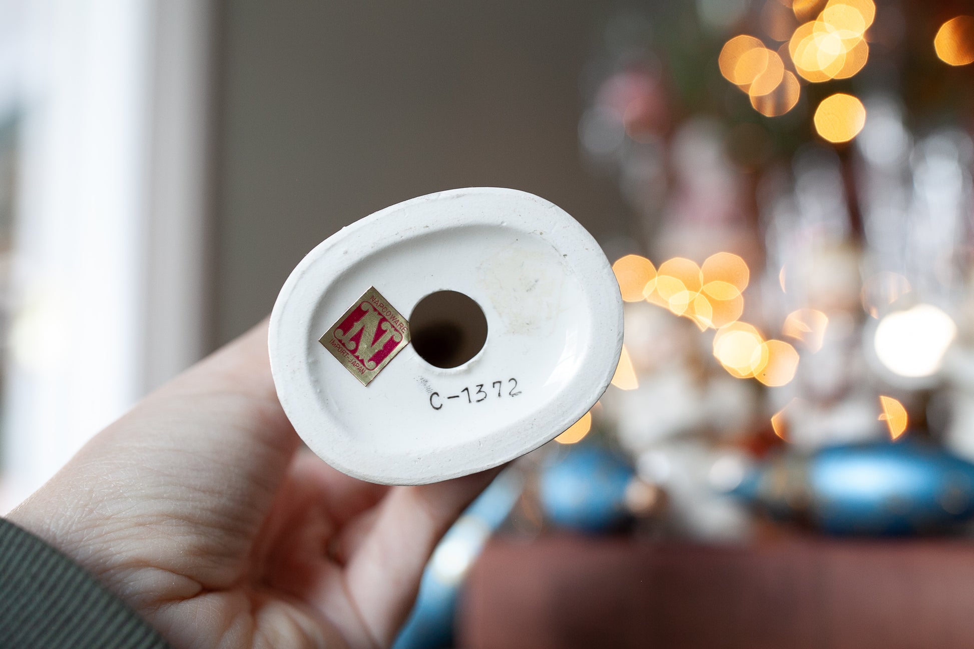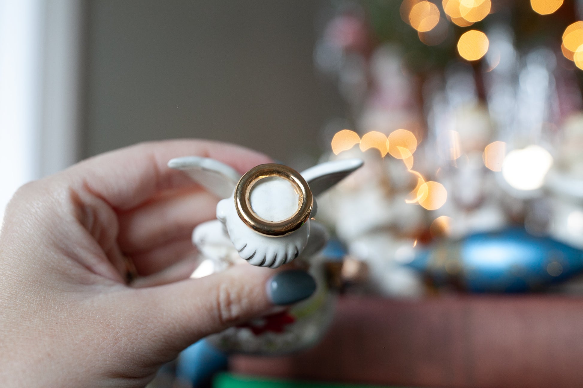 4.25" tall this is the December Angel by Napcoware- She has a red poinsettia on her dress and gold bells on the side as well as a touch of spaghetti detailing. She has some crazing, but no breaks or repairs.