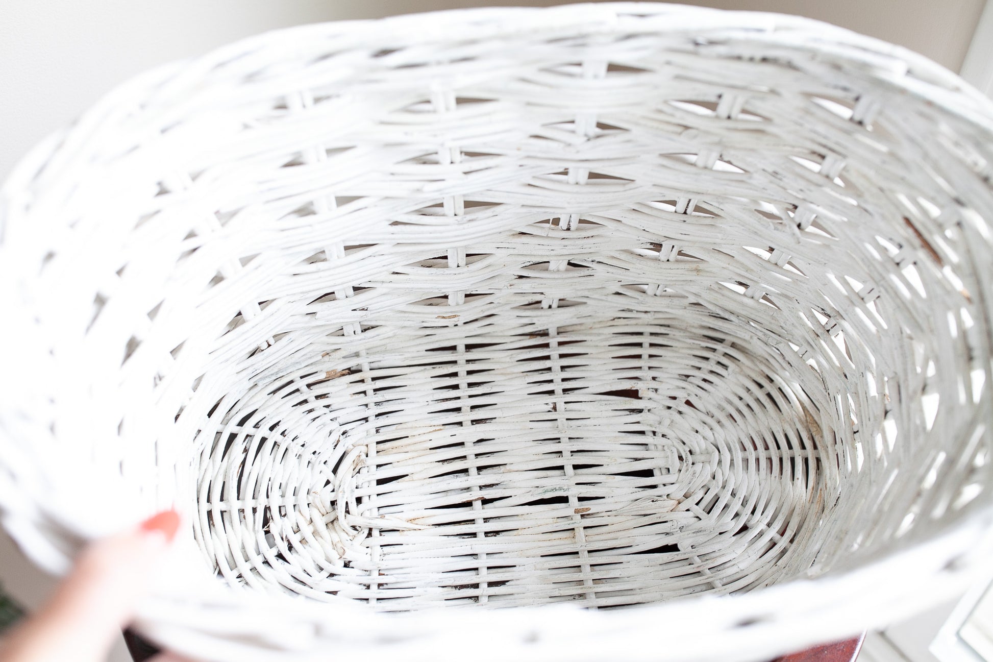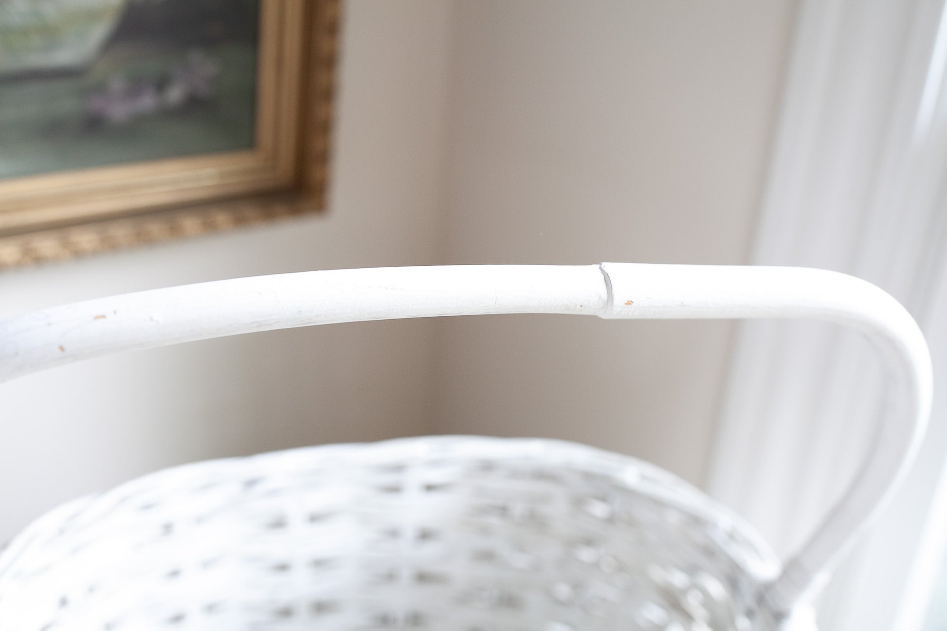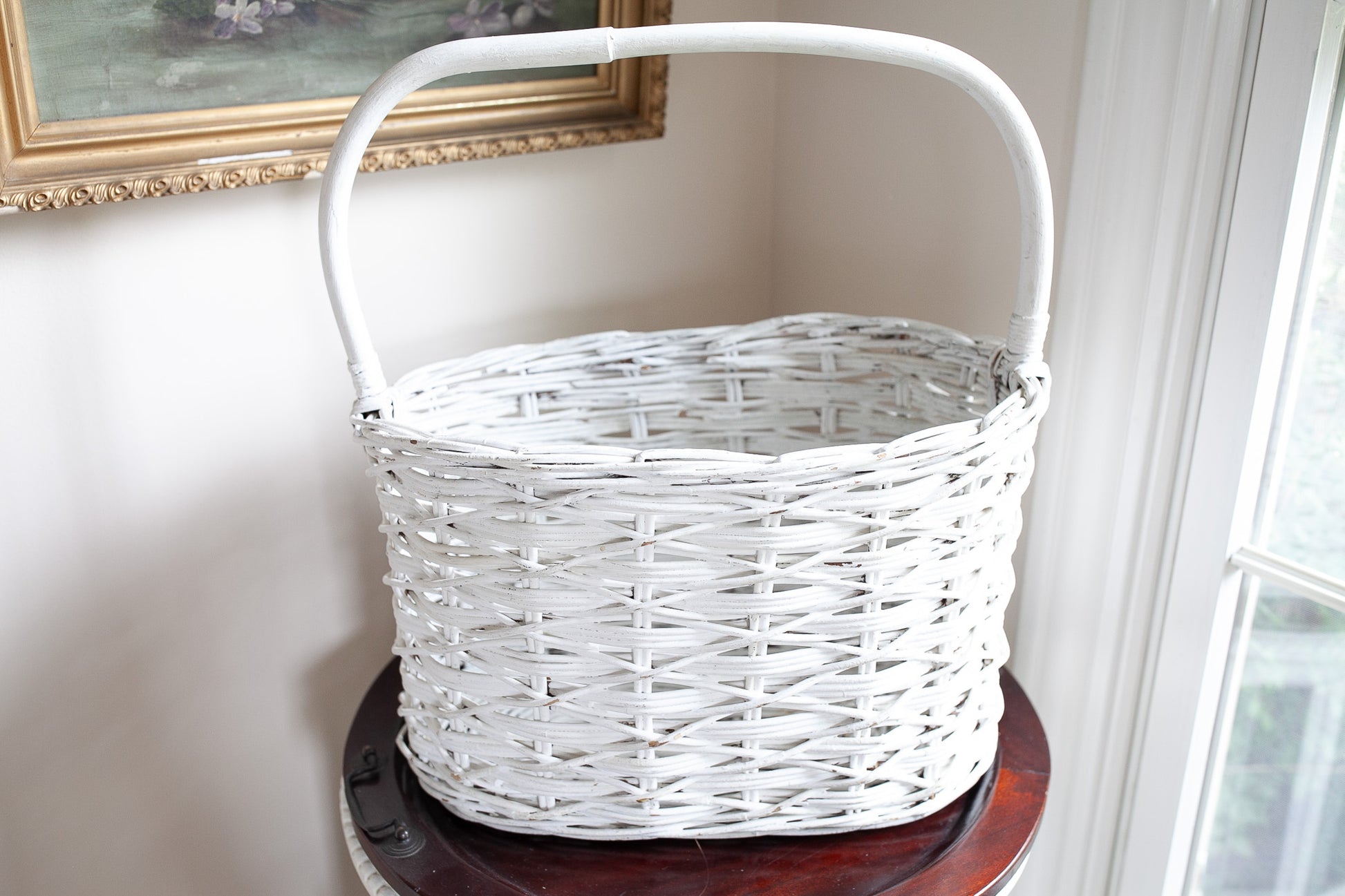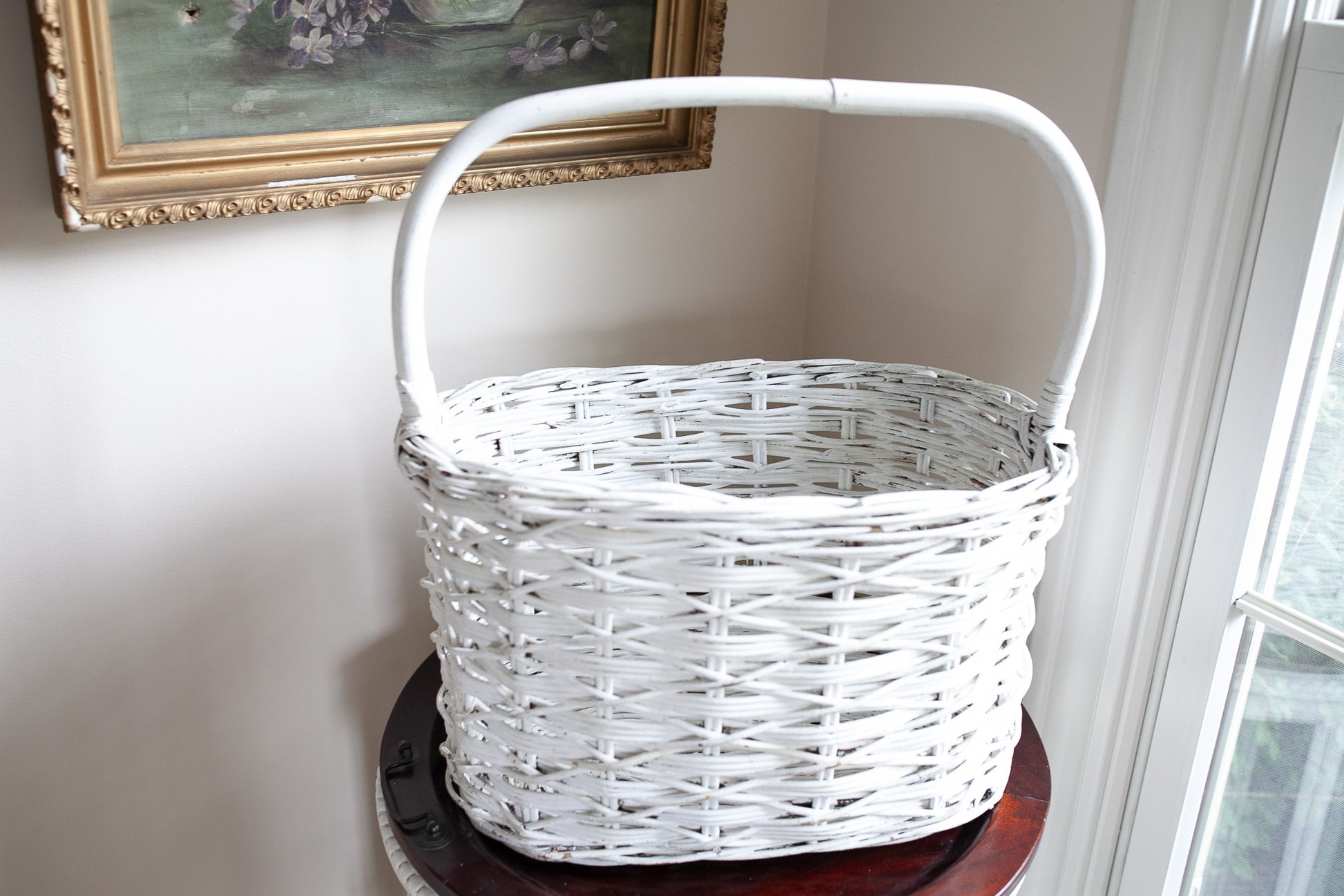This basket is fabulous for display! It has a handle that is stationary in the upright position. It is in good condition and useable! It is about 16.5" wide by 19" tall by 10" deep.