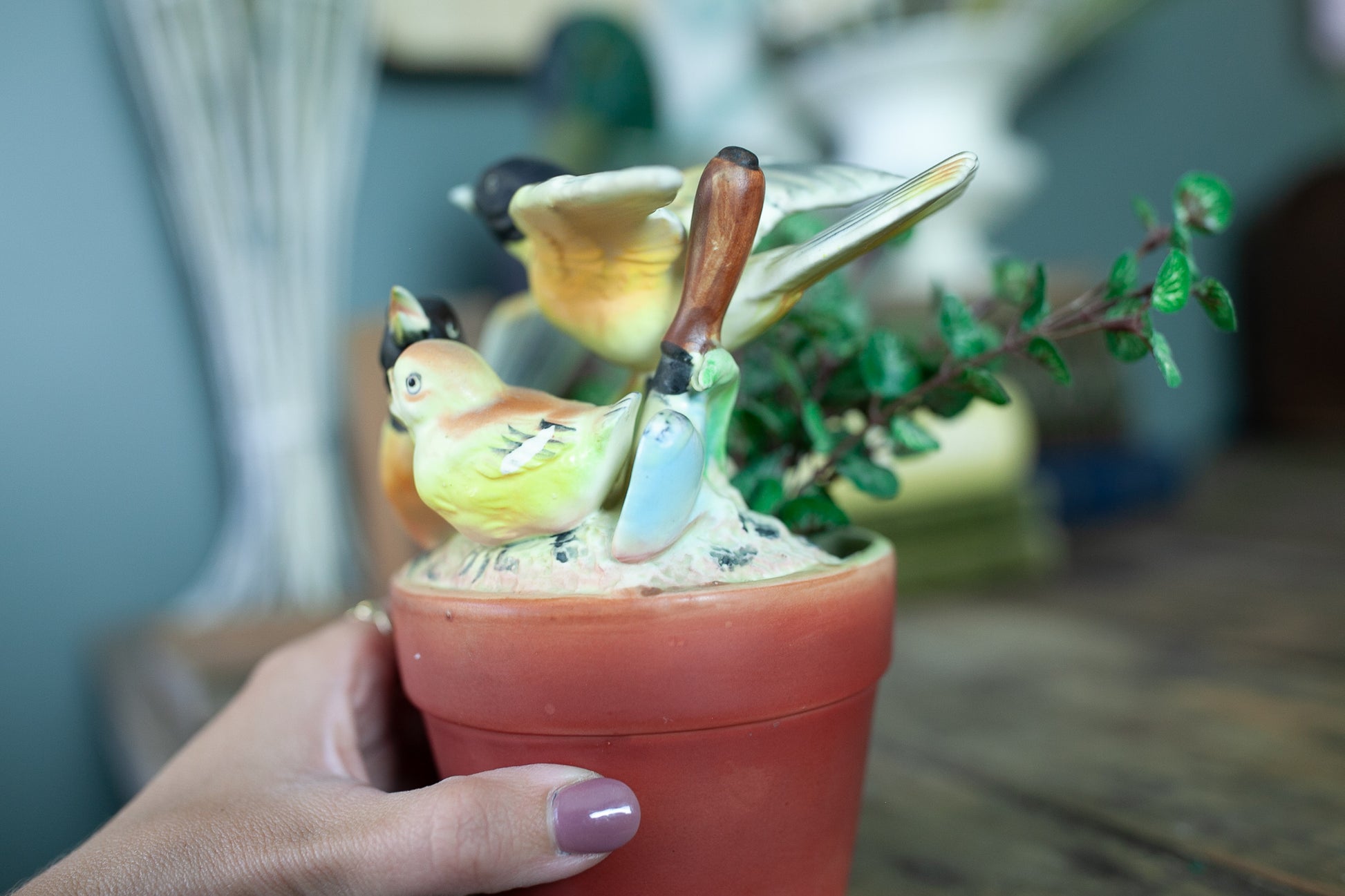 Enesco bird planter- this one is so great with 3 birds all made of porcelain perched on top. A small piece of greenery is included in the back, but can be removed. It is about 7" tall.