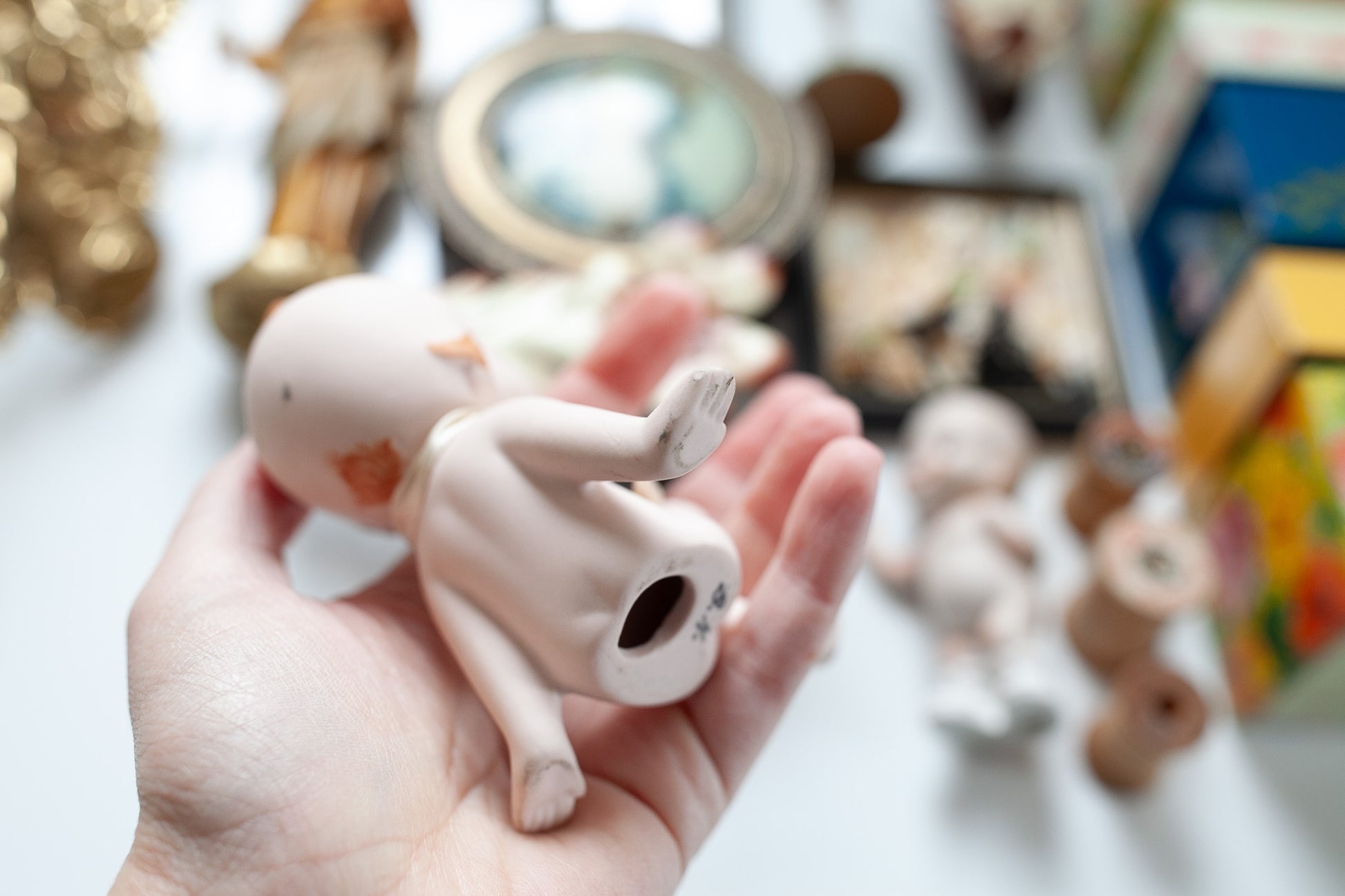 This kewpie is so darling just sitting back kicking up a leg. He is about 3.75" tall and about 3" wide. A few little marks on him on the back of his head and under his hands. A small B.K. initials are on the base.