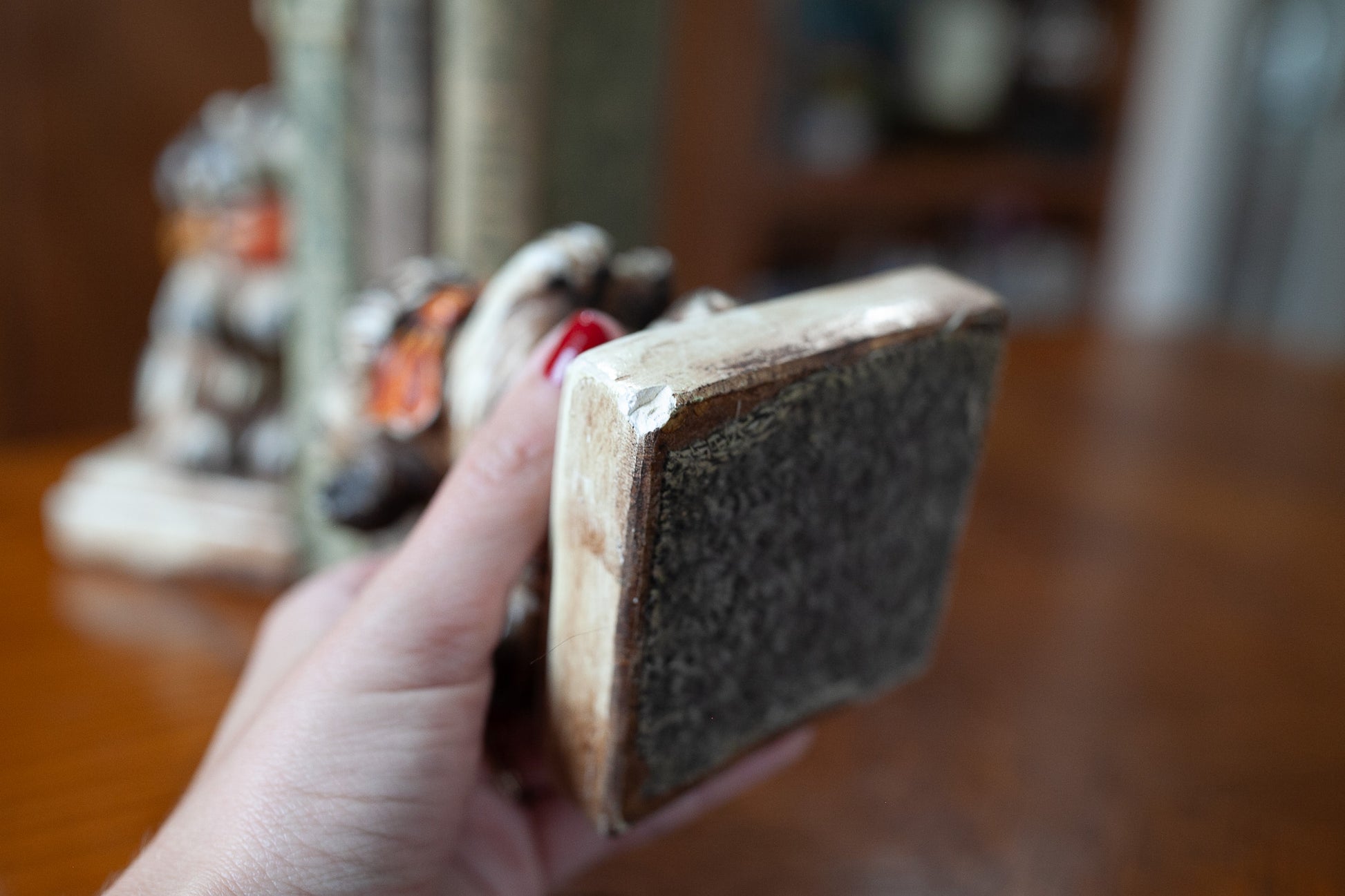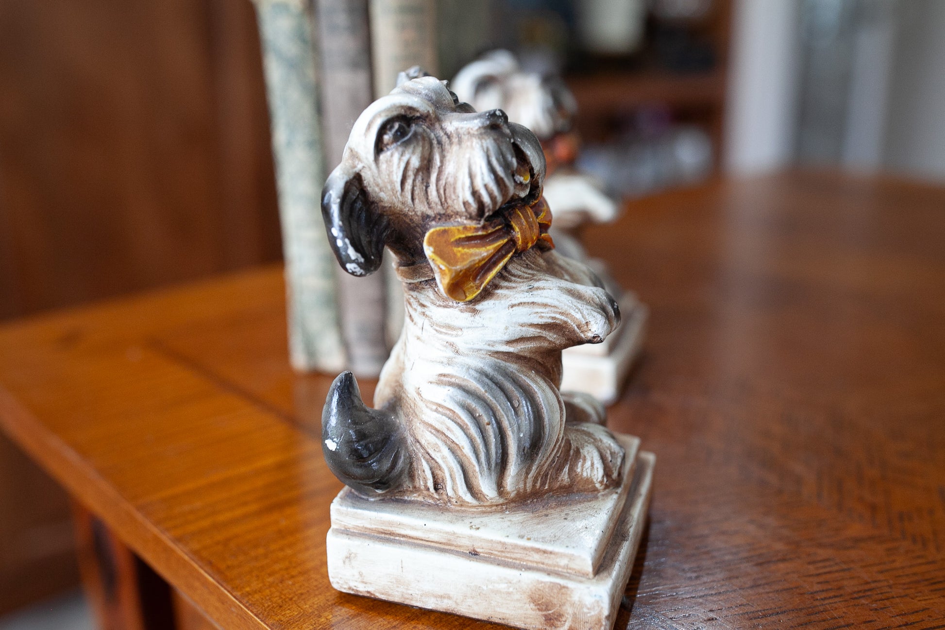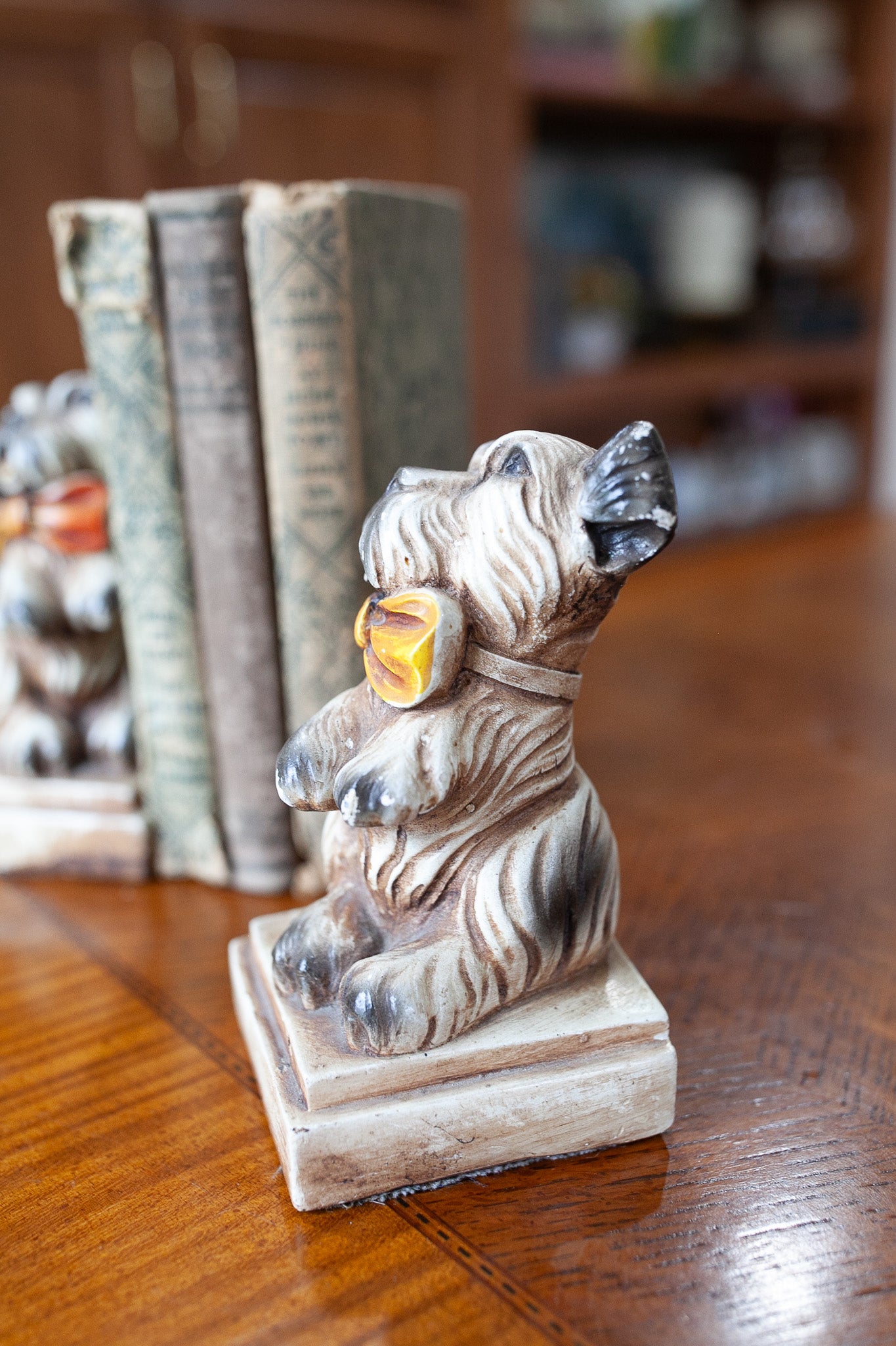 Pair of dog bookends- these are chalk ware and are chippy 5.75" tall and about 3" x3" wide and deep. One dog has an ear that has been repaired- but both are chippy and missing some paint. See all photos for details.