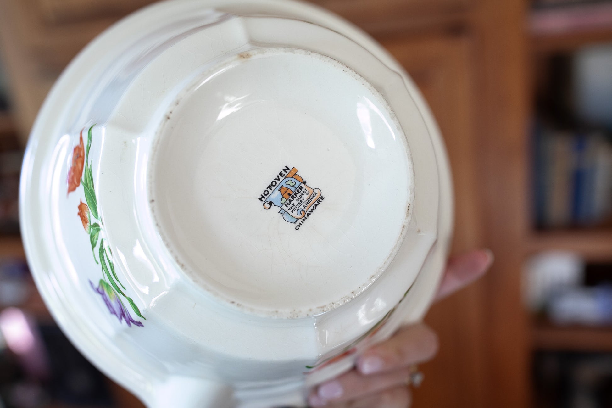 Hotoven Harker Mixing/Baking Bowl - in good condition with no cracks, but lots of crazing. There is the tiniest little chip in the edge that is just so tiny it is hard to pick up in a photo. It is a fun decor stacking bowl too!
