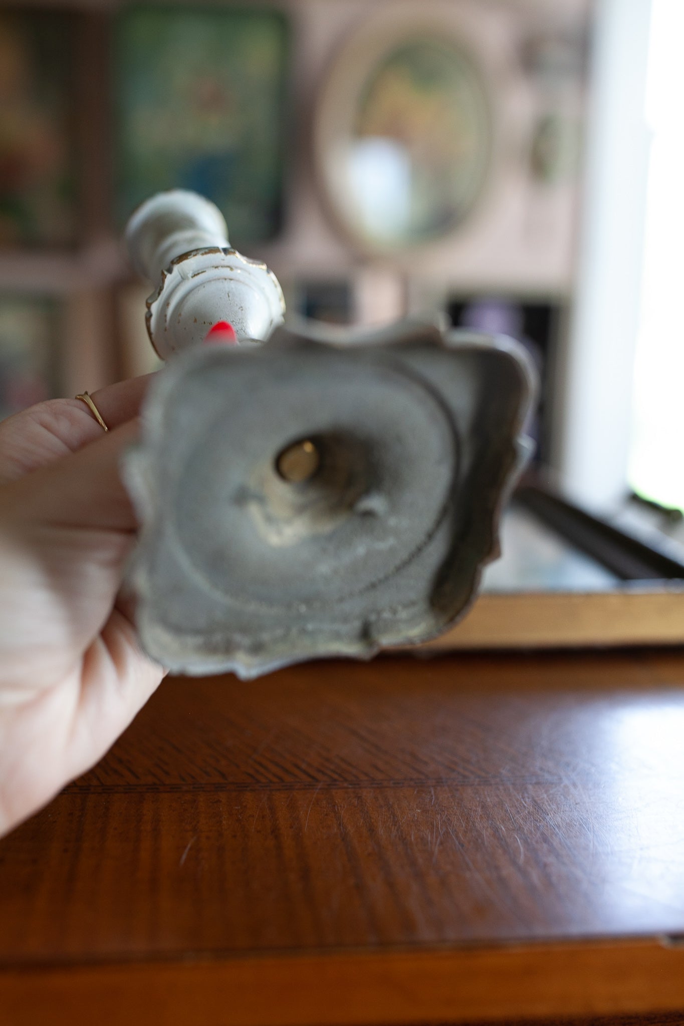 This is an instant collection of 5 great candlestick holders! There are two sets of two that are pairs and then one that is a single. They all seem to be brass that has been painted the same way. They range from shortest of 4.5" to about 7".