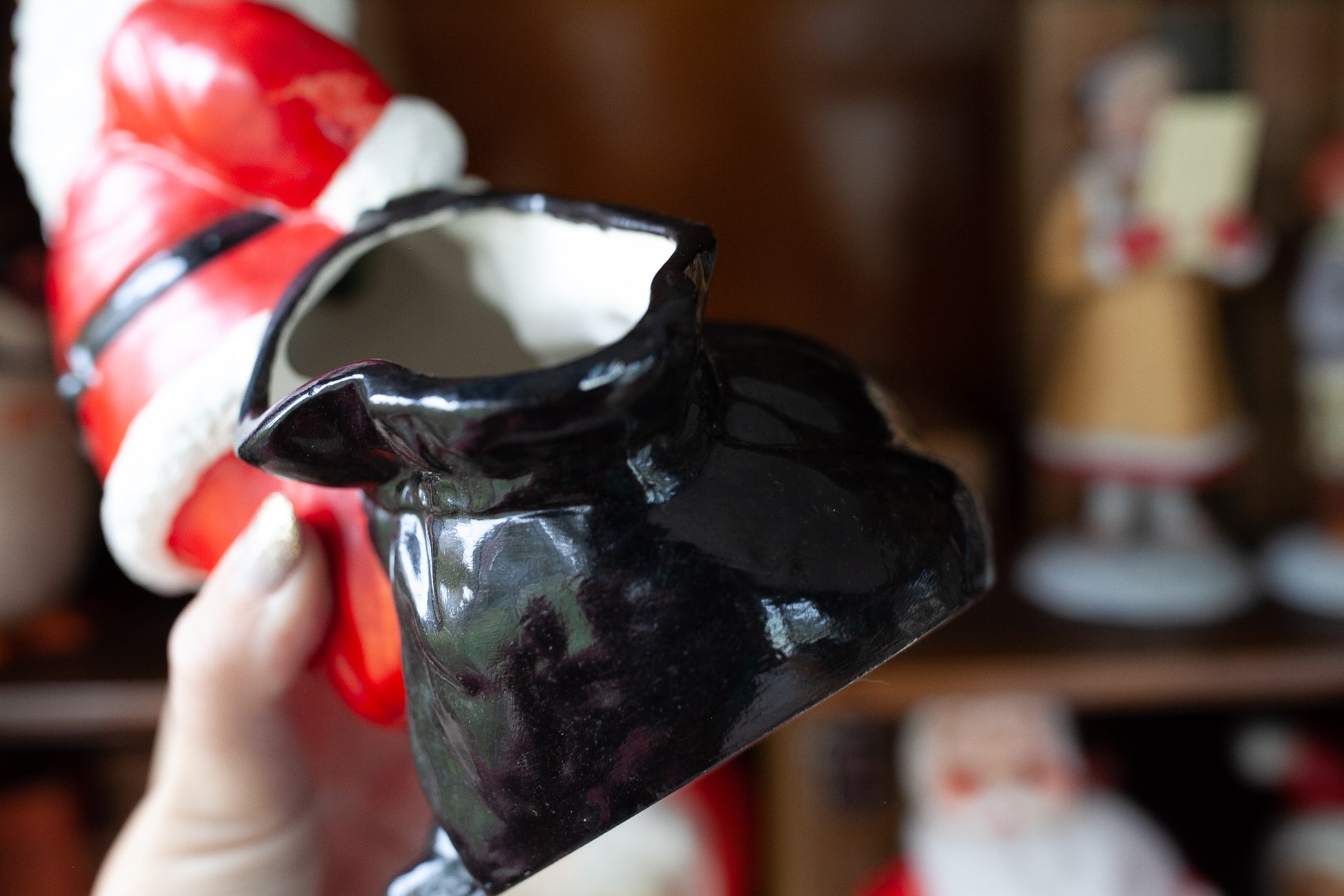 This Santa is a ceramic and is also a planter if you want to fill his bag- or just use as is as decor. He is about 10" tall and about 6.5" wide. He is in good shape. Some red paint in his white hat fur area, but overall a great decoration.