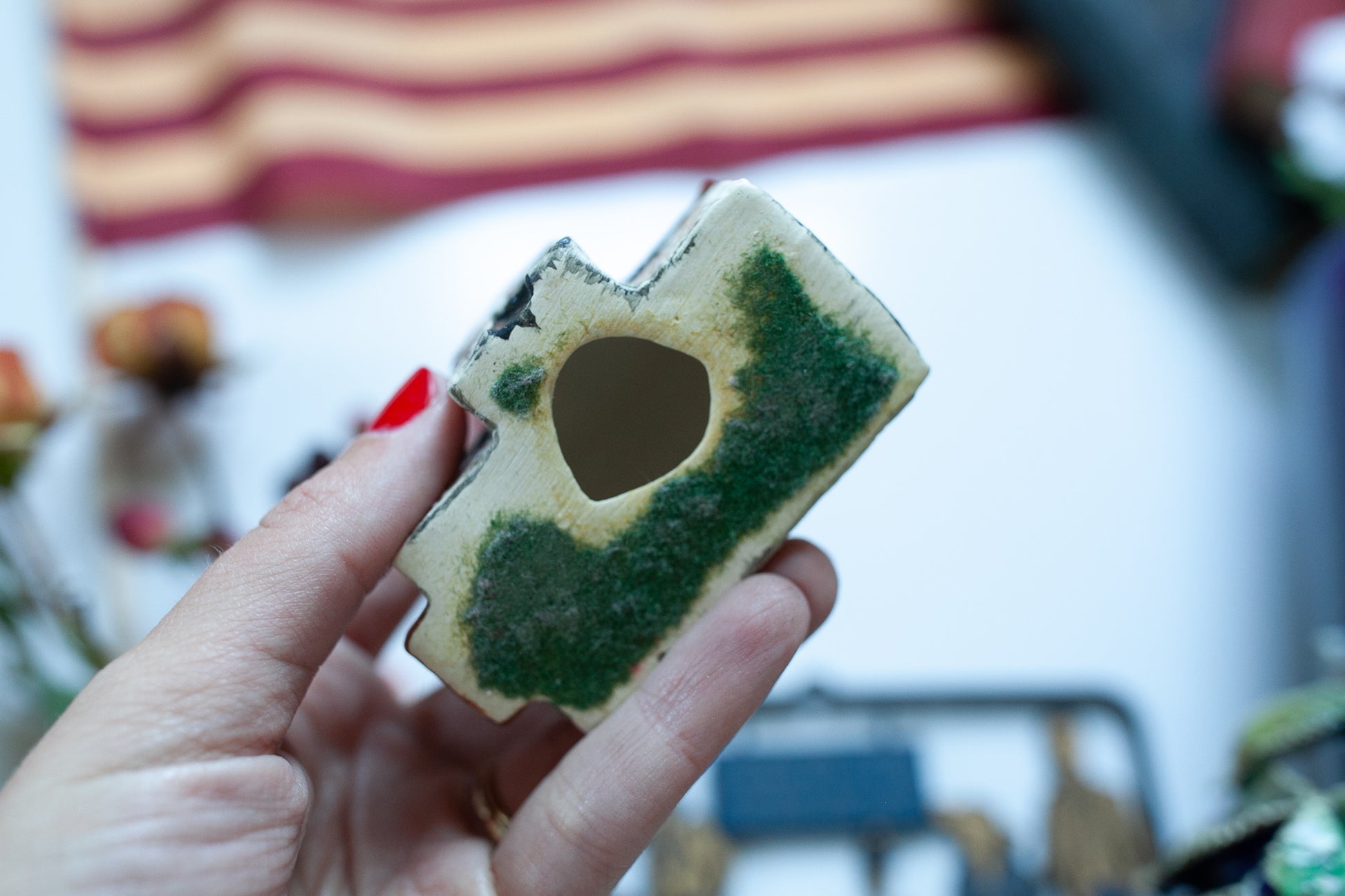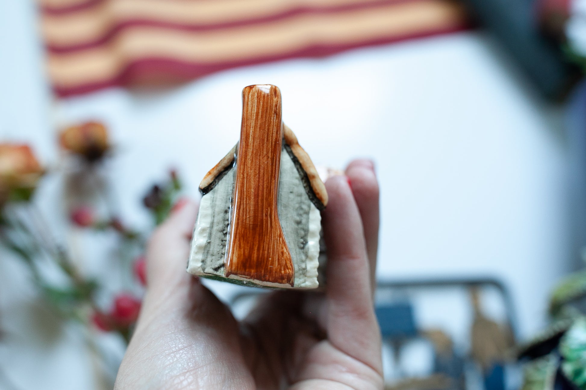 This little cottage is so darling! It is about 3" by 2.25" in size. It is free of chips and cracks, but does loo like there was a paint touch up on the base of the door at one time. It has a little green felt on the base.