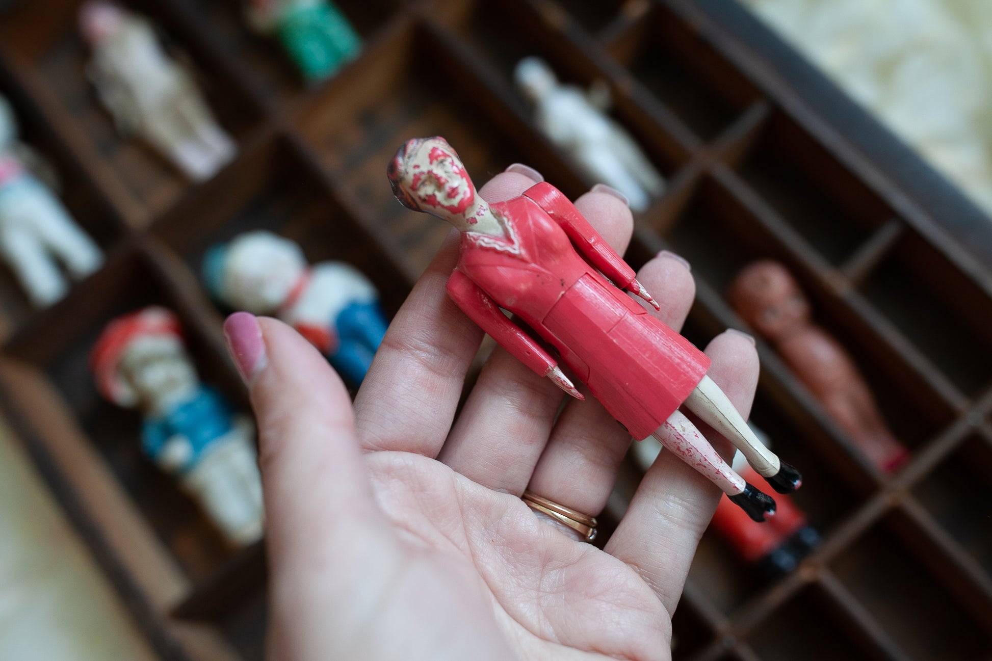 The first is a vintage renwal no 43 red dollhouse doll made of plastic. Shes jointed and can sit or stand. She has paint loss and is about 4" tall.