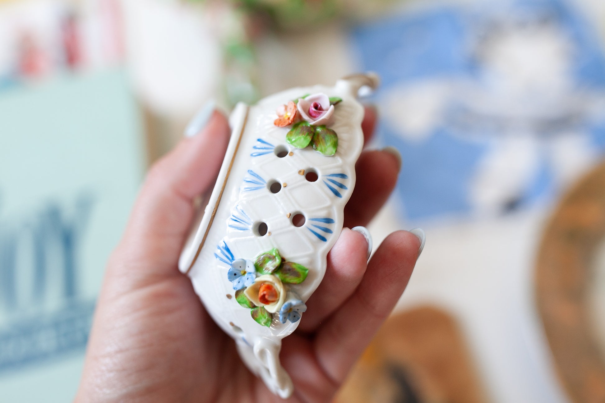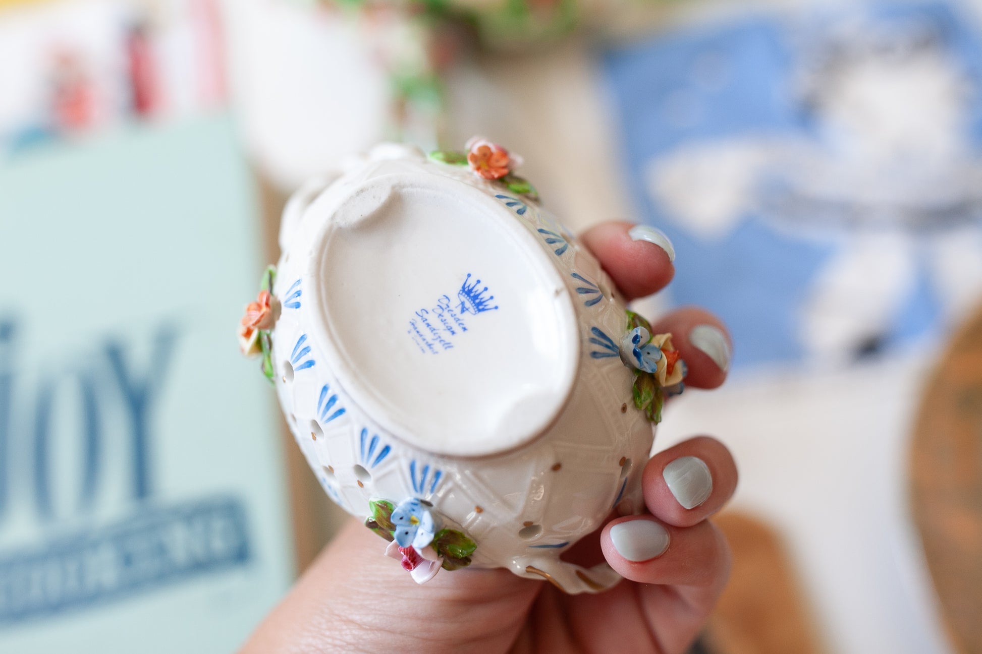 This little dish has a crown on the base. It has little flowers all around the piece. It is about 4.25" wide by 2.75" across by 1.5" tall. The tiniest little chipping in a few petals, but no actual sizable chips or petals missing. Pretty painting in blue and florals on the inside of the piece.