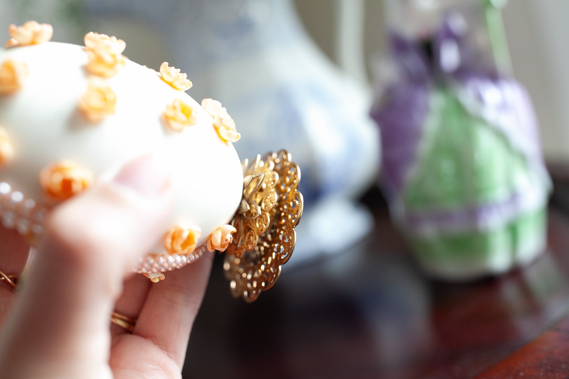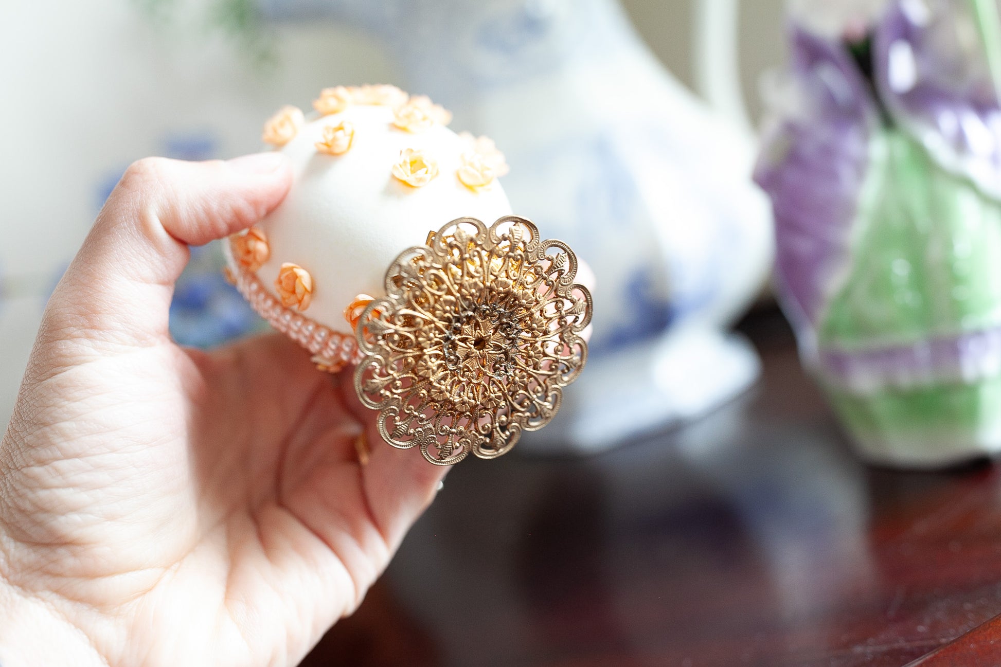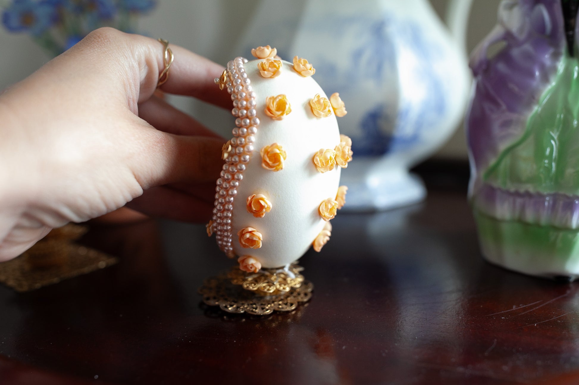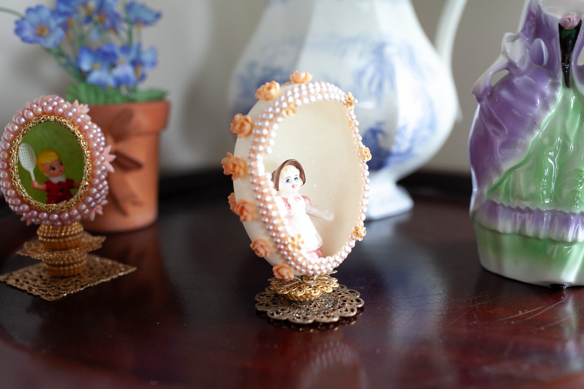 Vintage Egg Diorama- this egg is about 4.5" tall. The egg is decorated with little orange pearly beads and flowers glued on the shell. The inside is painted with glitter and has a little girl figurine... the base is extravagant in gold detailed metal. It is a fun fragile egg that would be so cute to display. There are some beads missing on the edge and a few missing details and flowers.