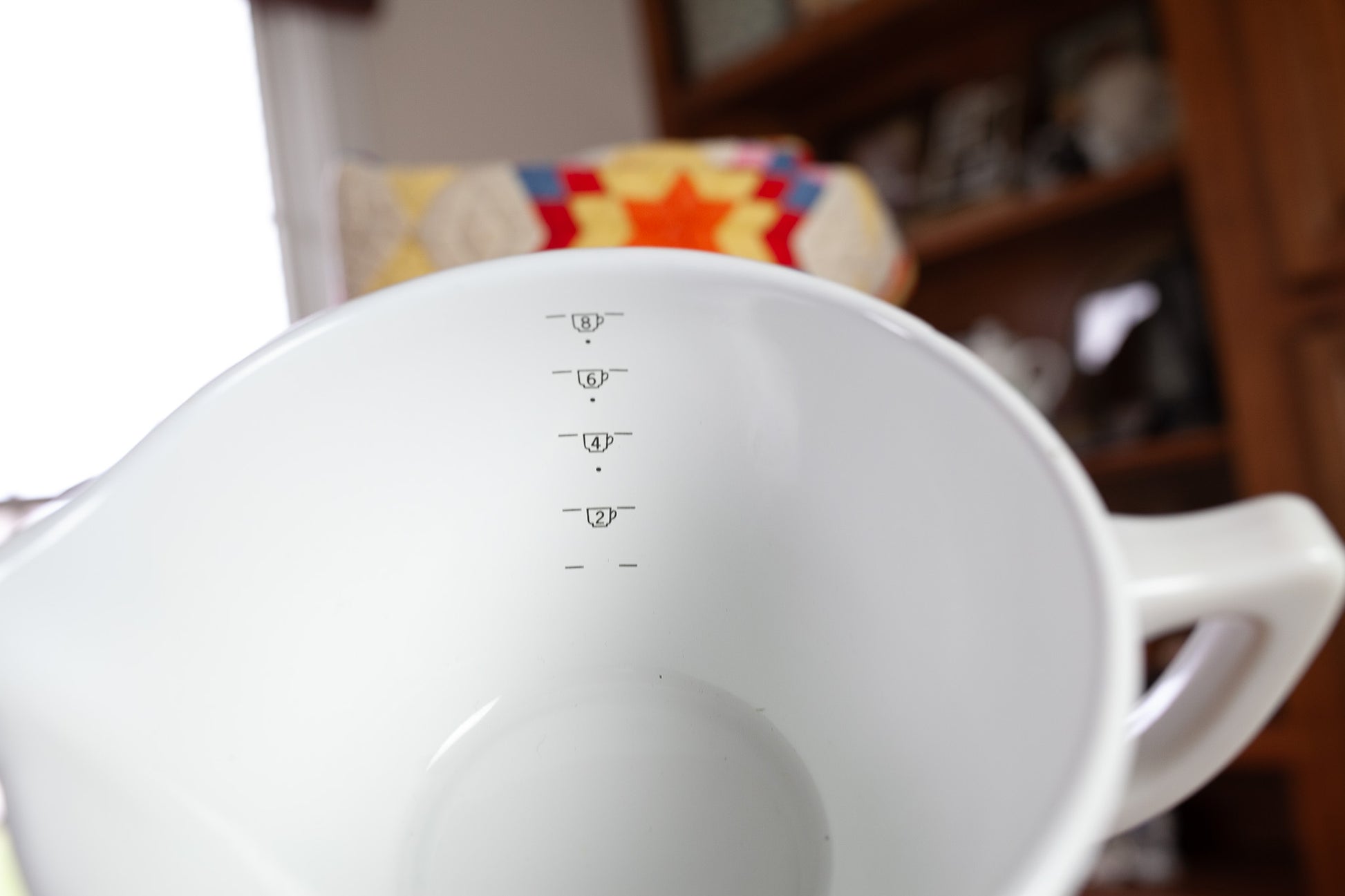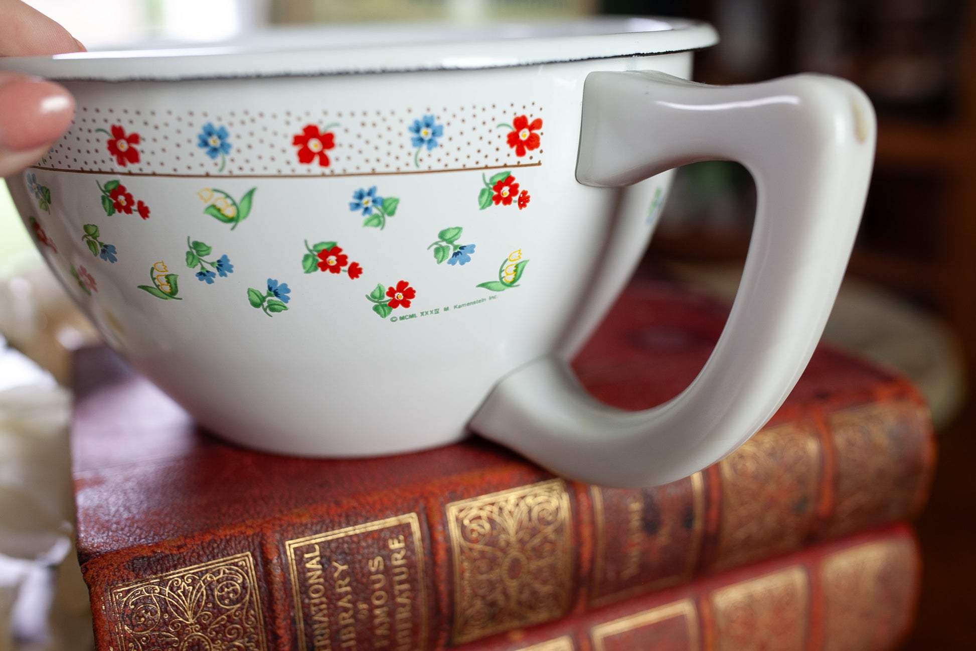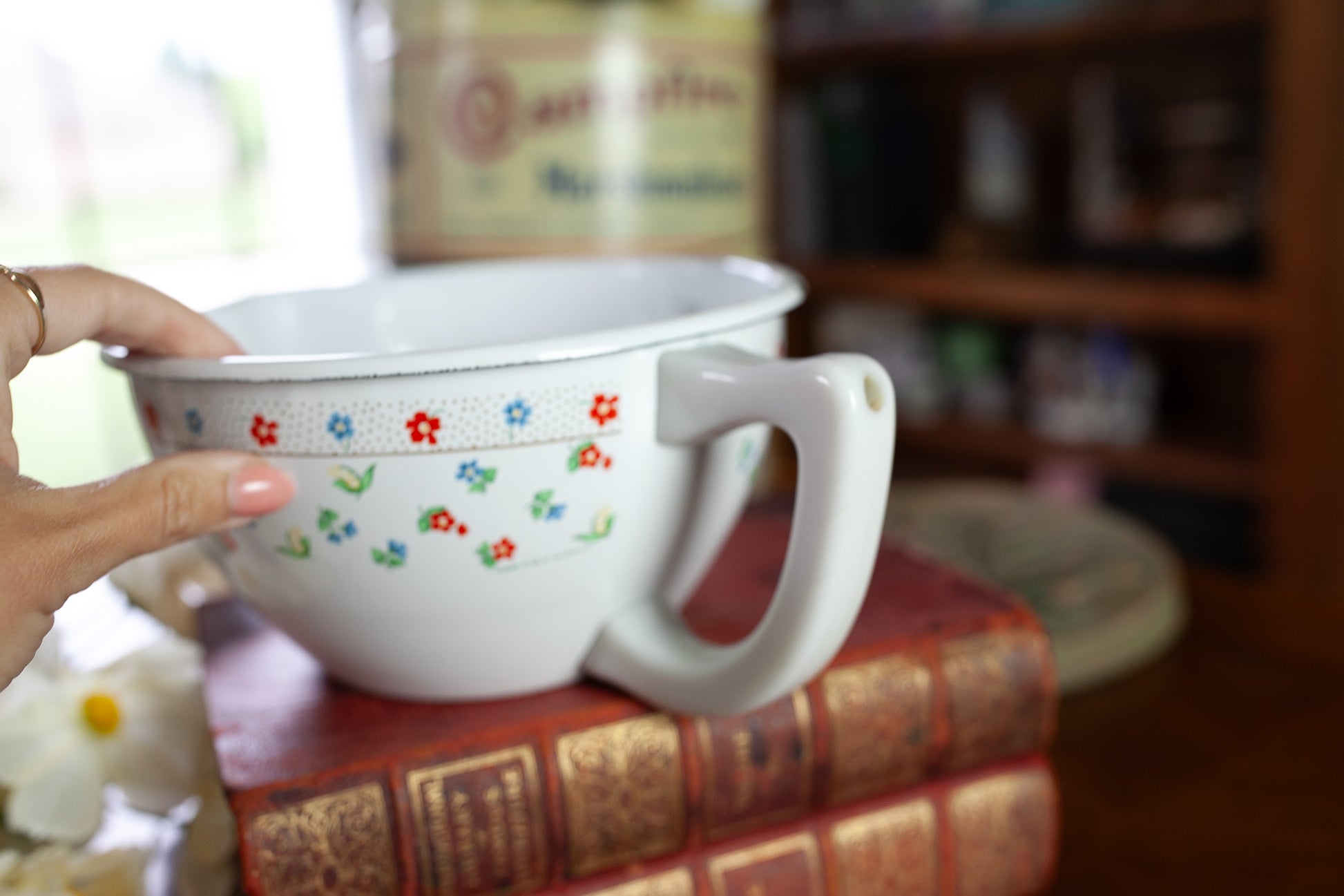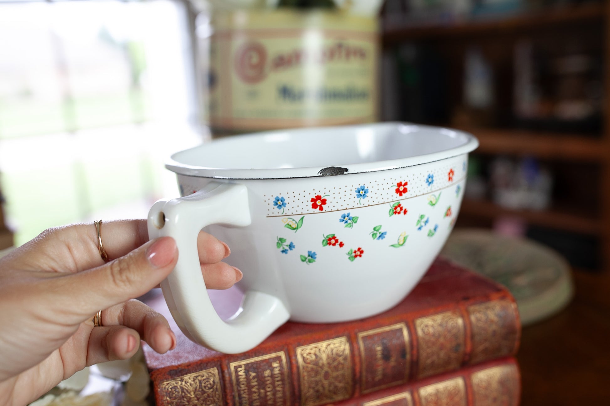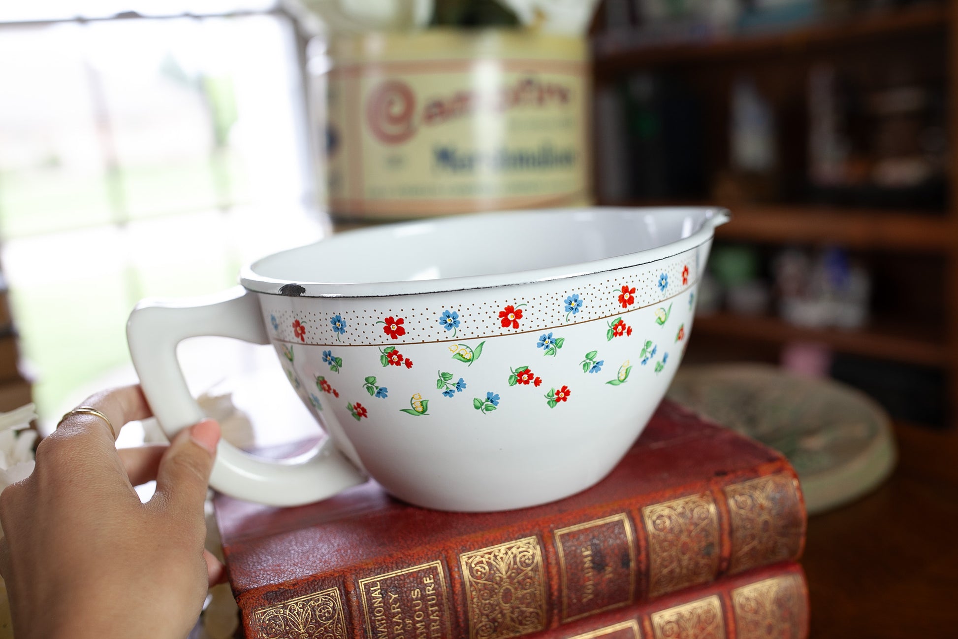 Vintage ENAMEL BATTER BOWL/Measuring Bowl/Enamel Bake Ware/Farmhouse Decor/White Enamel Kitchenware/Retro Kitchenware/Handled Mixing Bowl