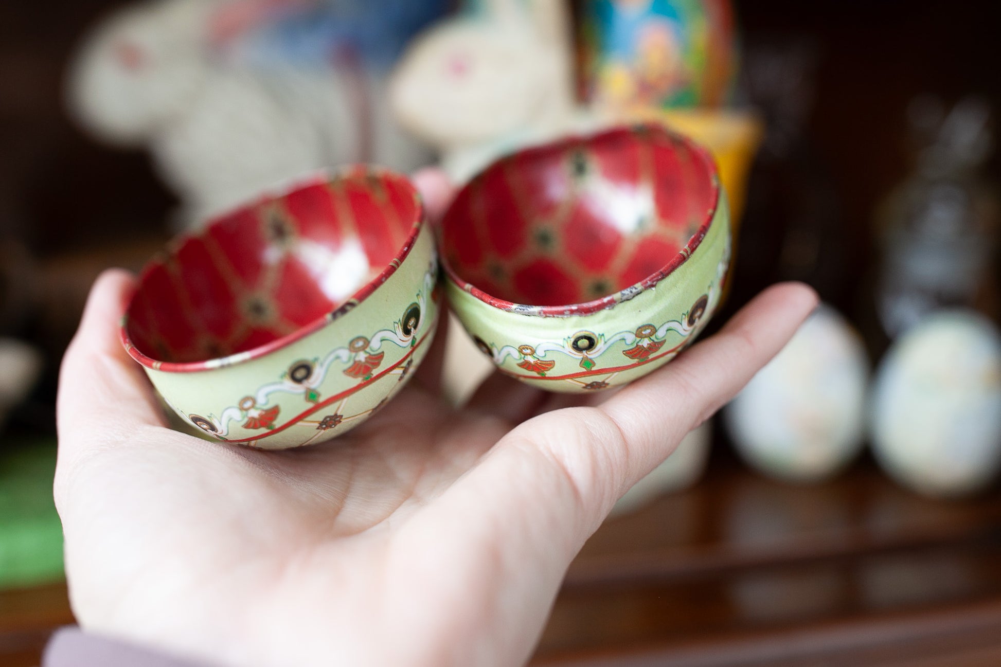 This is a tin egg that says 1894 on the front of it. It is litho printed tin. Still fits together and can be separated to store trinkets or candy. It is about 5"x3" in size. Some light denting and wear, but still holds closed well and displays great.