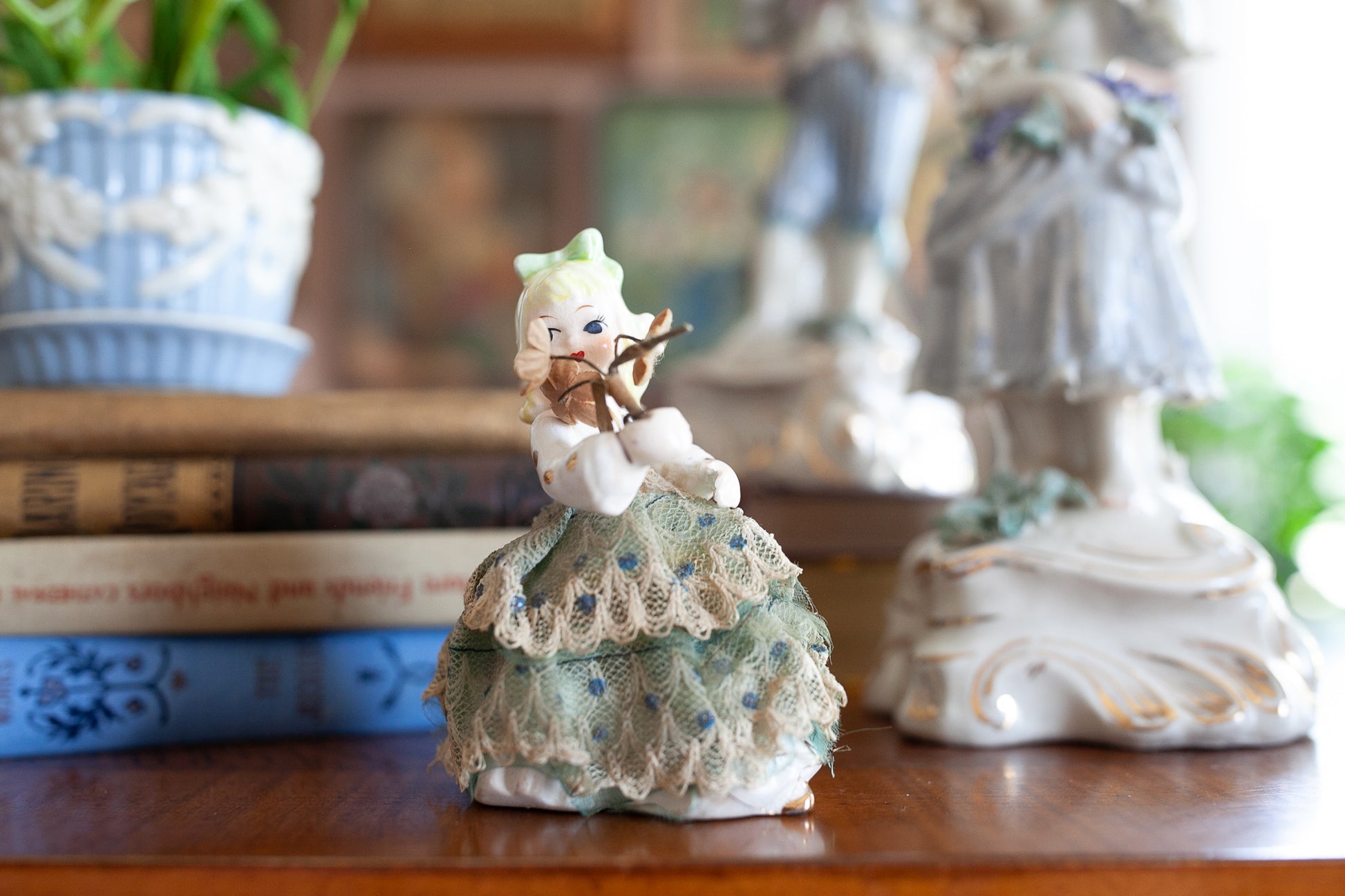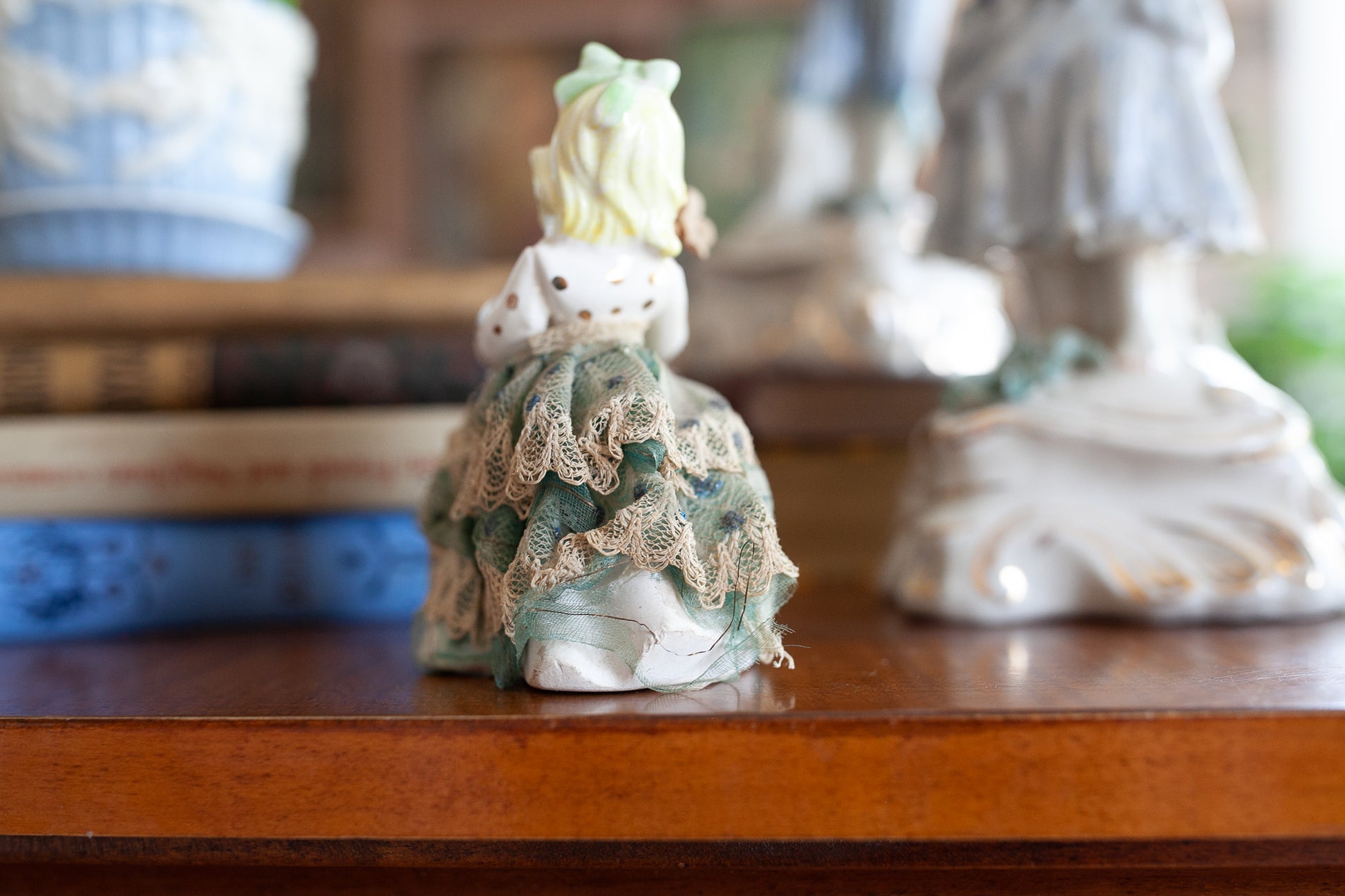 I love this one! She has a polkadot dress and painted polkadots on her arms. She has blonde hair and a green bow. She even has her original silk flowers in hand. She is in good shape with just a little wear to her dress. She stands about 4.25" tall.