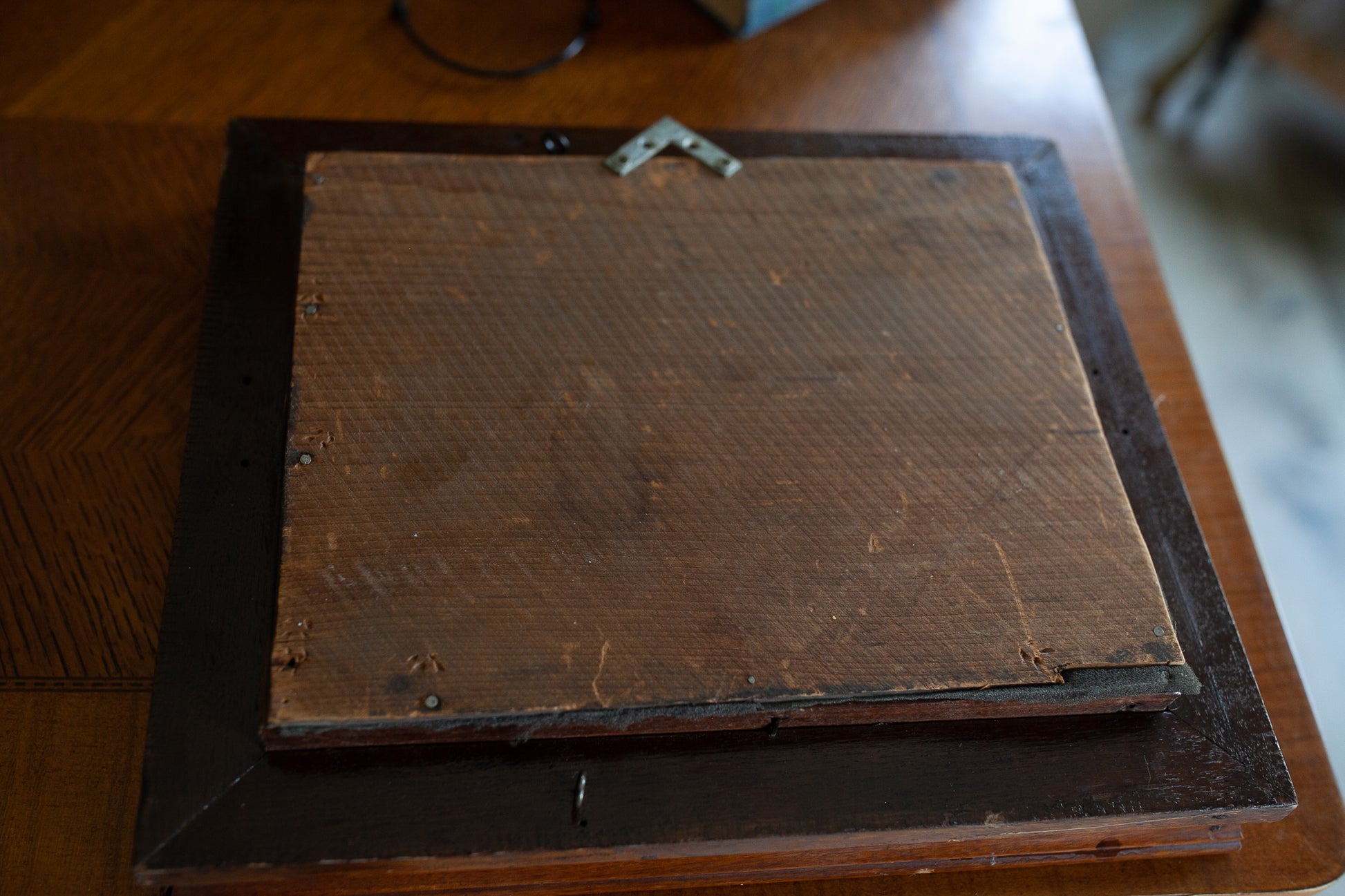 The frame is wood and very old- this is attached via nails so there is spacing in the corners which is normal for these frames.