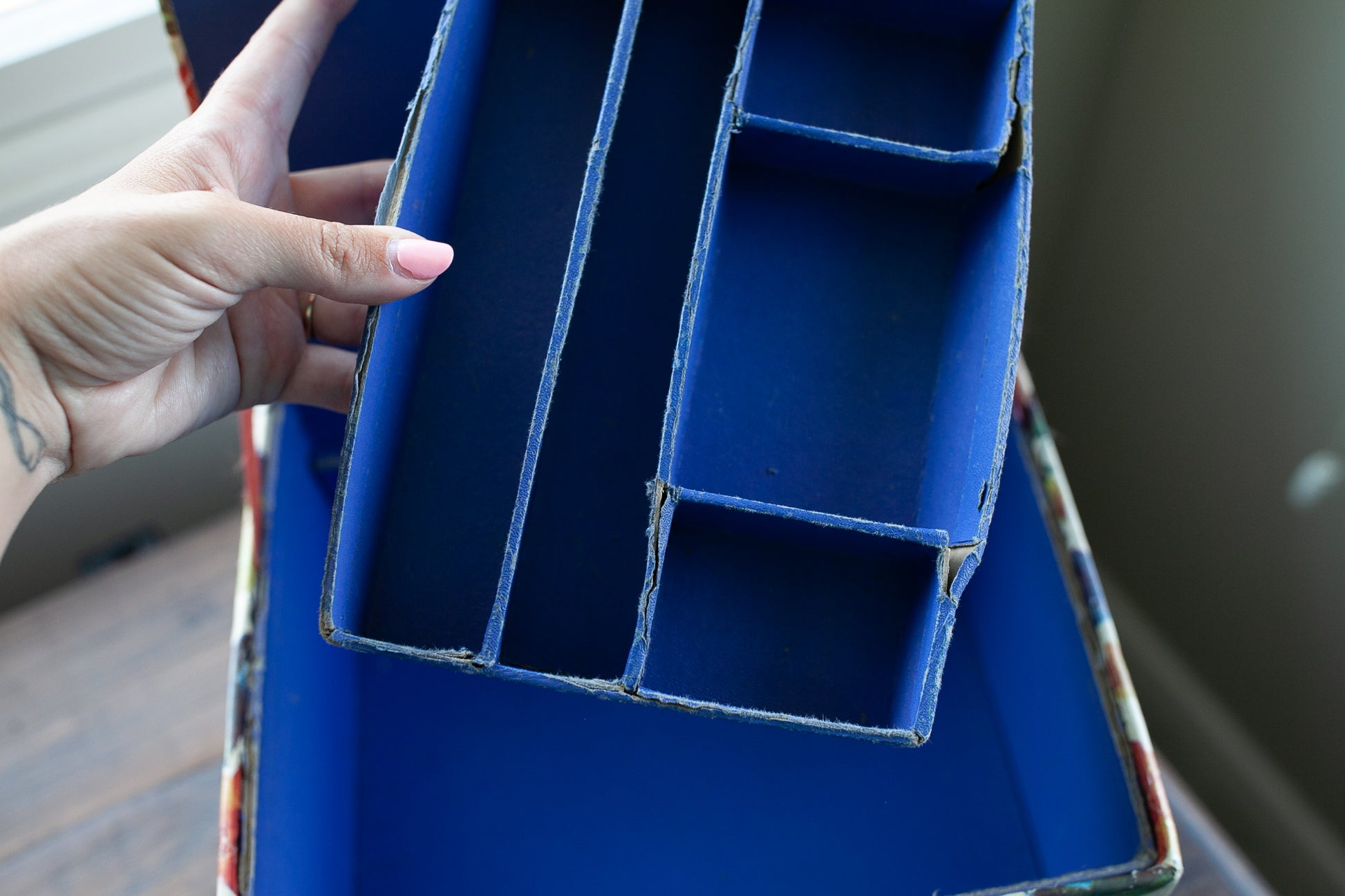 11"x9"x5" size - floral box- opens to an inside lined in blue cardboard. There is a cardboard tray that is removable and room for storage underneath. There is somewhere to the box and the cardboard inside, but still very useable and provides for super cute storage!