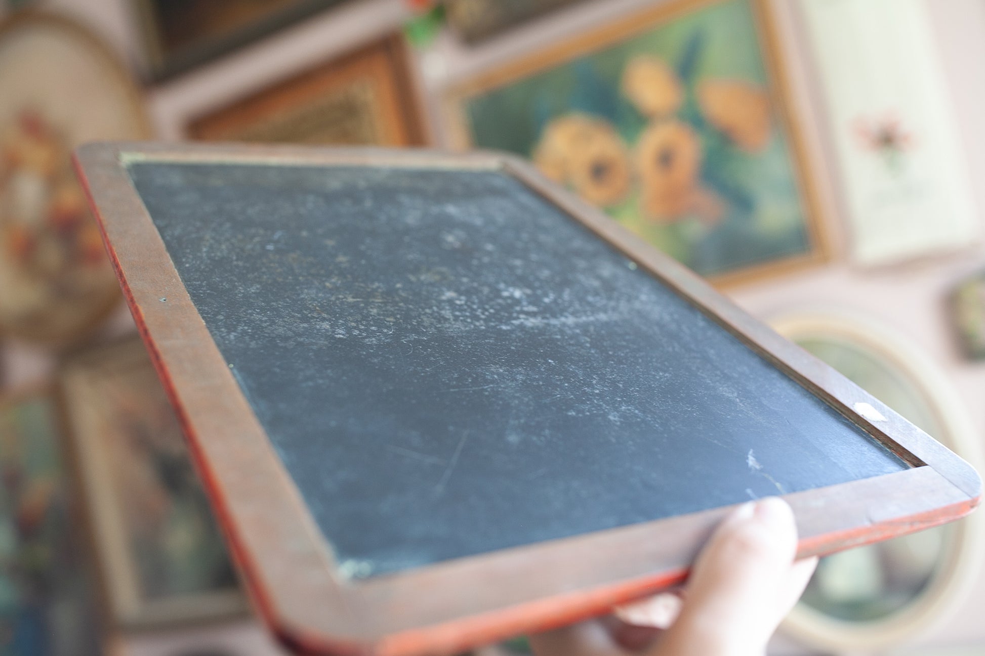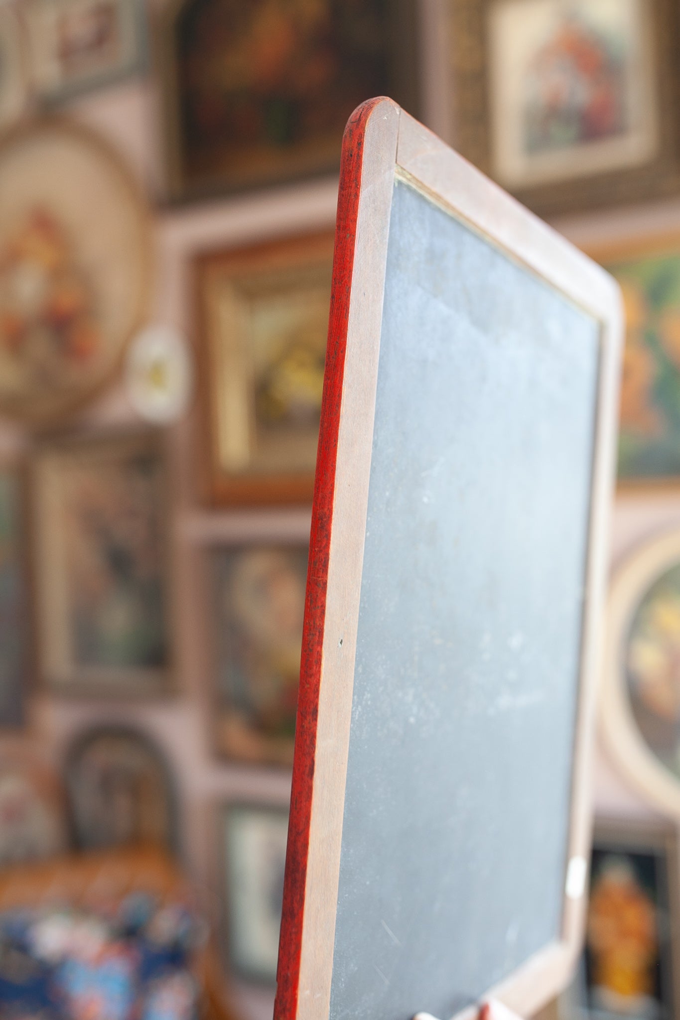 This vintage chalkboard has been painted with florals and is really pretty! It is about 10.5"x14.5" in size. It is painted on one side and is the chalkboard on the other side. There are some paint imperfections, but overall in good shape. It sits on a shelf , but does not have any hanging hardware (it would need to be added to hang on a wall).