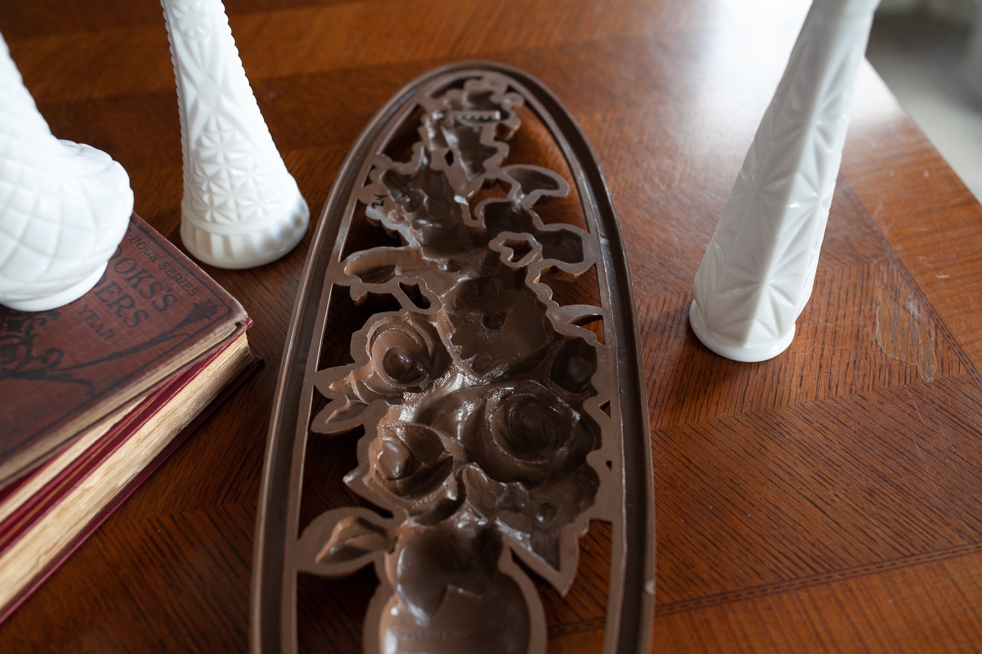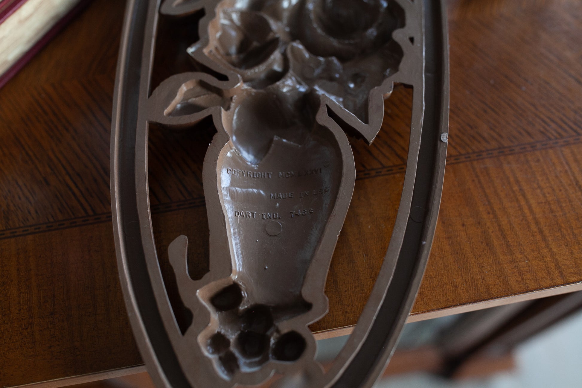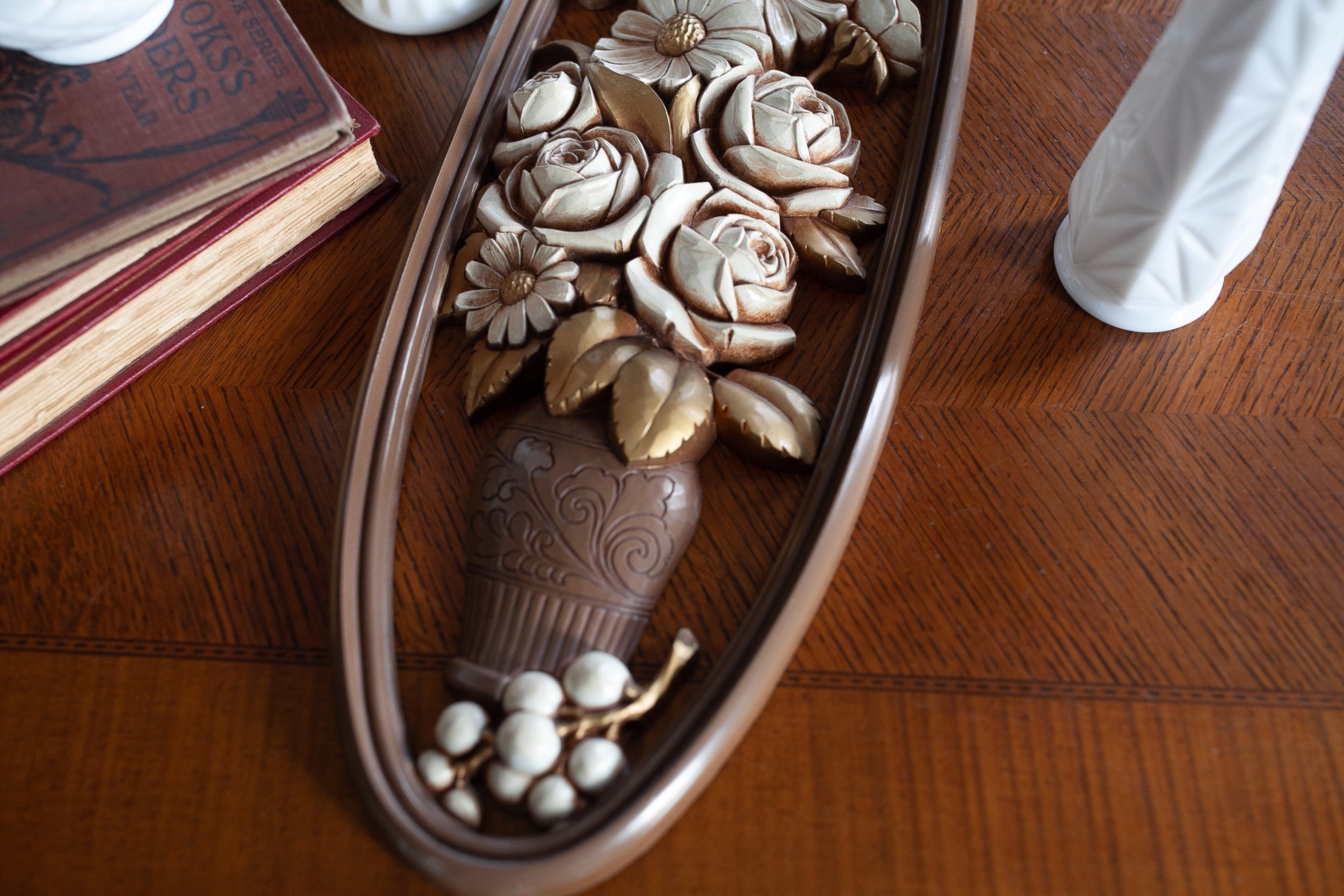 This floral is an interesting vintage piece! It is a heavy resin formed plastic that has been painted. It has a look of wood, but it is not. It is such a unique piece and perfect for a gallery wall for texture. It is about 21"x7". It is in great vintage condition. It has Made in the USA on the back of it.