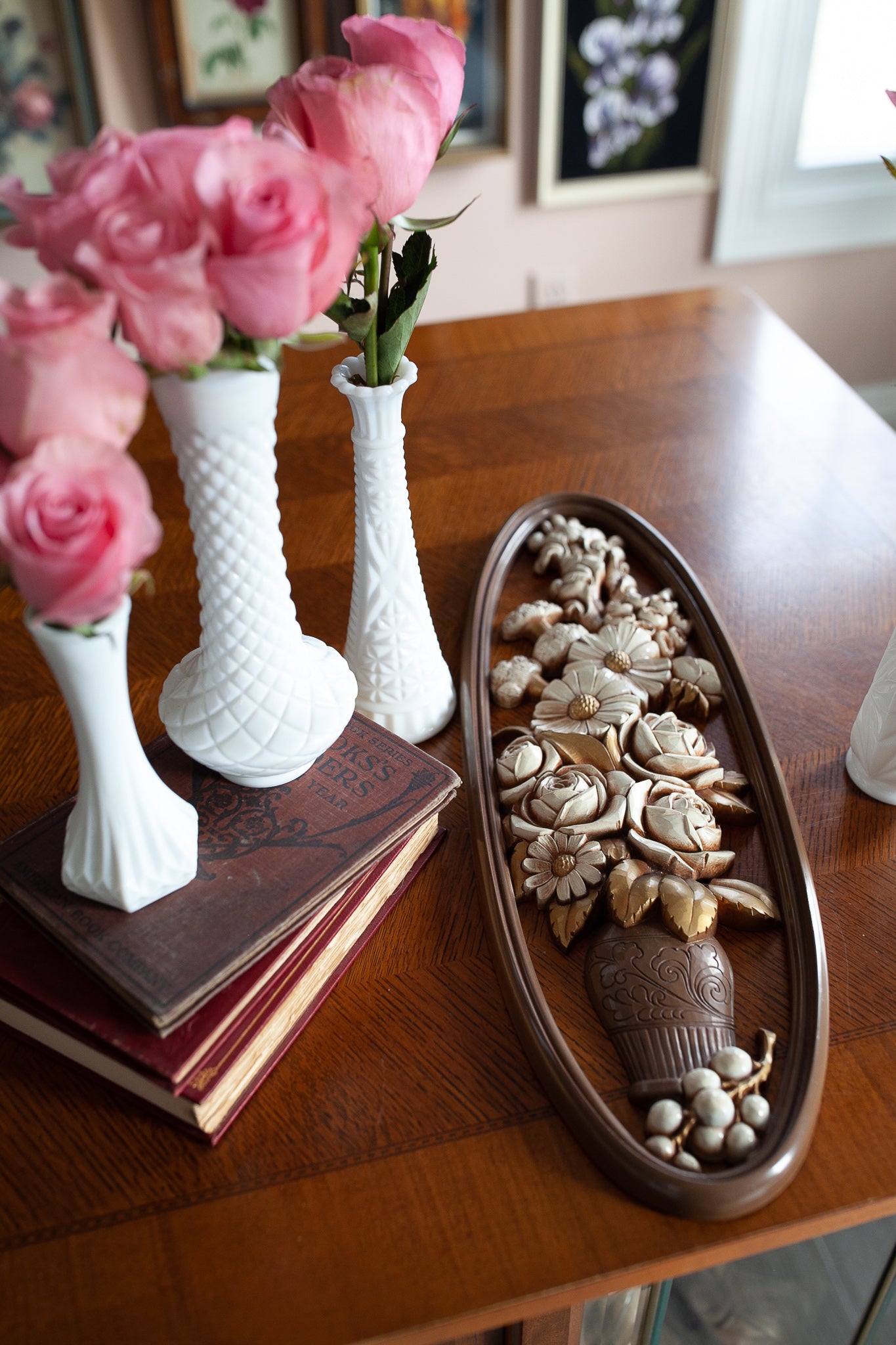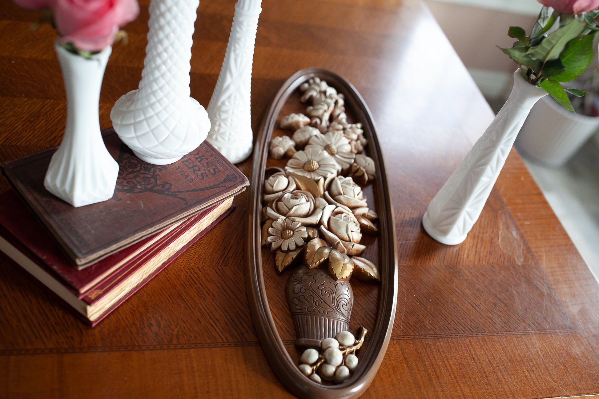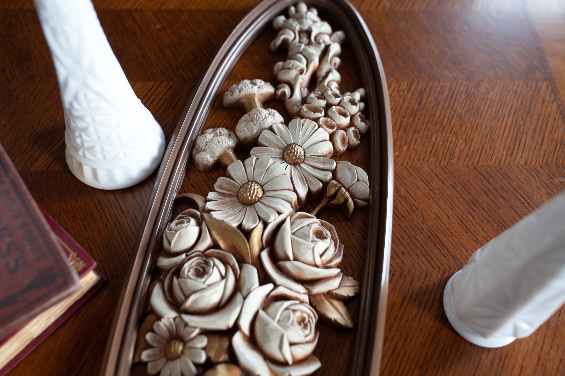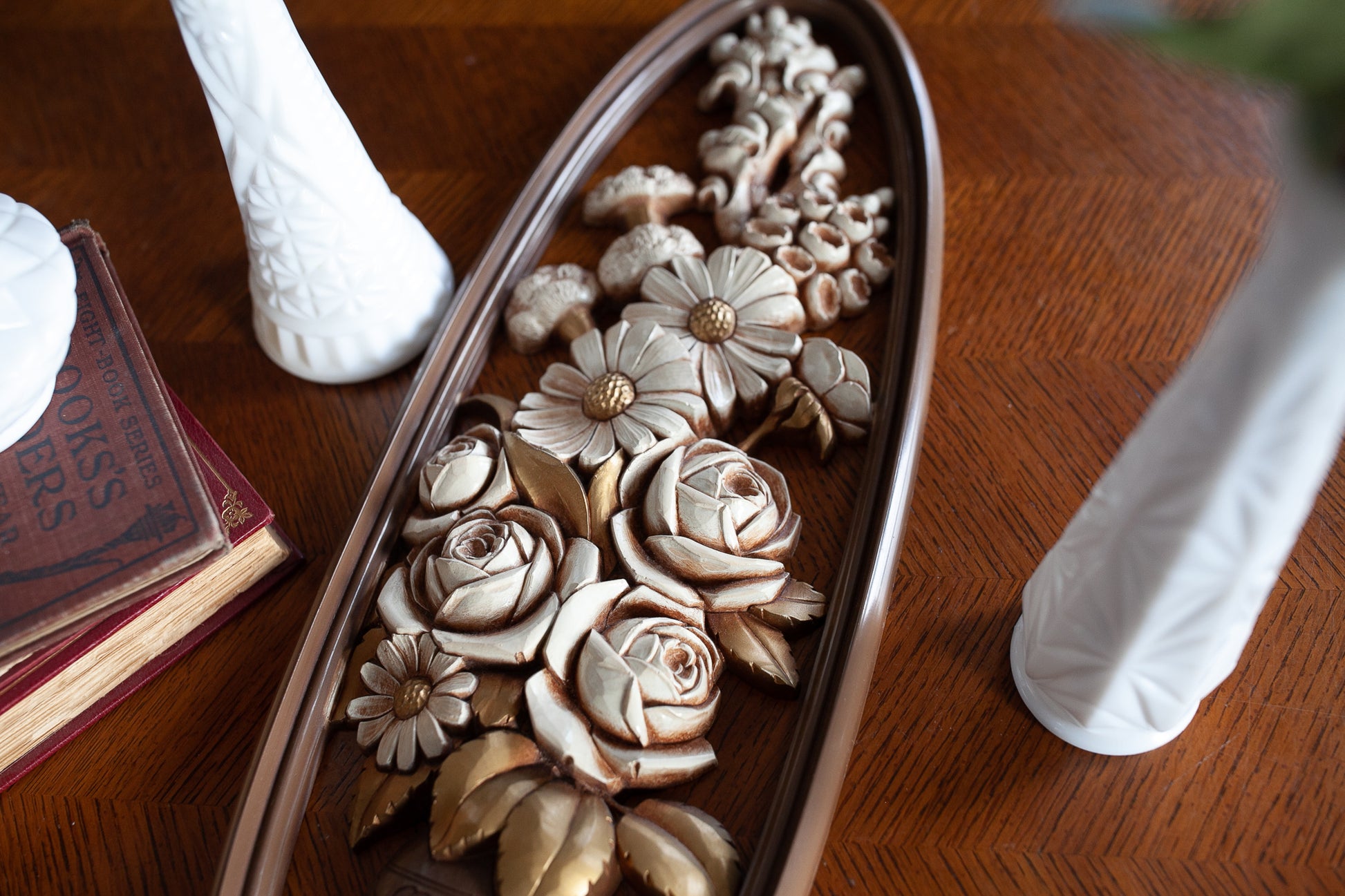 This floral is an interesting vintage piece! It is a heavy resin formed plastic that has been painted. It has a look of wood, but it is not. It is such a unique piece and perfect for a gallery wall for texture. It is about 21"x7". It is in great vintage condition. It has Made in the USA on the back of it.