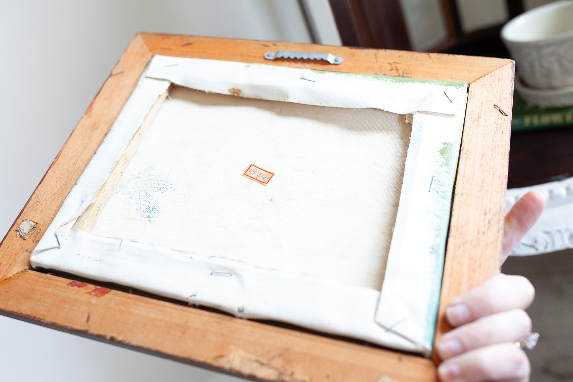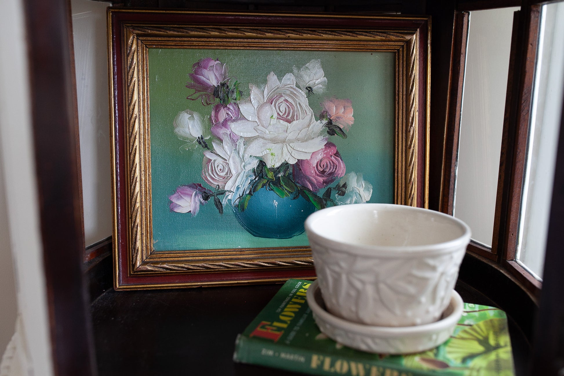 This piece is a vintage floral on canvas framed in a wood frame and is about 10.5"x12.5" in size. It is signed in the lower right corner. It is a blue vase with pink and cream roses. The frame has some wear to it, but overall in good shape.
