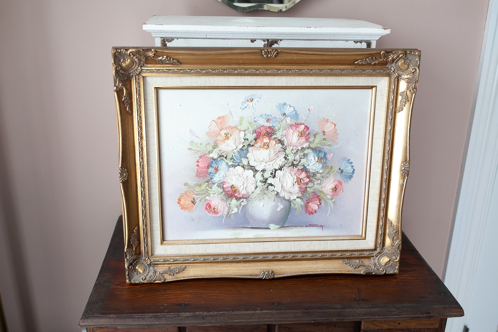 This floral is so gorgeous! It is a light painting in more of a pastel color theme with texture. It is a canvas in a gold frame approx 21"x17.5" in size. It is in good vintage condition. There is a signature in the lower right corner.