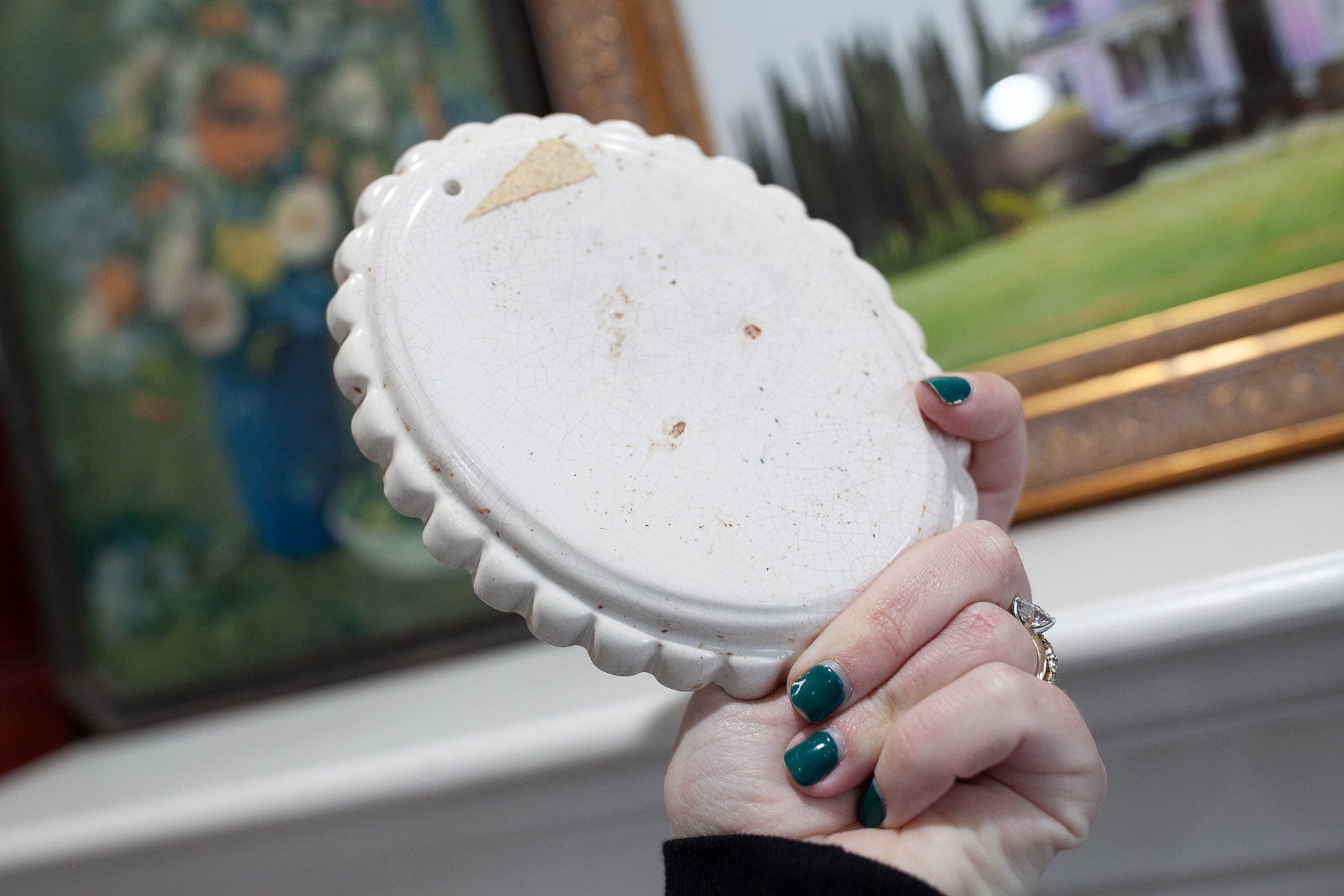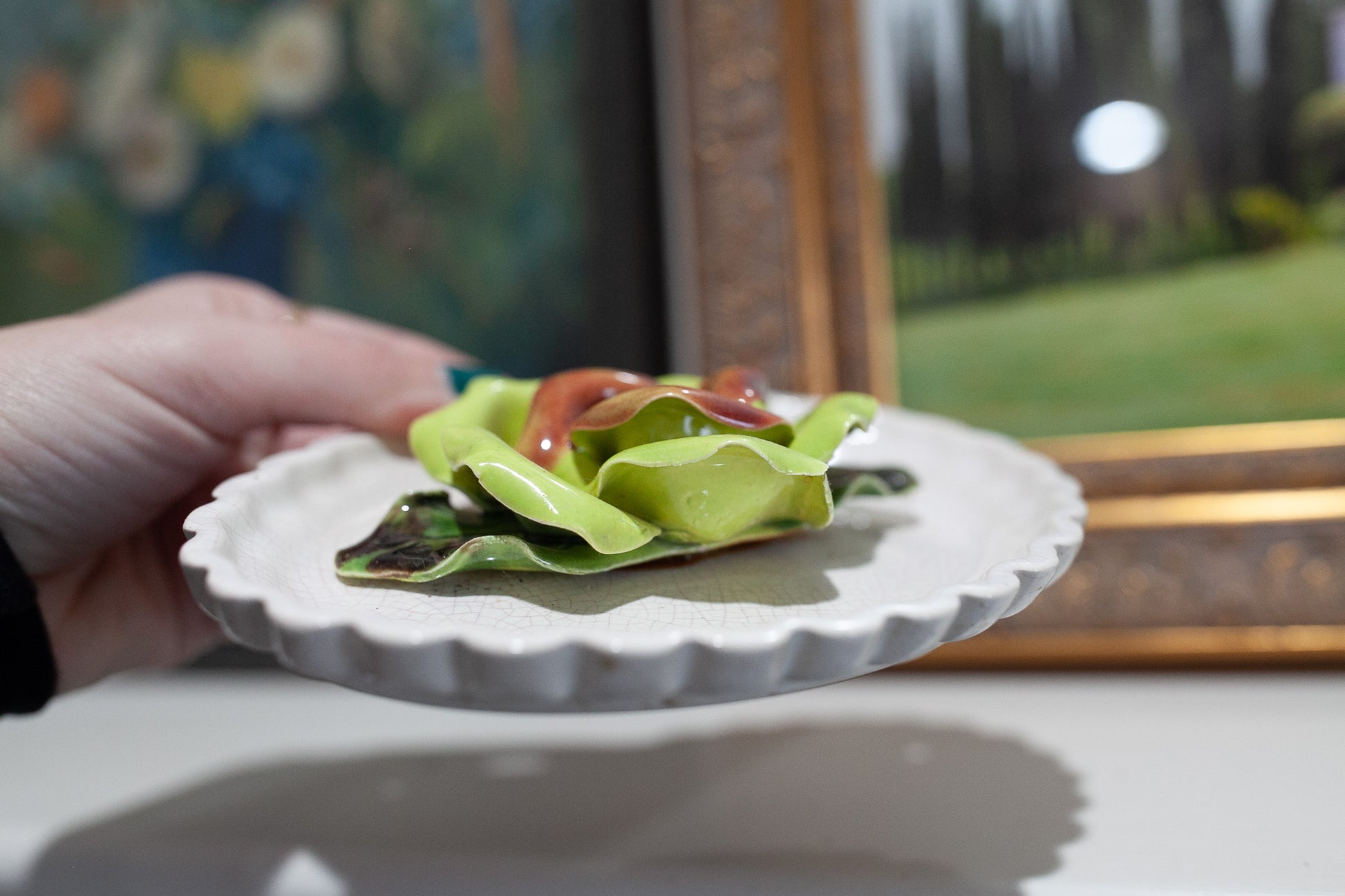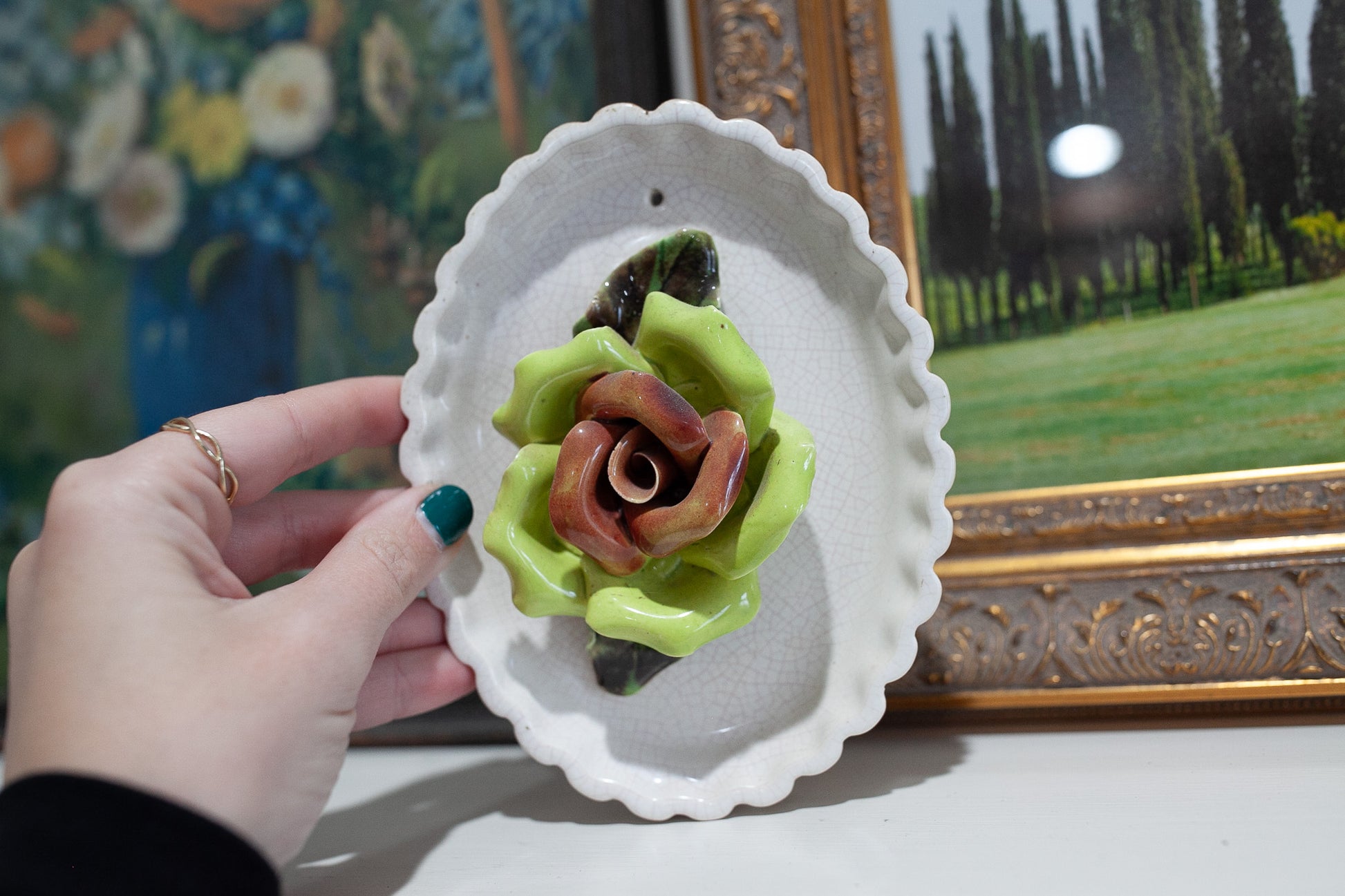 This is such a sweet flower piece! It is all porcelain. It is a green rose like flower and is on a plaque to hang with. There is a hole in it to hang with. The piece is about 6.5"x5" in size. It has a few tiny little chips in the flower petal edges. This piece has crazing visible and a few little marks in the back of the porcelain.
