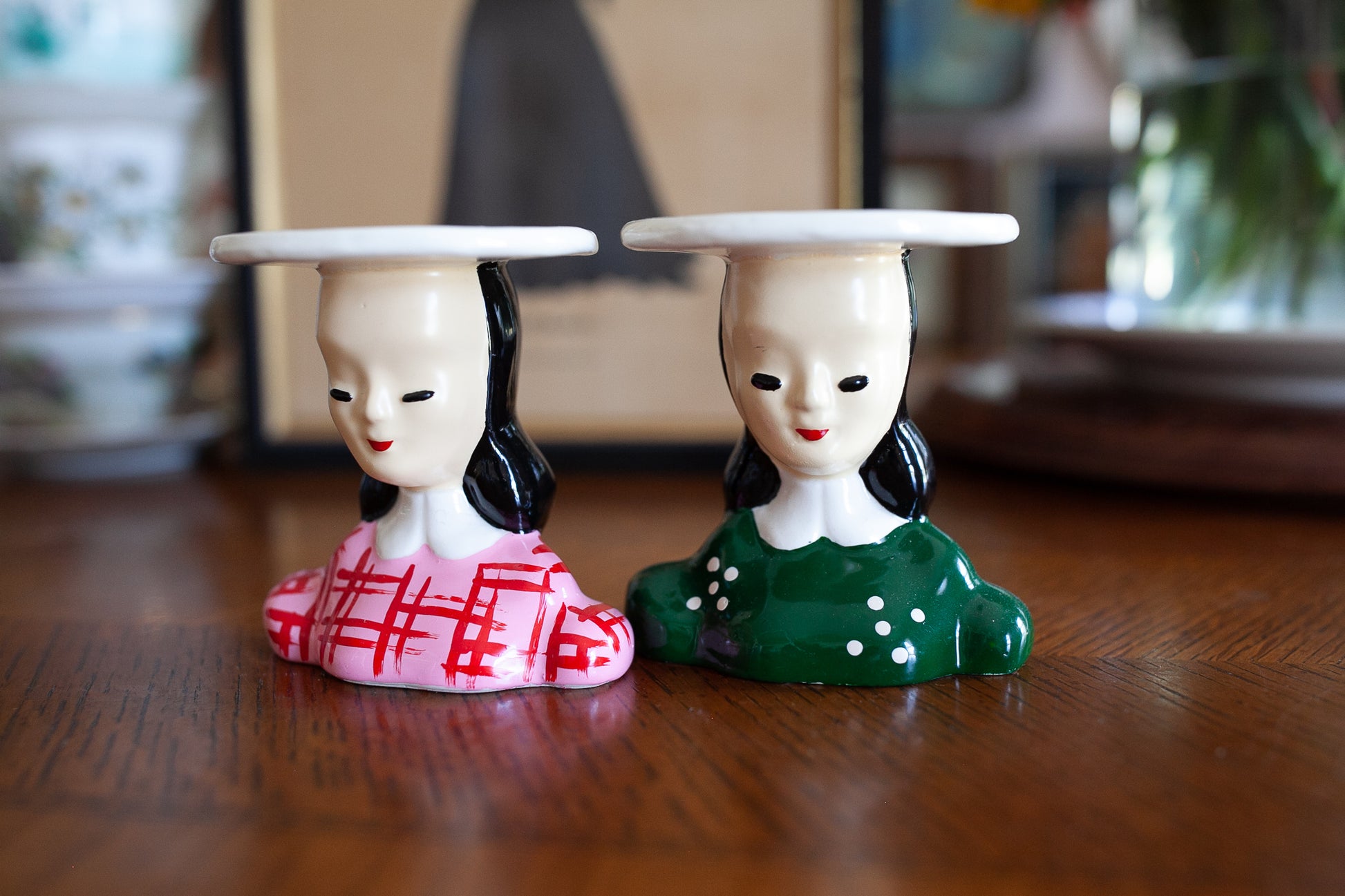 These two ladies I believe were made to look like Betty Lou Heads- they are not made by her but they are a pair! They both come for the price. They stand at about 3.25" tall. The paint on these two makes me think they are on the newer side of vintage 20+. No chips or cracks, but some minor paint wear.