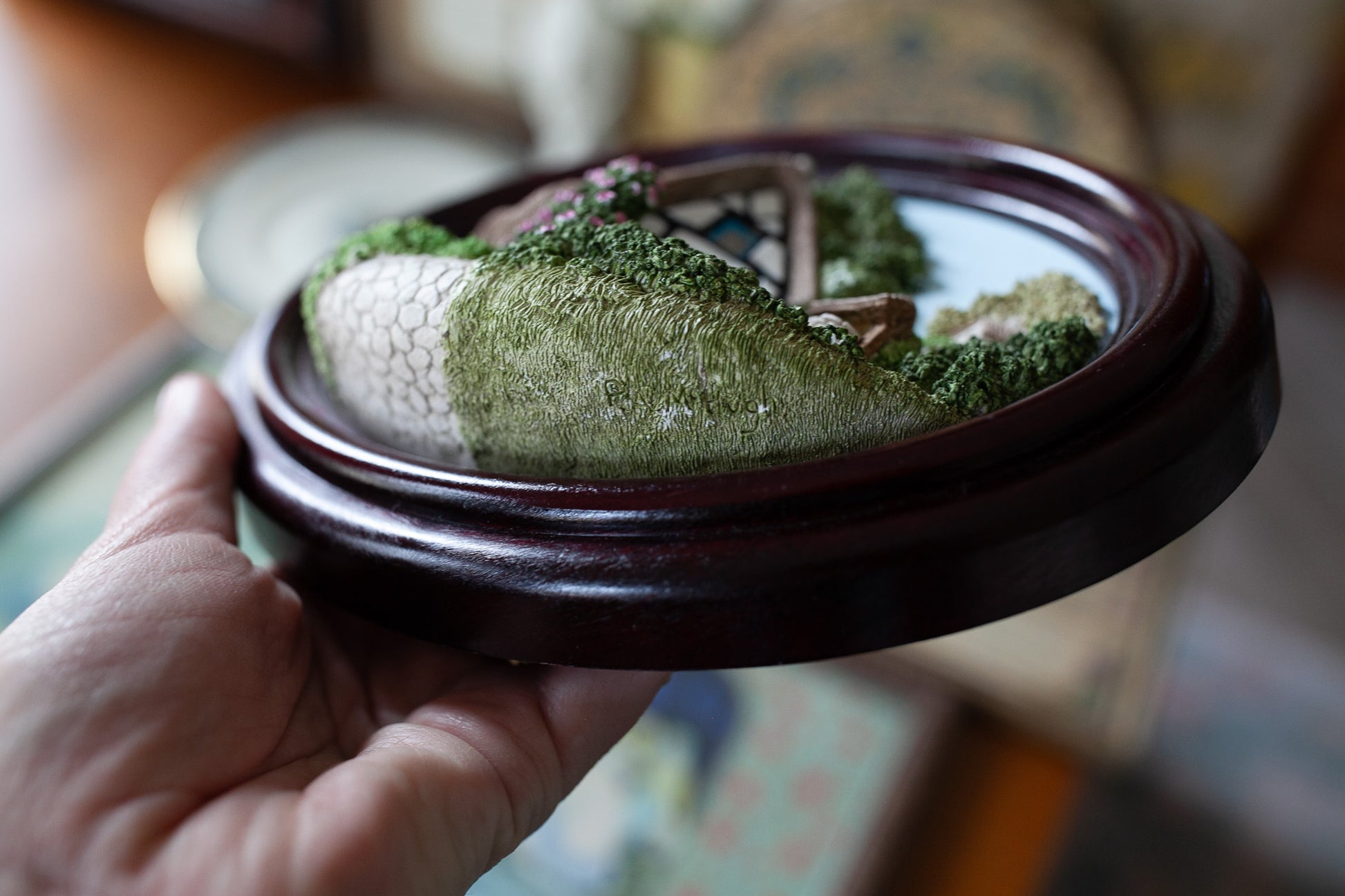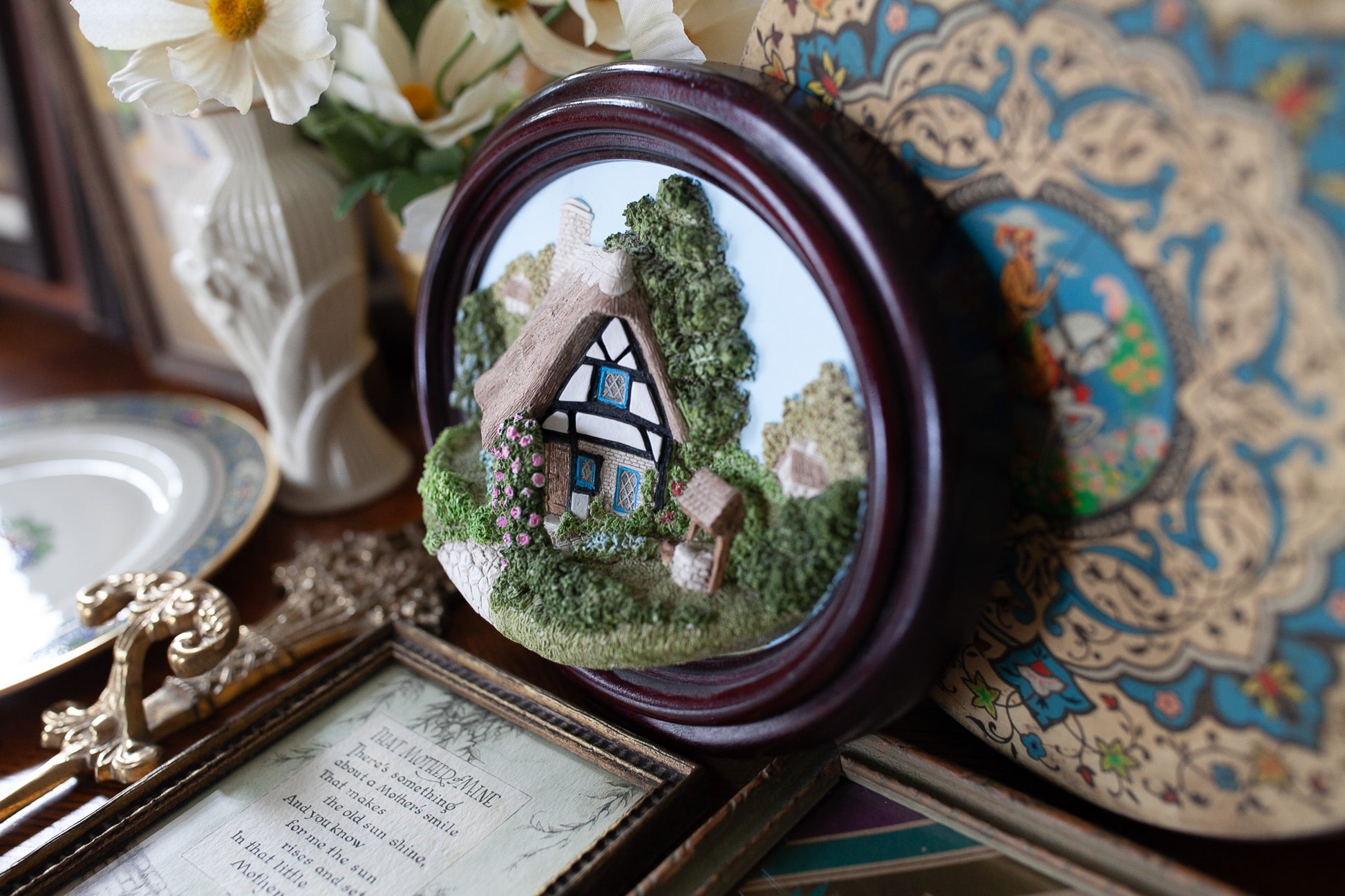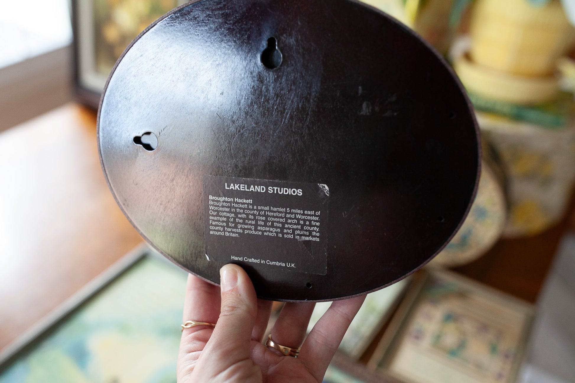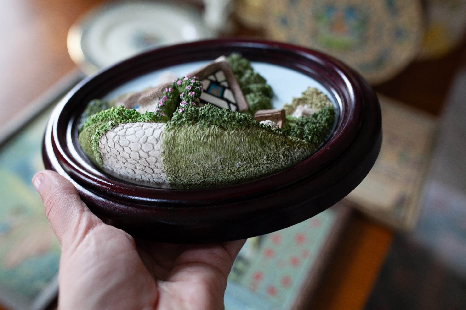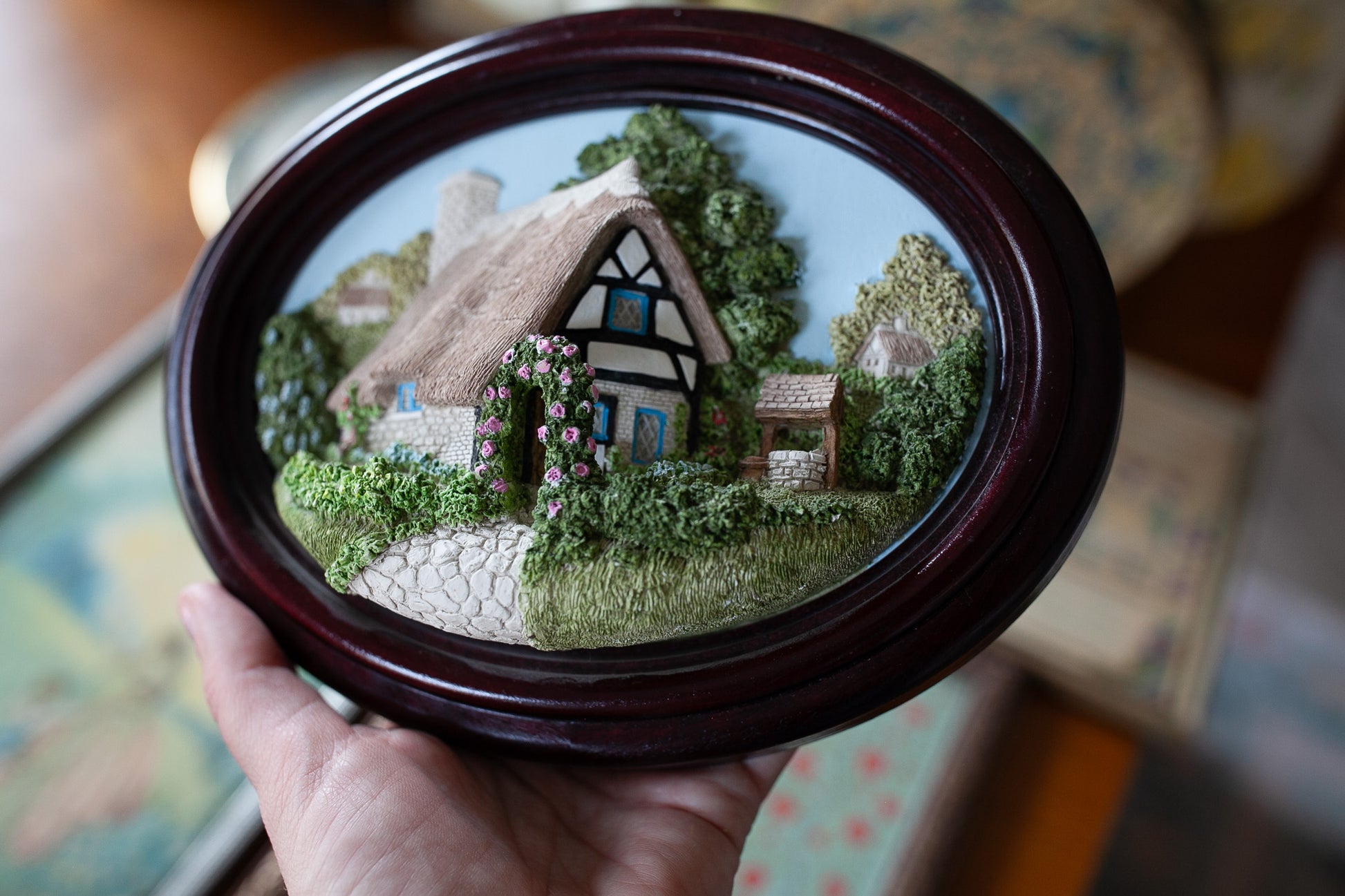 Lakeland Studios 1986 produced this great piece! It is a 3d porcelain house and garden that is a piece of wall art and framed in a oval frame. Is is about 8.25" wide and about 6.5" tall. Weighs about 1.8 lbs. It is in good shape with just a few little white marks at the base the underside of the grass. It says Broughton Hackett 5 miles east of Worcester -hand crafted in Cumbria UK.