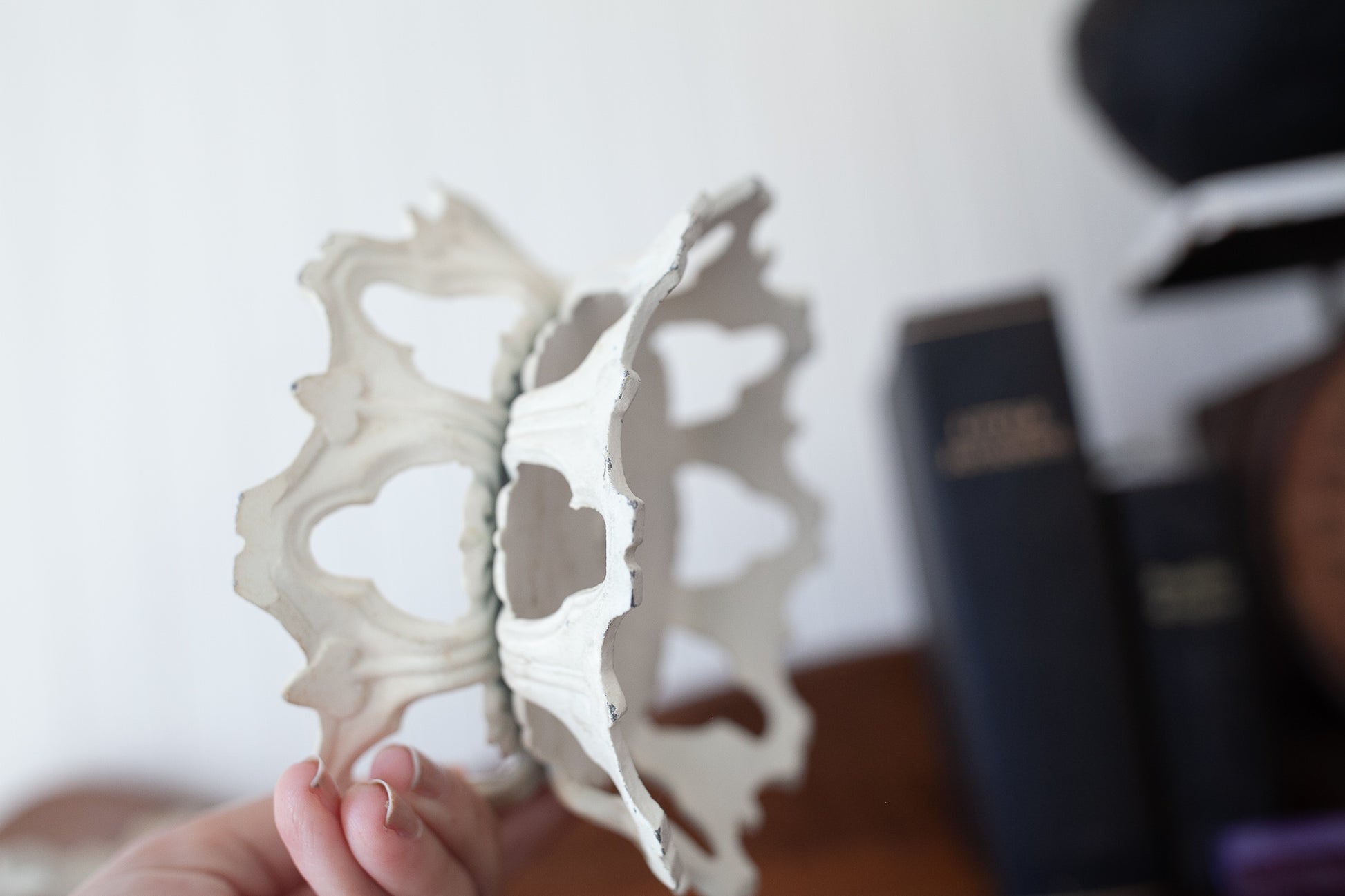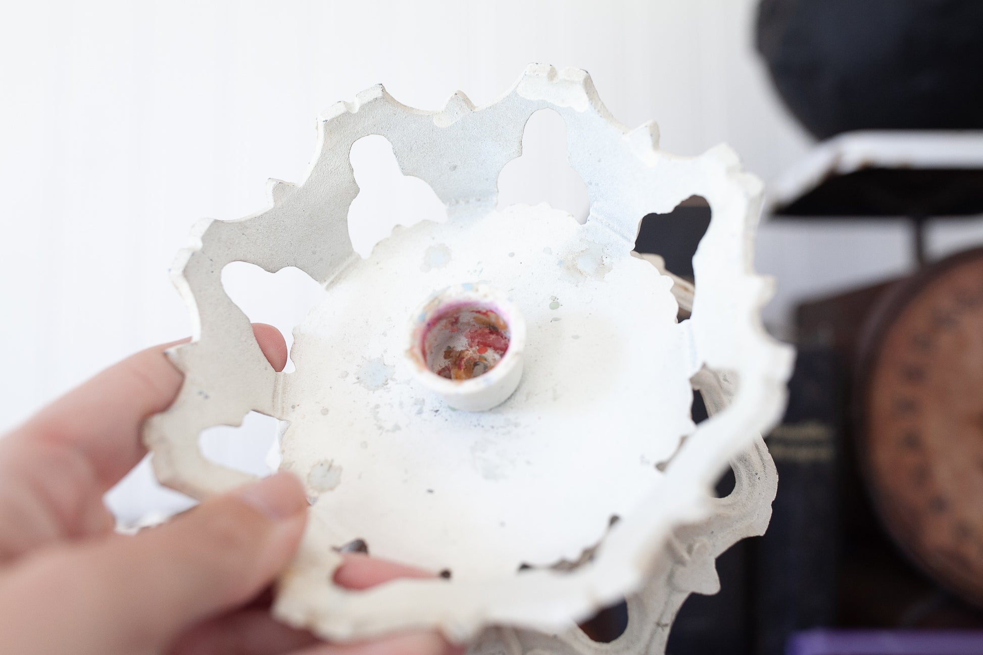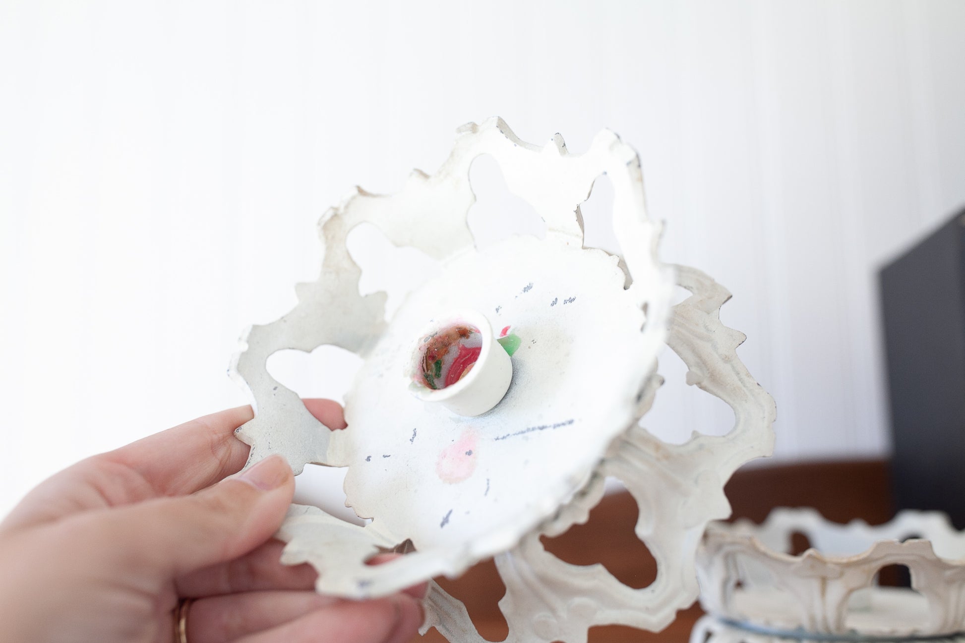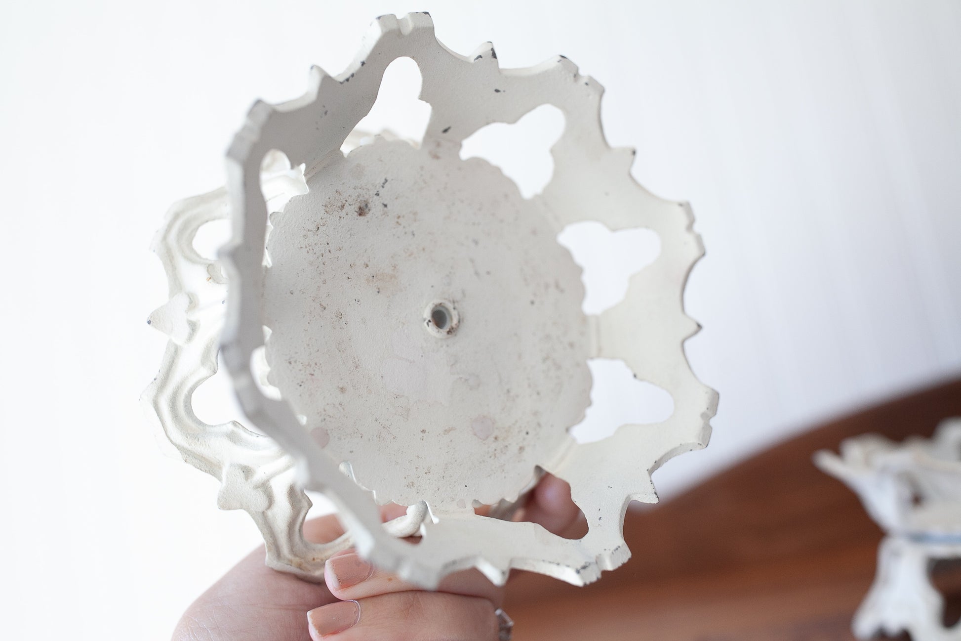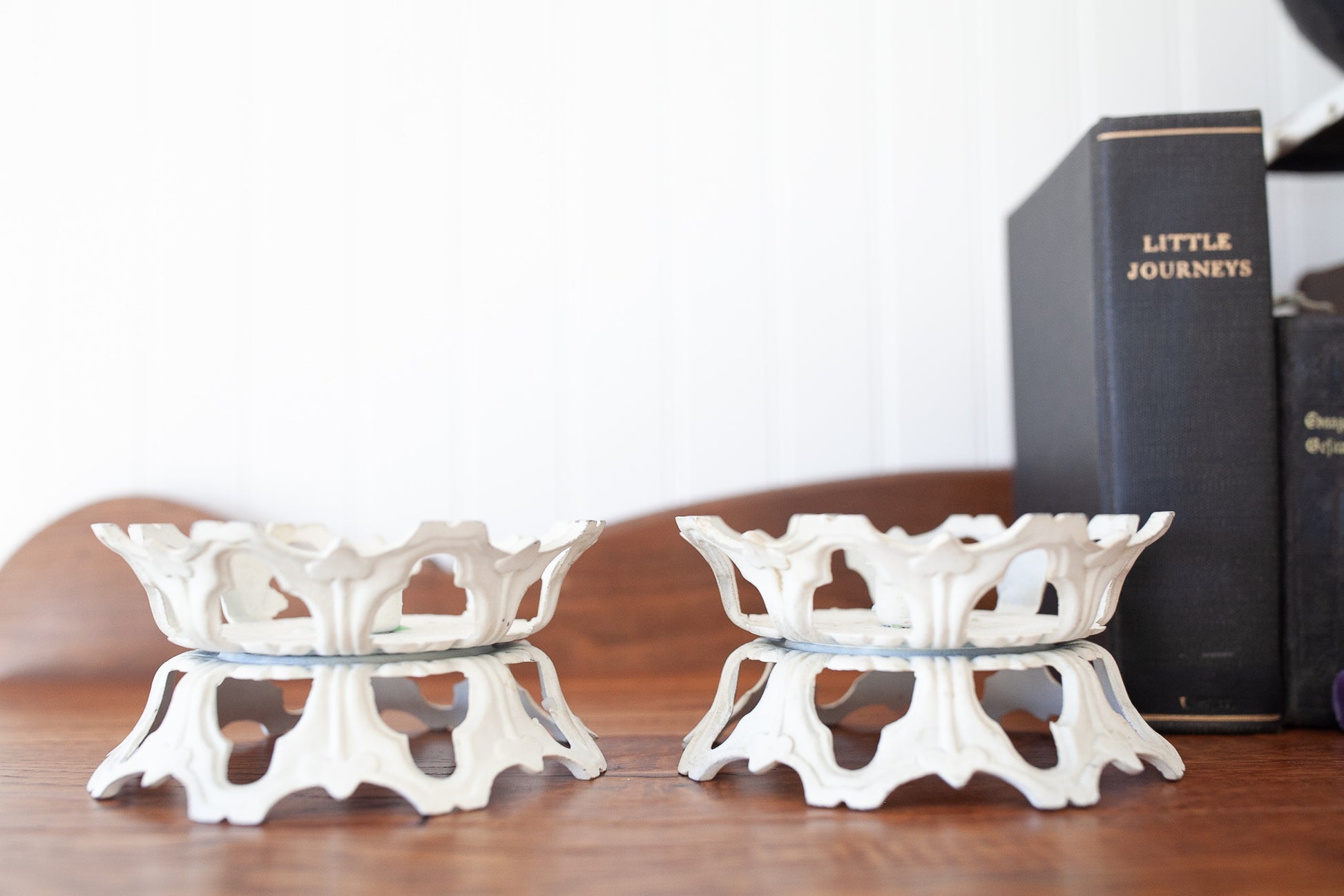 These two iron candle holders are perfect to hold your favorite two taper candles! These candle holders are shabby chic and are iron and painted a creamy white color. They have some wear to them but make really neat decor pieces. There is some residue from past candles. They each measure about 5.5" across and about 2.75" tall each.