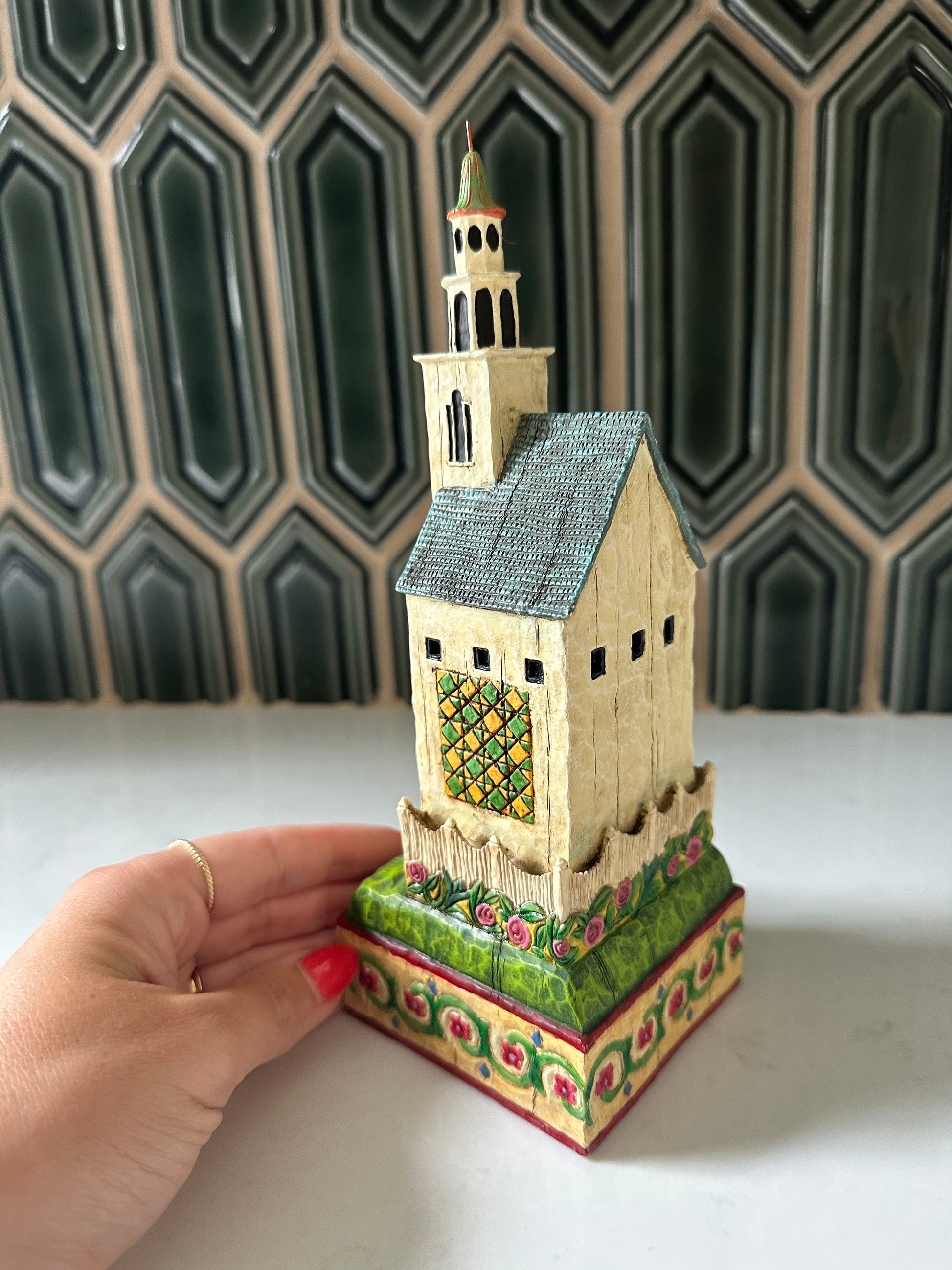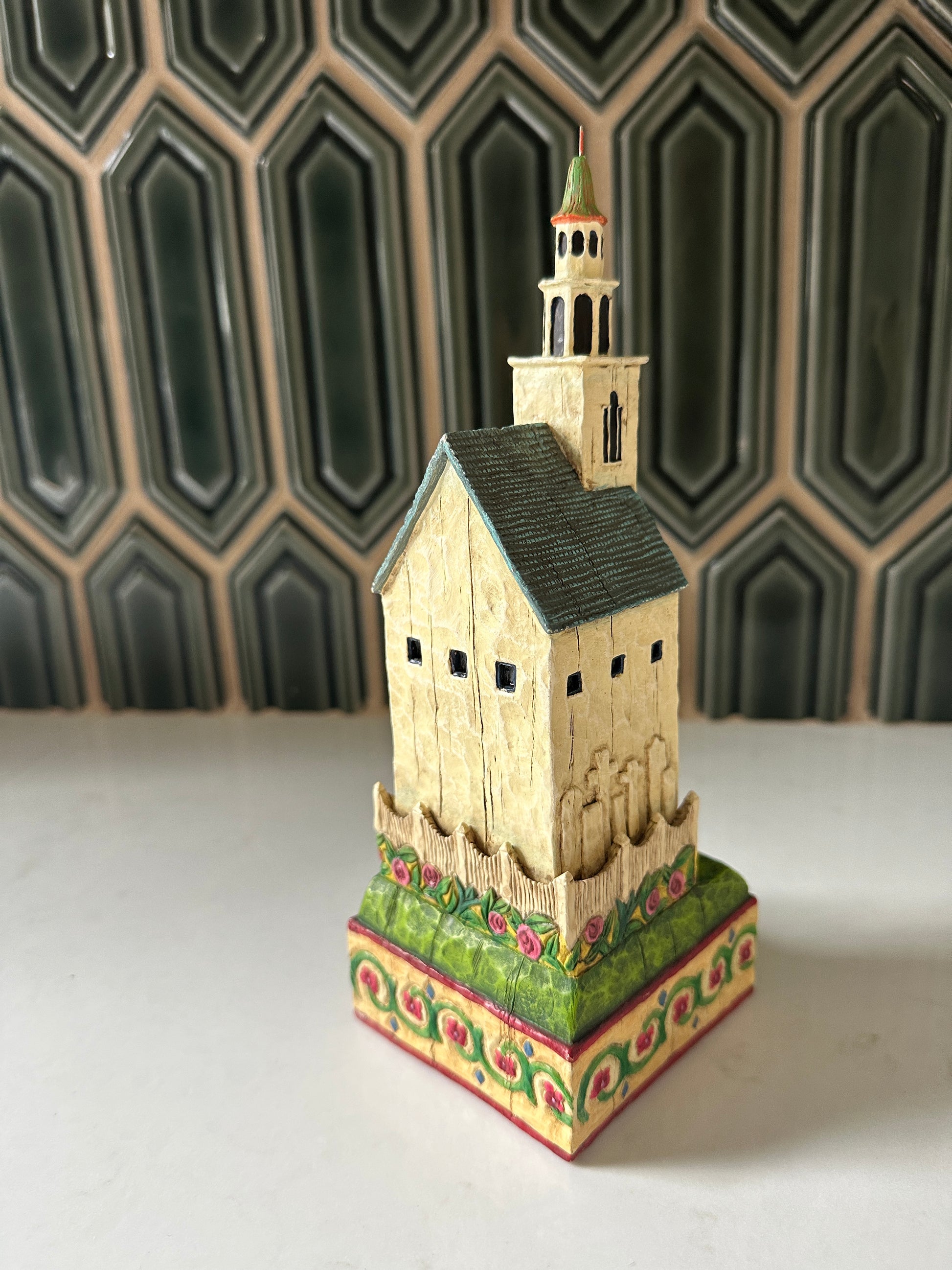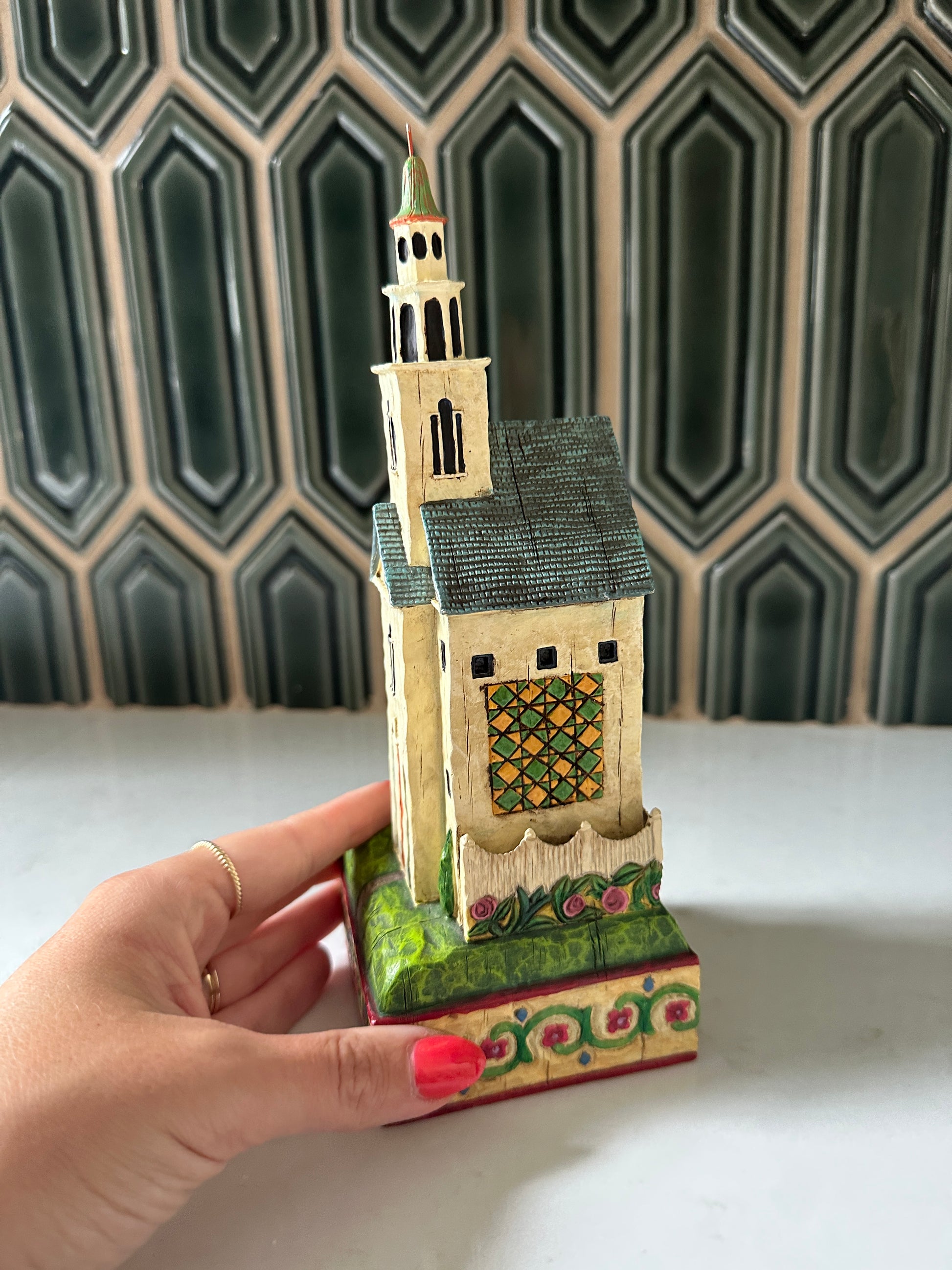 Darling Jim Shore church from 2004- it’s in good condition and stands about 9” tall and 3” wide. It has great details all around! I like the quilt on the one side and the flowers around the base!