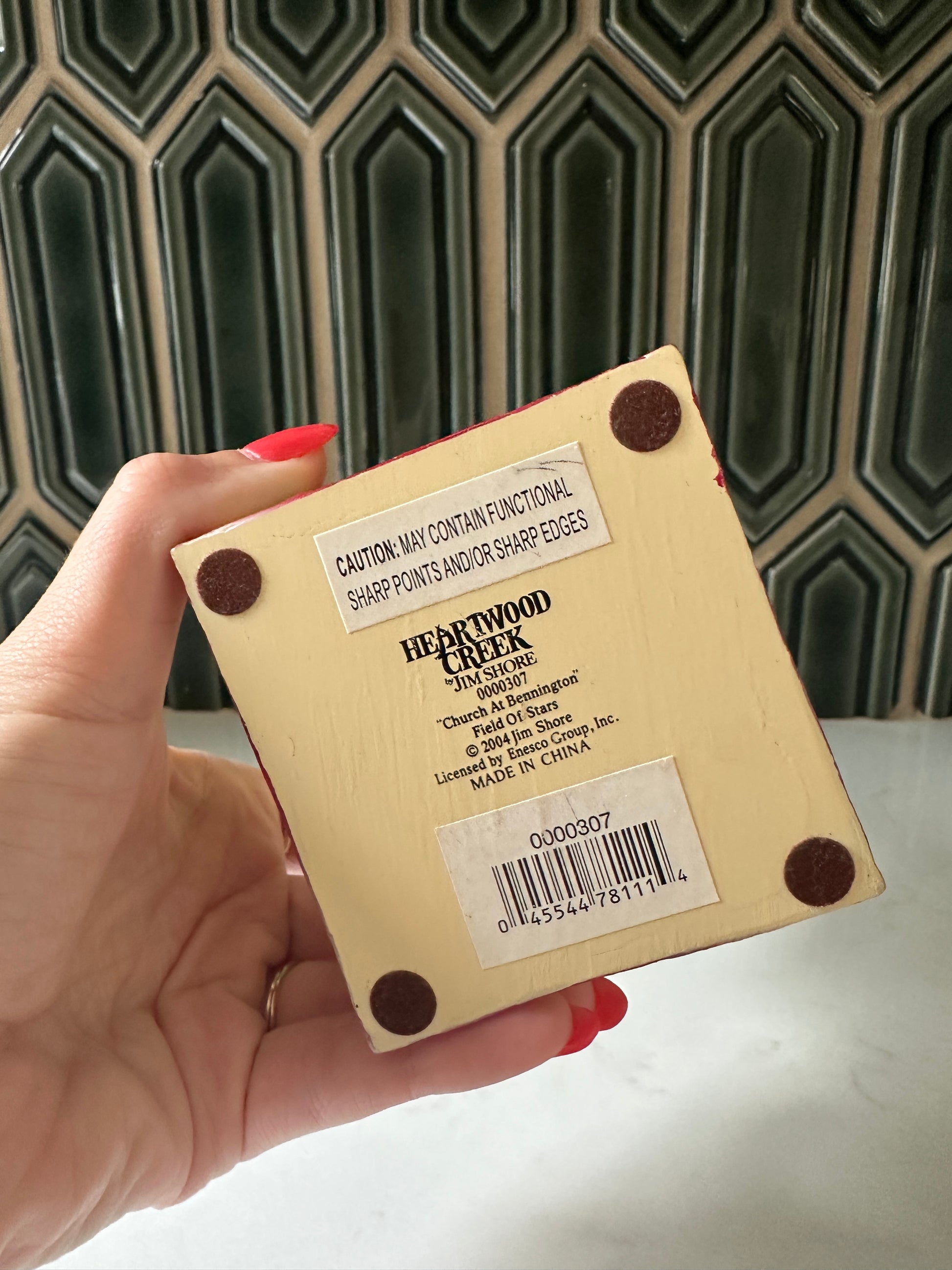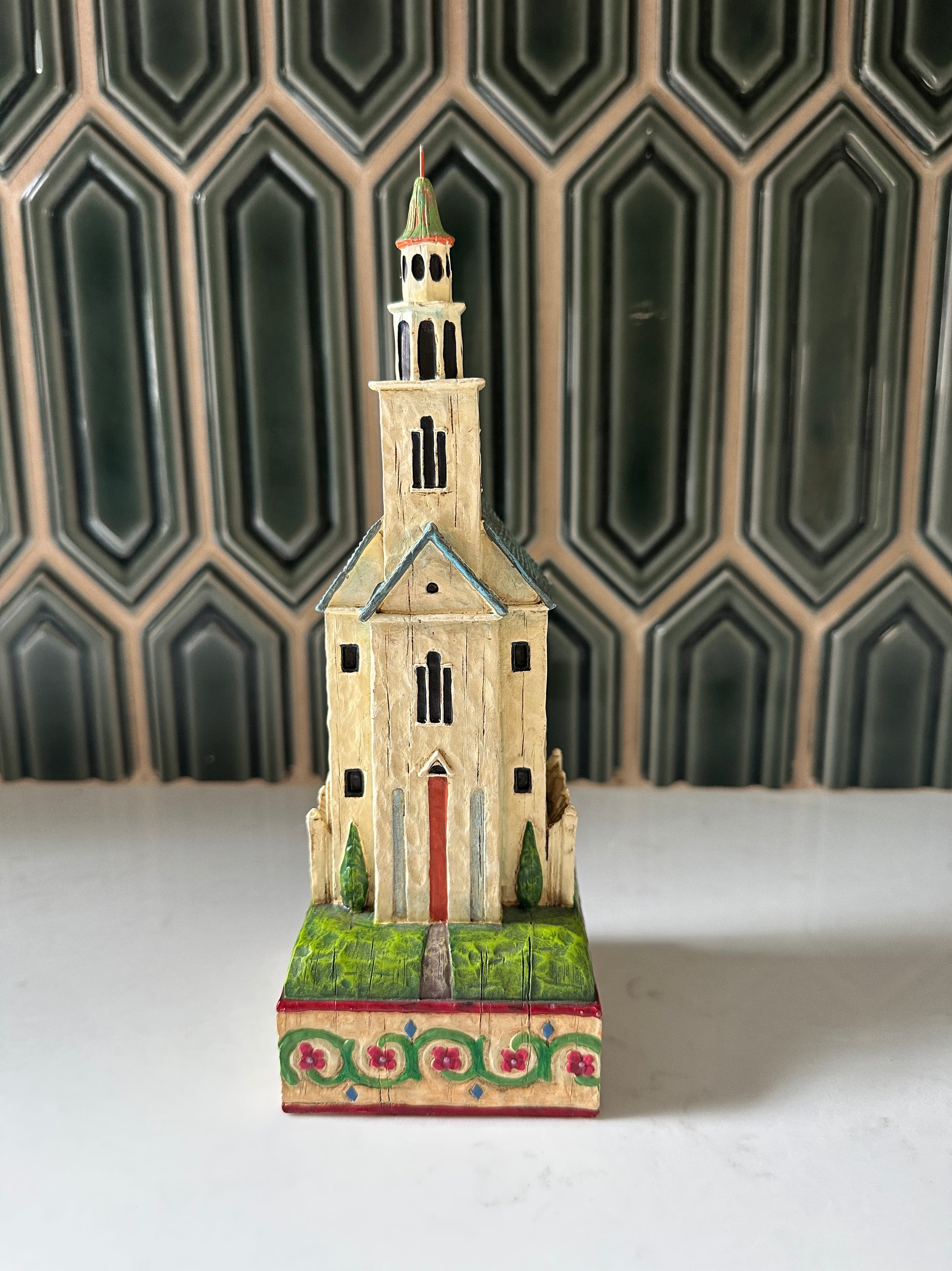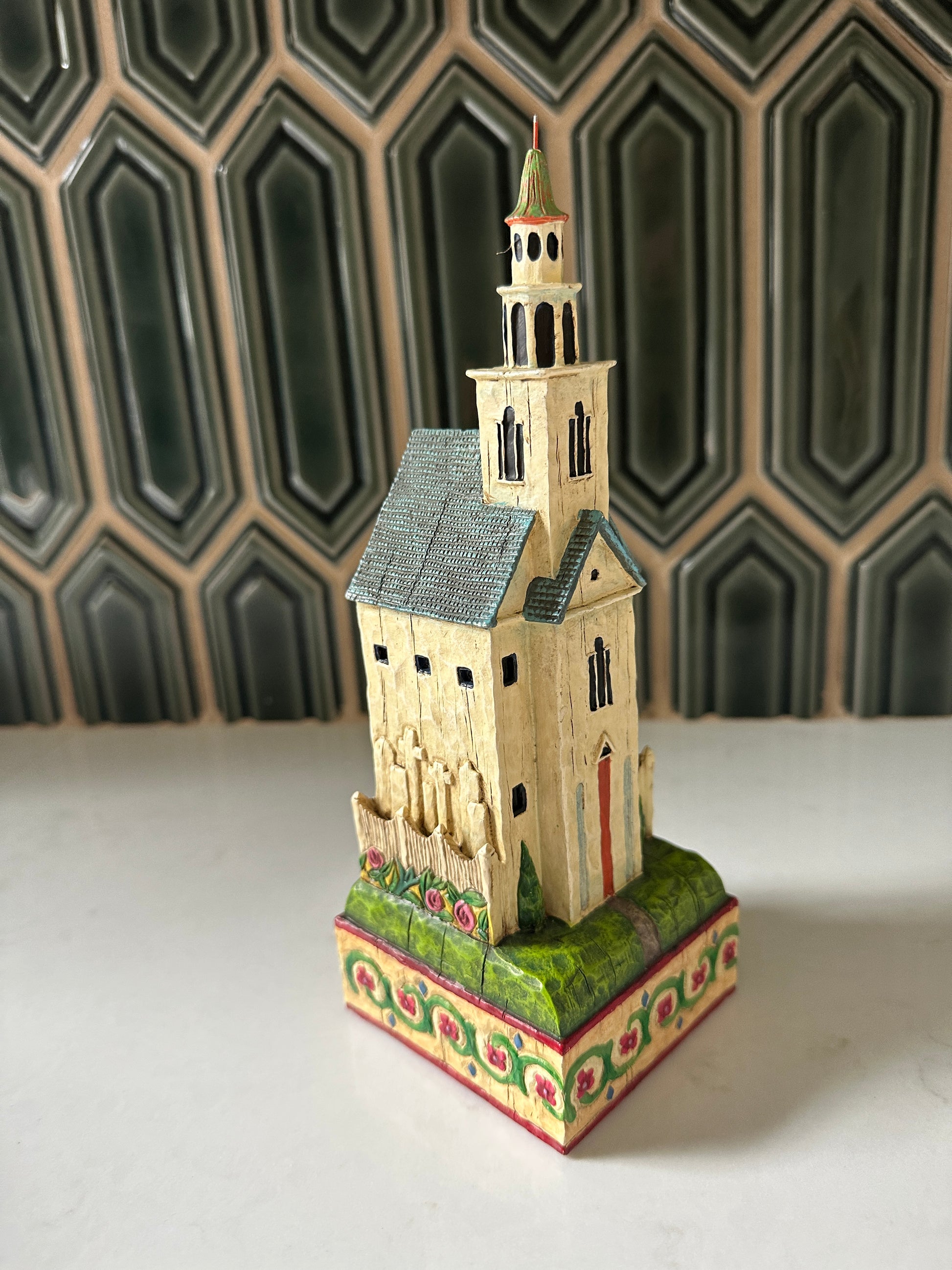 Darling Jim Shore church from 2004- it’s in good condition and stands about 9” tall and 3” wide. It has great details all around! I like the quilt on the one side and the flowers around the base!