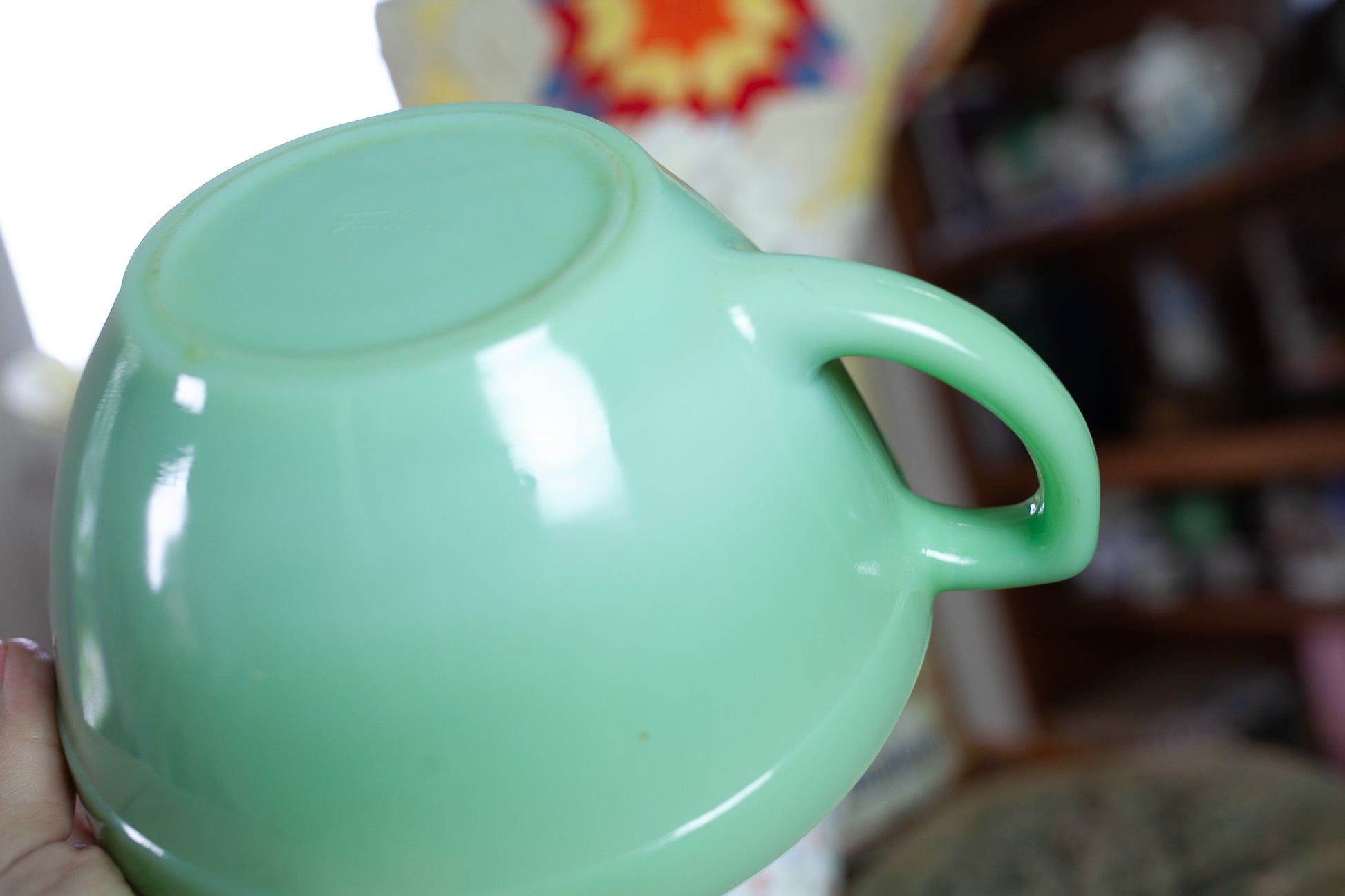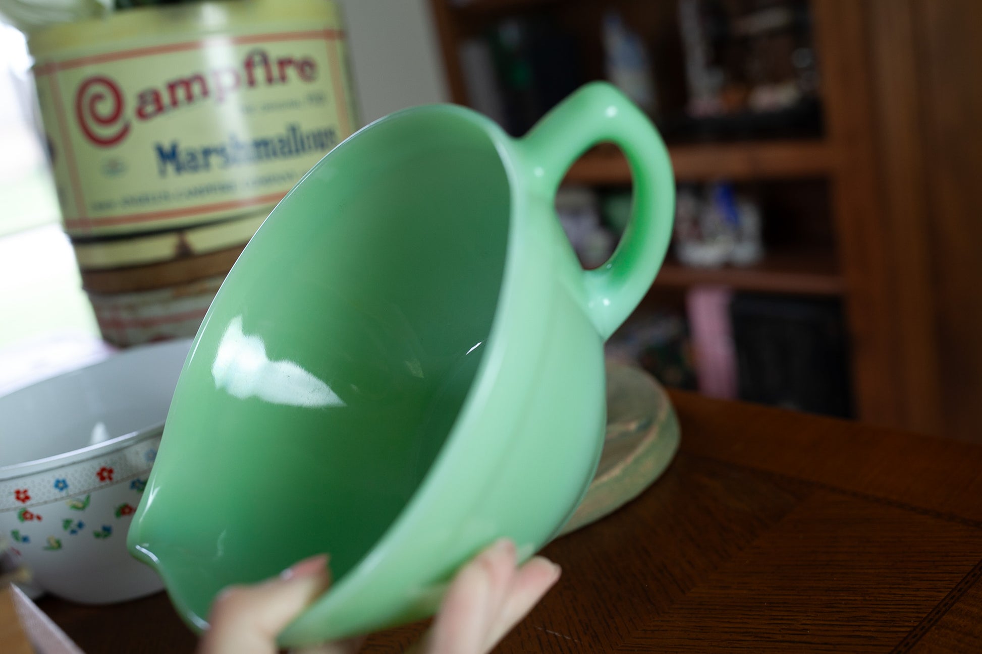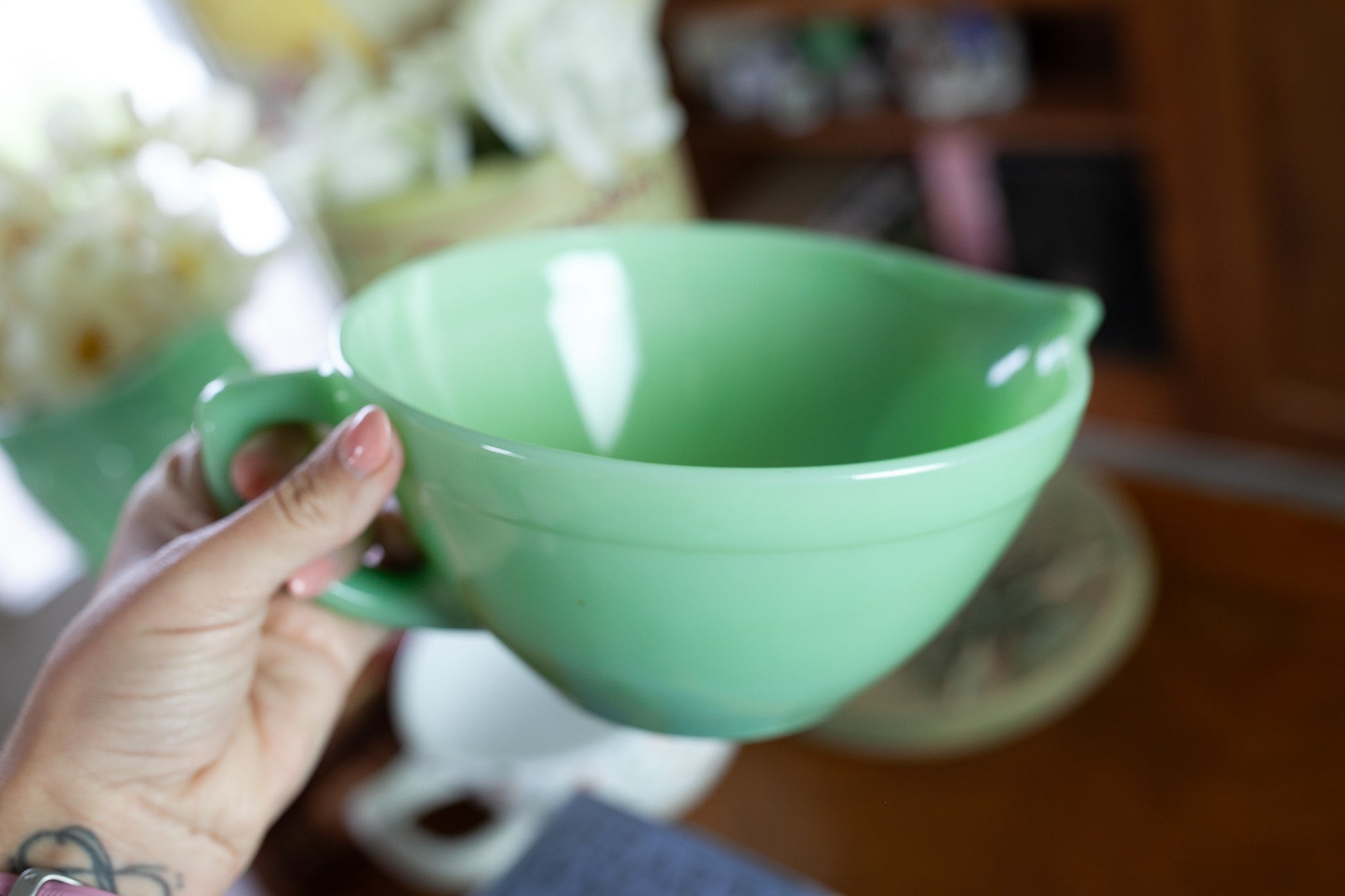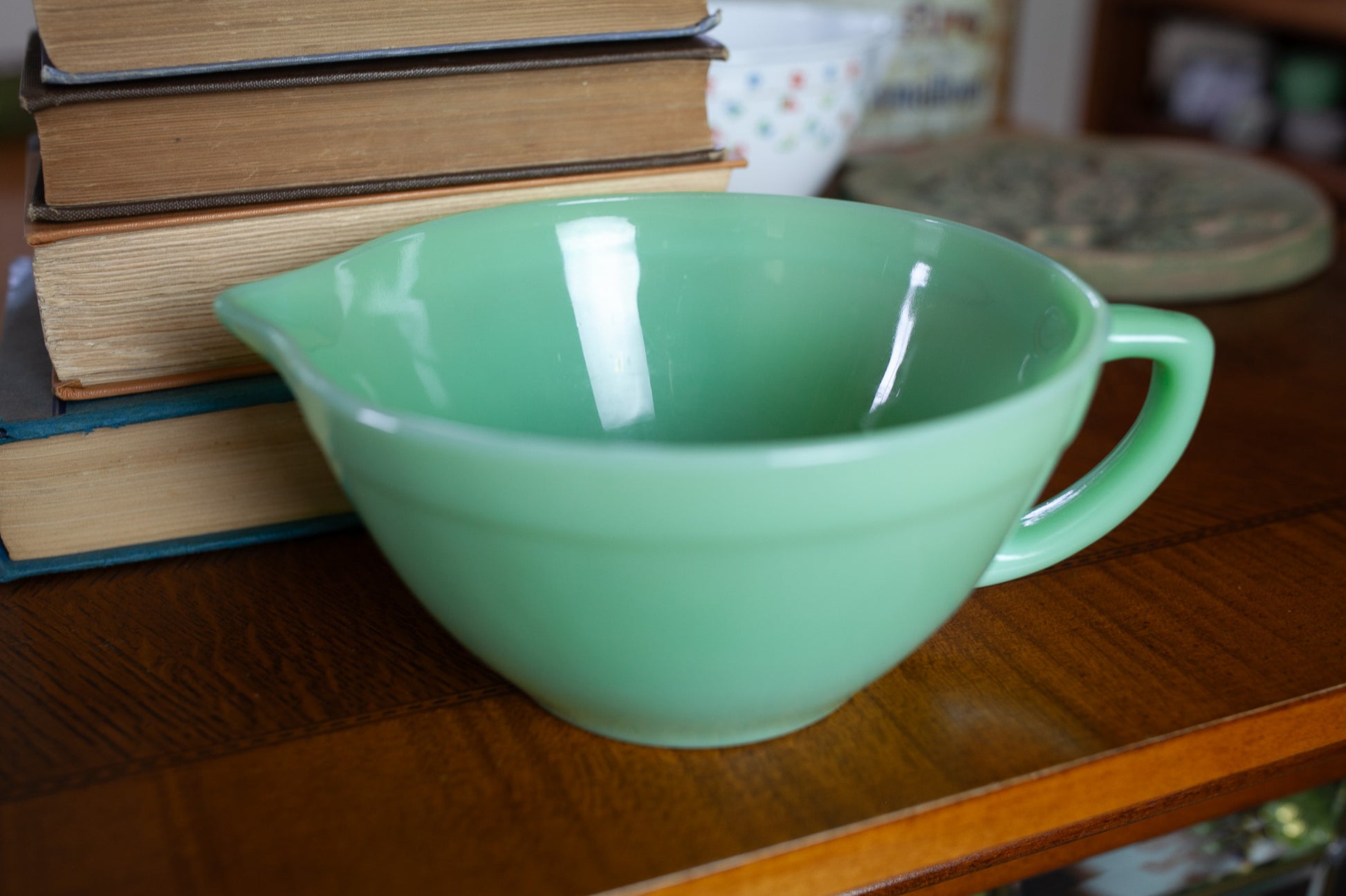 This is a vintage, Jadeite, mixing bowl with a handle and pour spout. It reads on the bottom: Oven Fire King Ware, made in the USA. There are some marks and minor flaws on the piece from age and normal use. Overall no chipping or cracks. Good shine to the piece still.