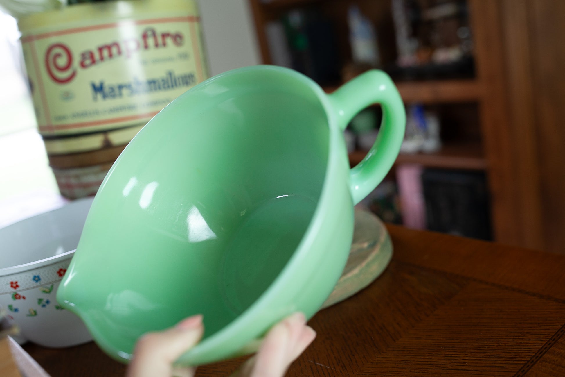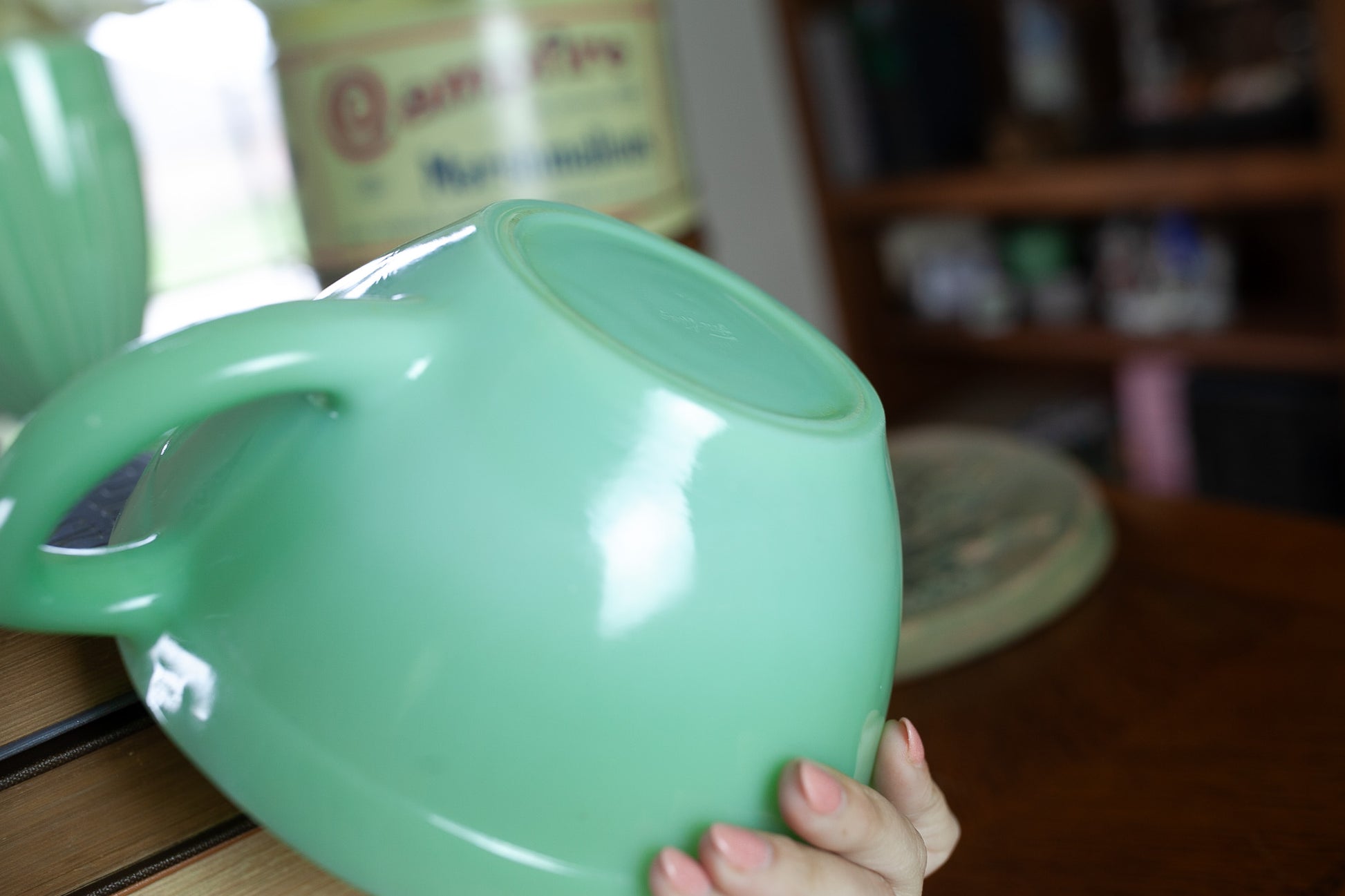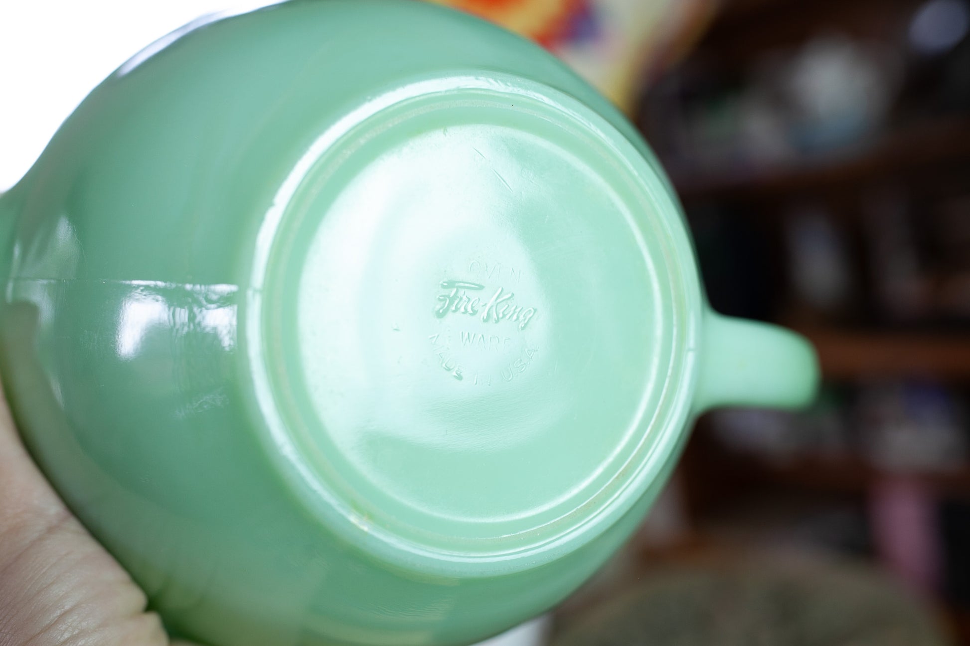 This is a vintage, Jadeite, mixing bowl with a handle and pour spout. It reads on the bottom: Oven Fire King Ware, made in the USA. There are some marks and minor flaws on the piece from age and normal use. Overall no chipping or cracks. Good shine to the piece still.