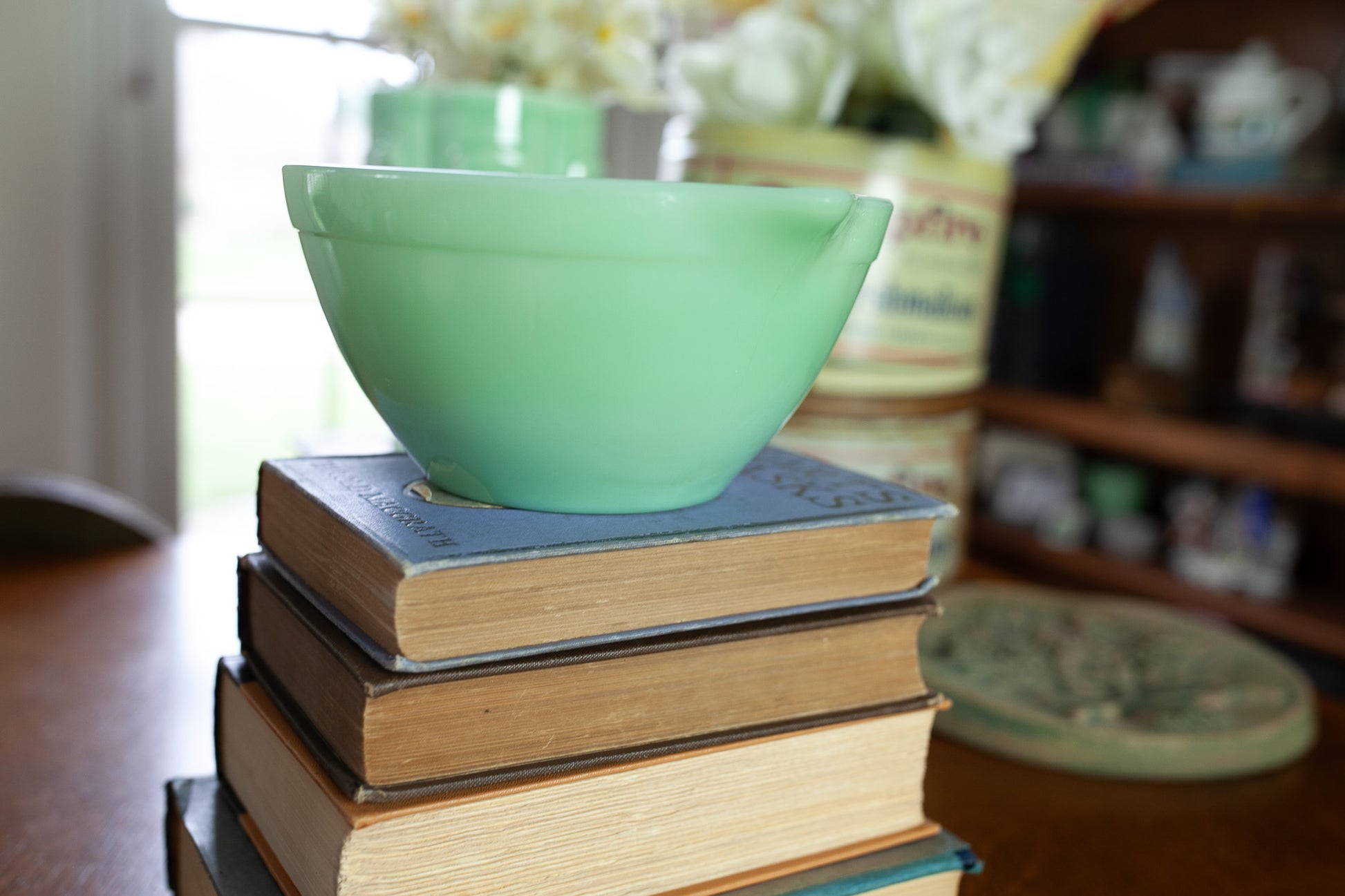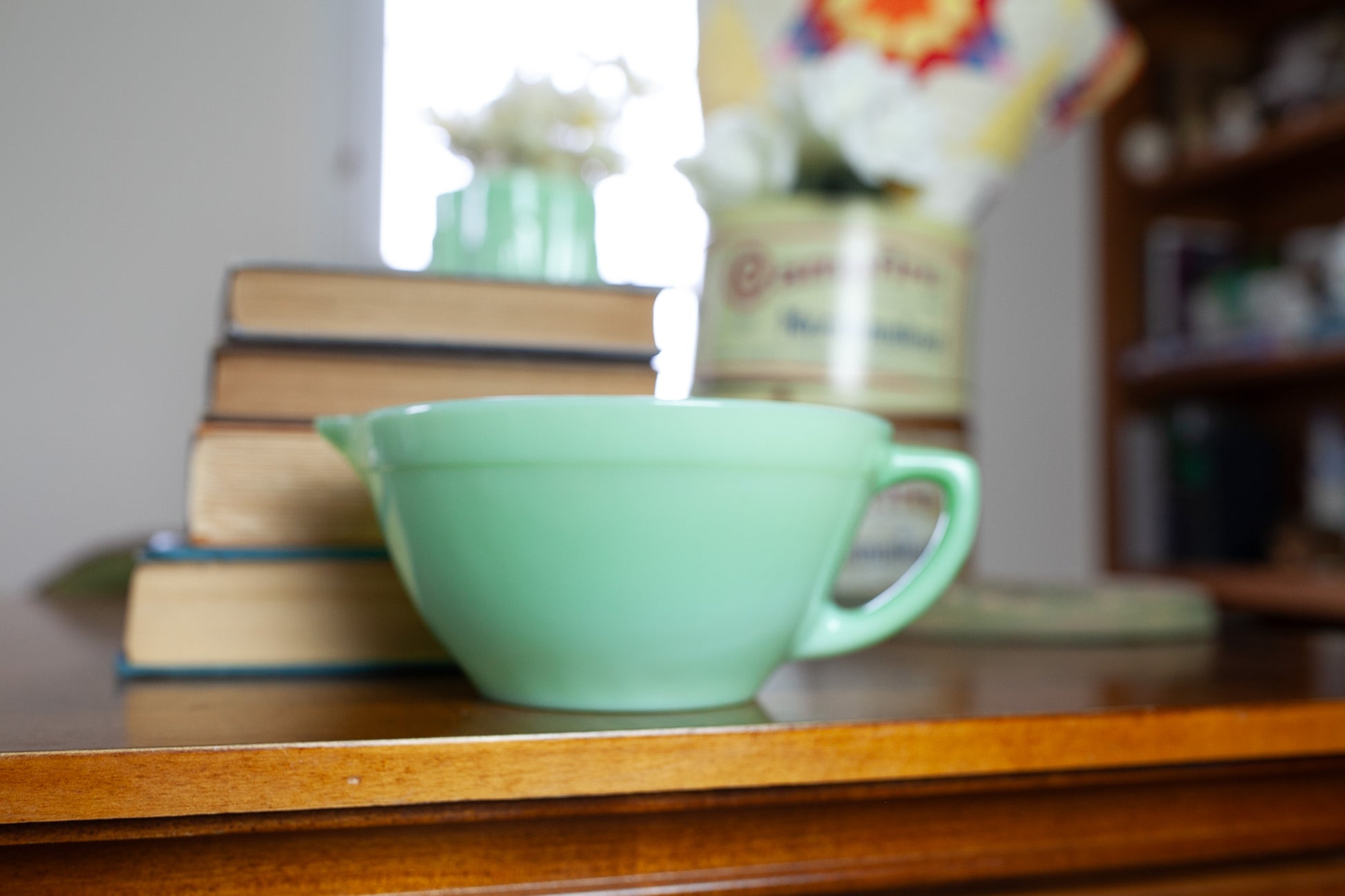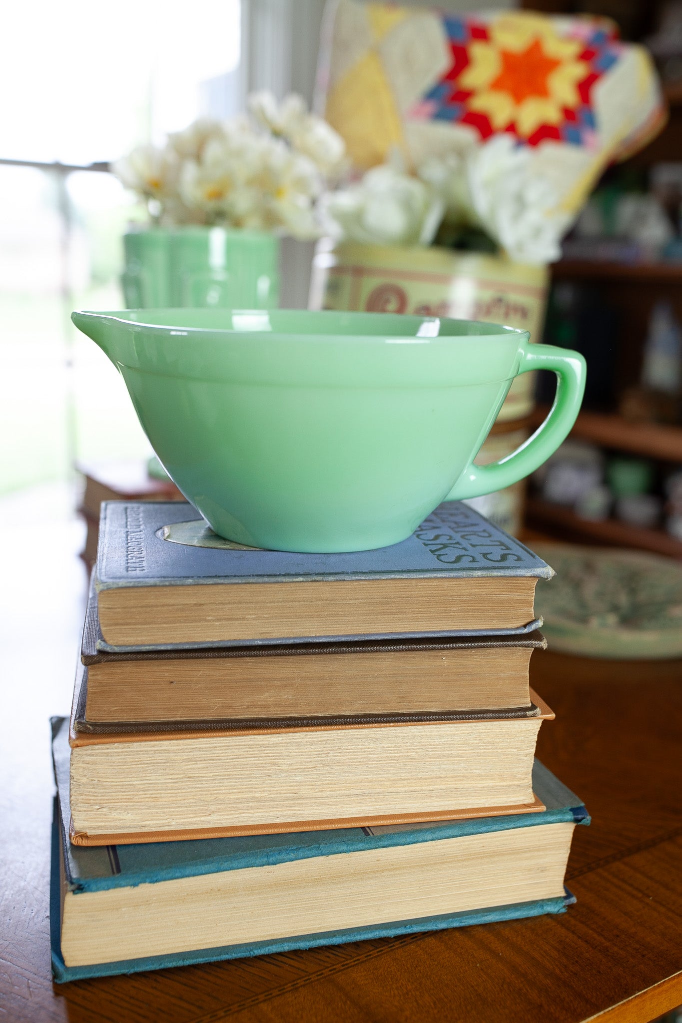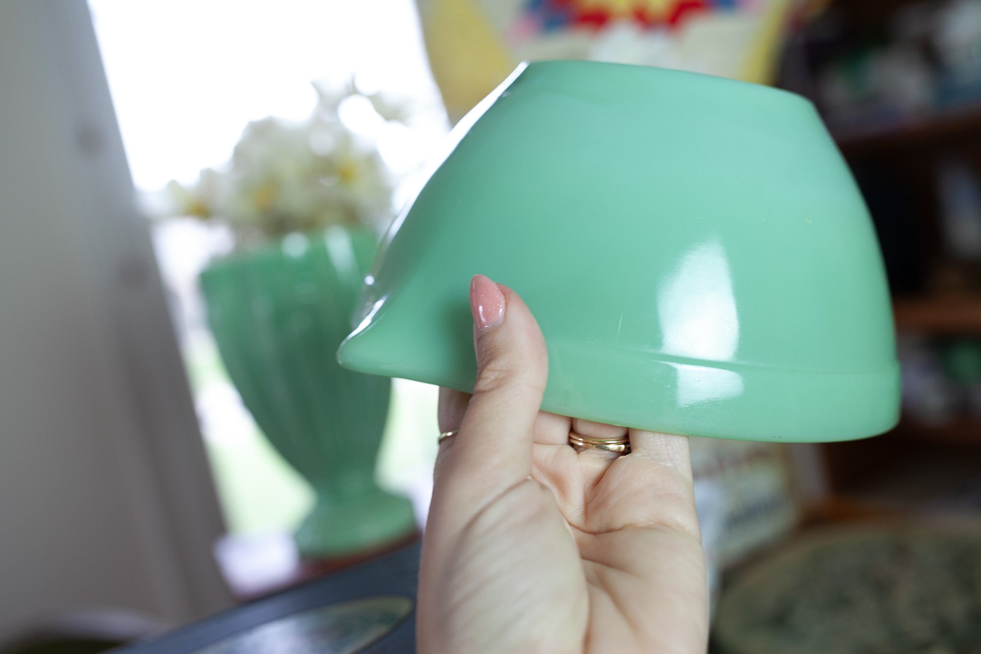 This is a vintage, Jadeite, mixing bowl with a handle and pour spout. It reads on the bottom: Oven Fire King Ware, made in the USA. There are some marks and minor flaws on the piece from age and normal use. Overall no chipping or cracks. Good shine to the piece still.