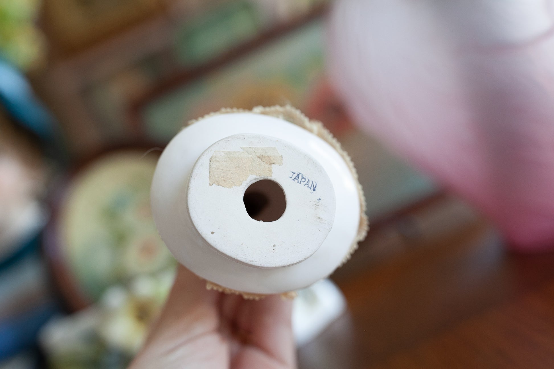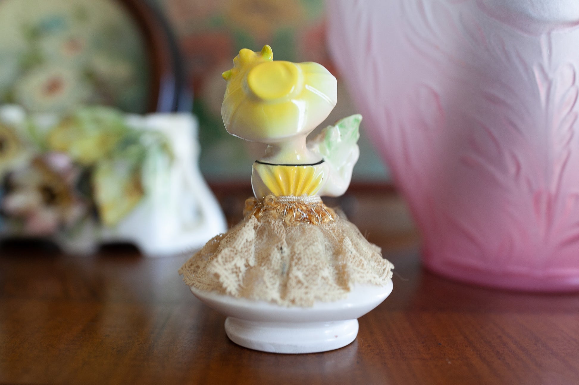 This little lady has the sweetest little face and is holding a pretty bunch of flowers! She has a lace skirt on and has a big yellow bonnet around her head. The bonnet has polkadots on it and is so sweet. It is about 3.5" tall. Marked Japan on the base.