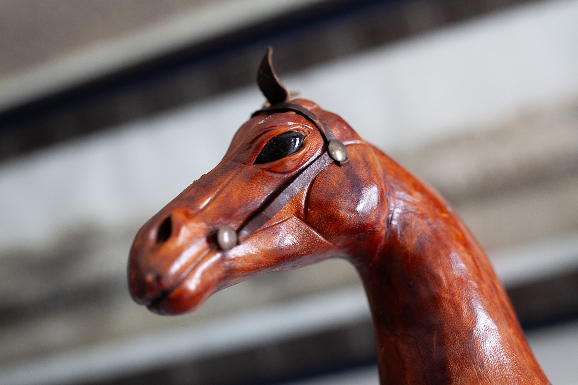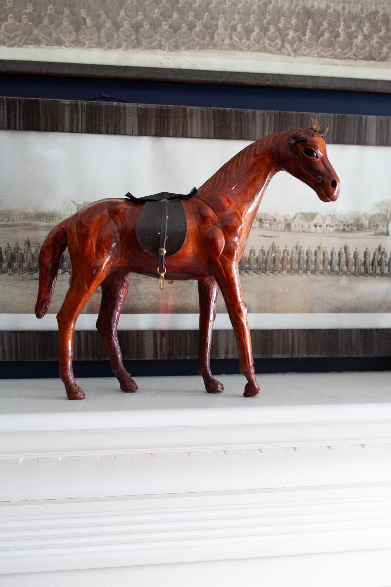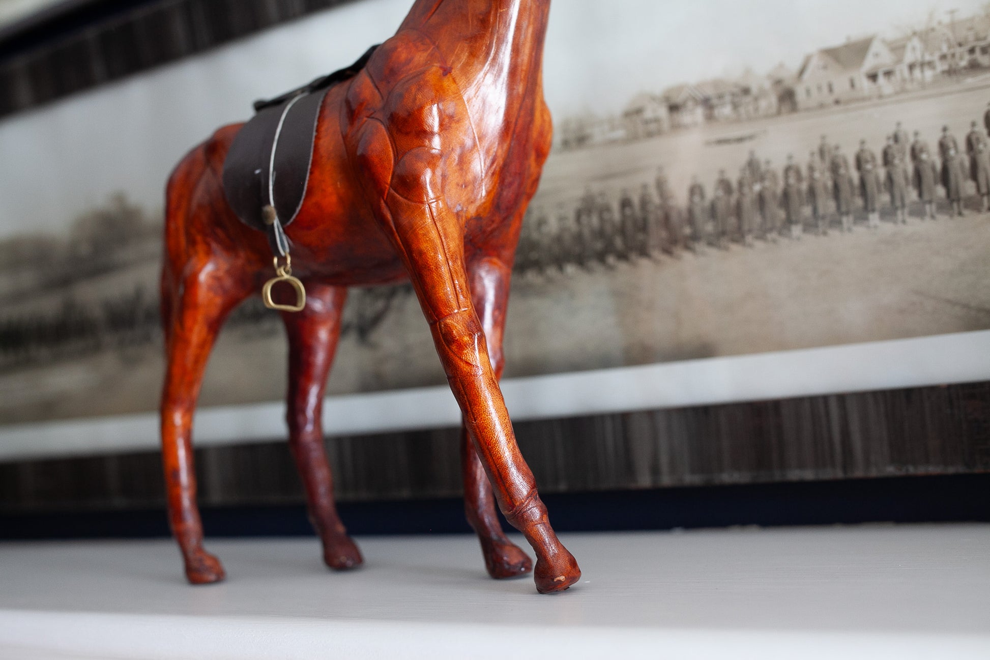 Vintage Leather Horse - Brown. Vintage model horse in light brown with dark brown saddle. No longer has his bridle- just a few little pieces remain of the bridle on his head. Eyes are glass.