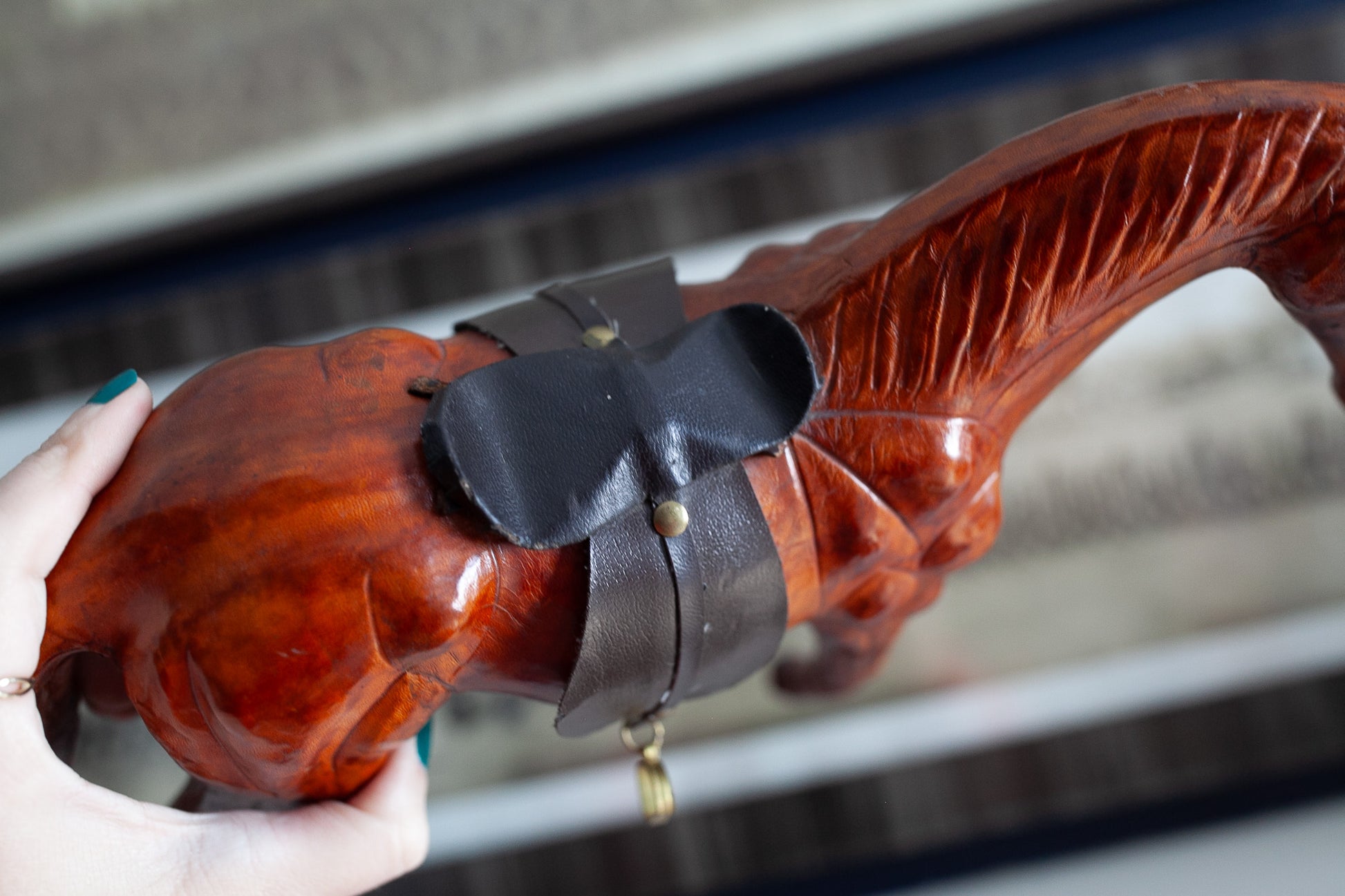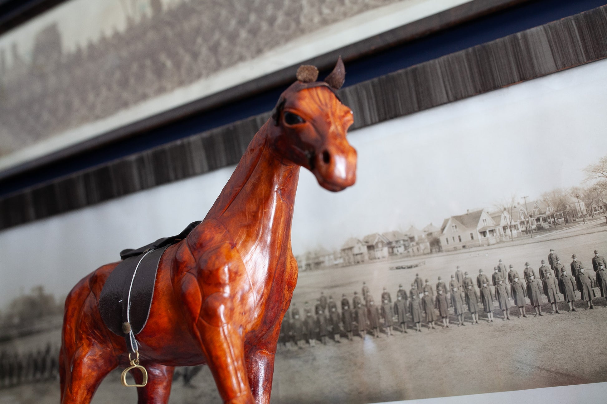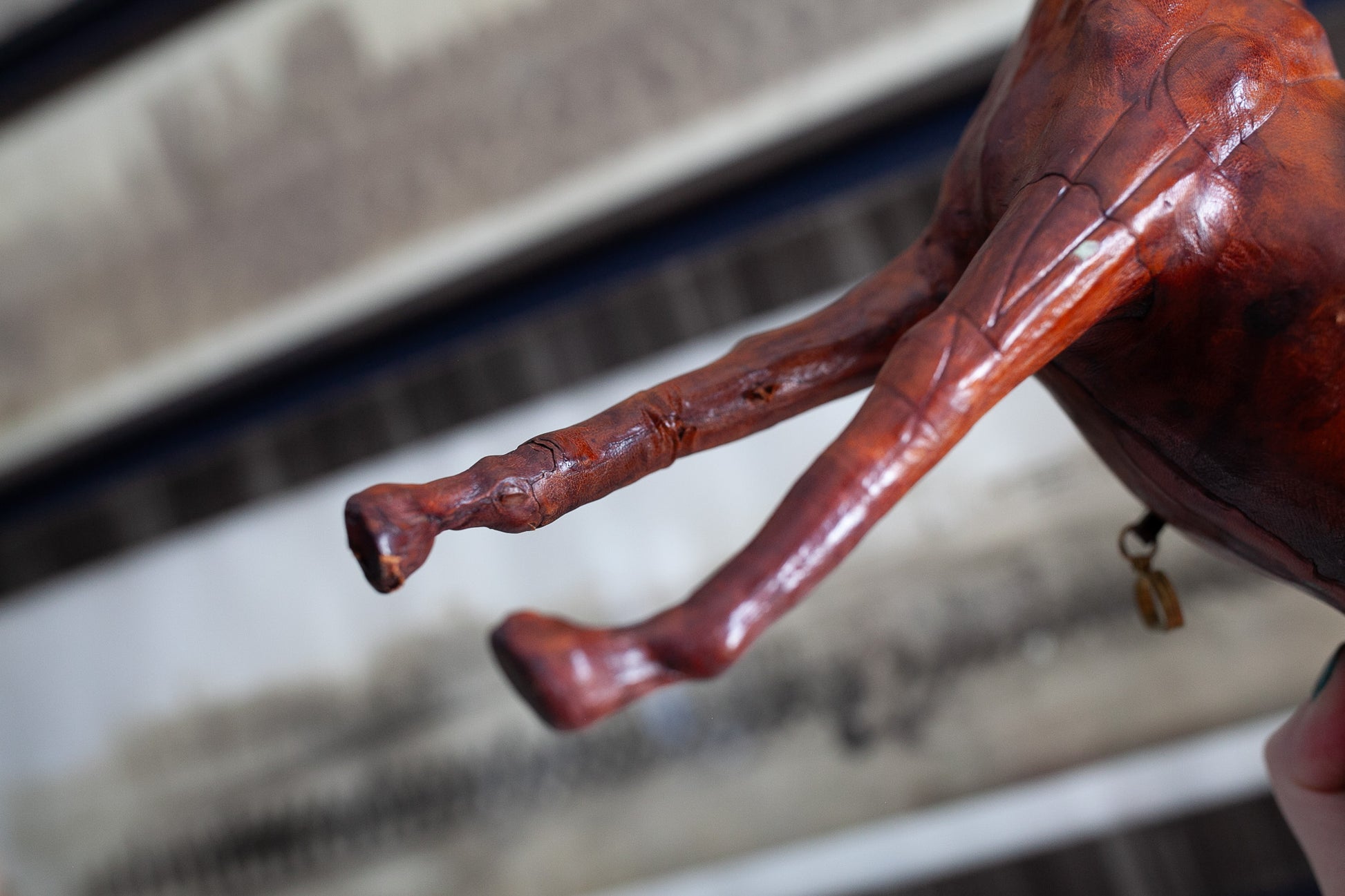 Vintage Leather Horse - Brown. Vintage model horse in light brown with dark brown saddle. No longer has his bridle- just a few little pieces remain of the bridle on his head. Eyes are glass.
